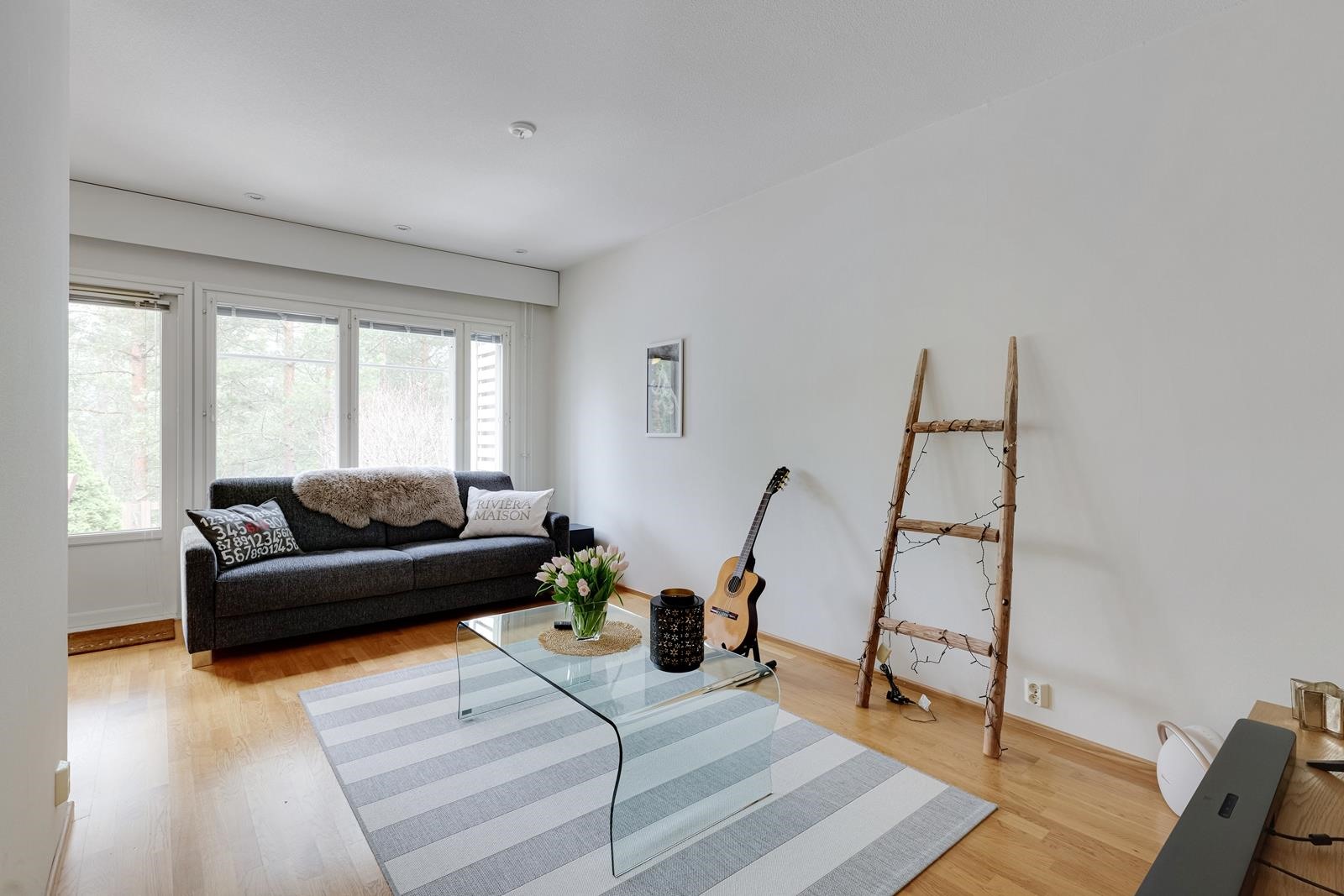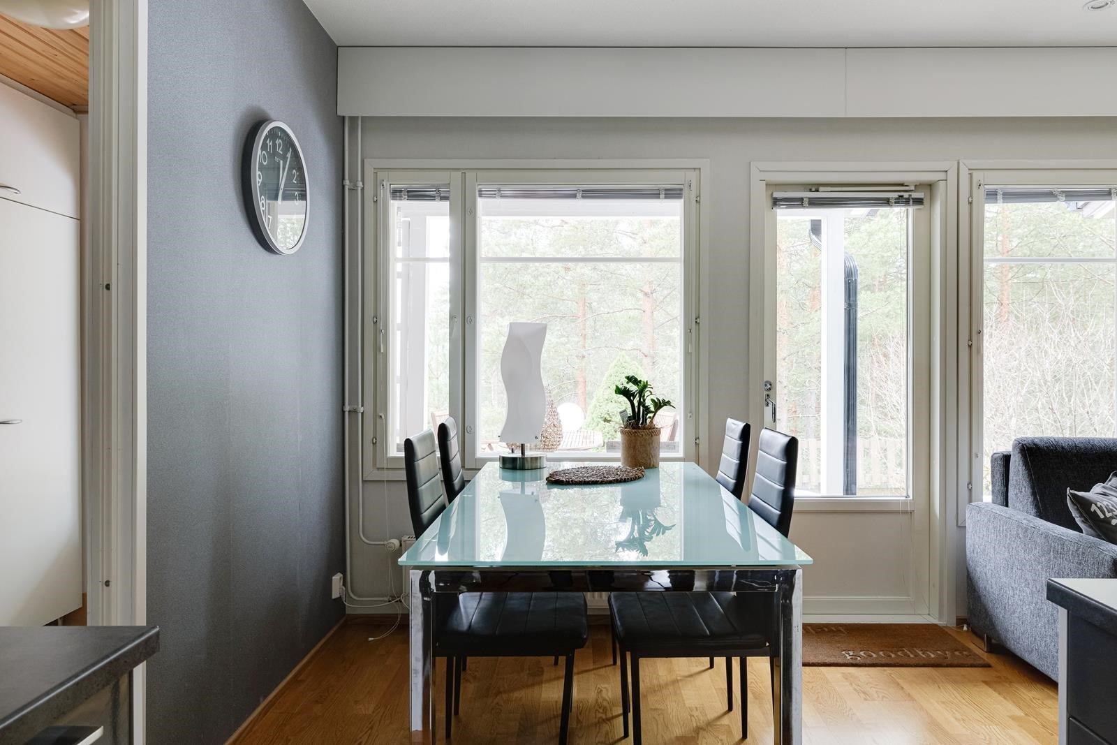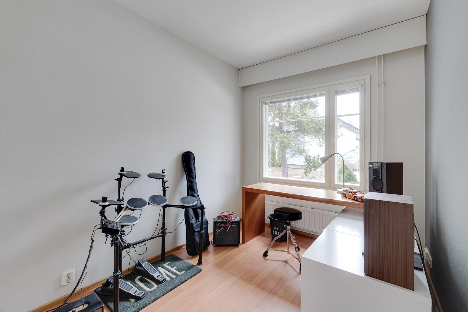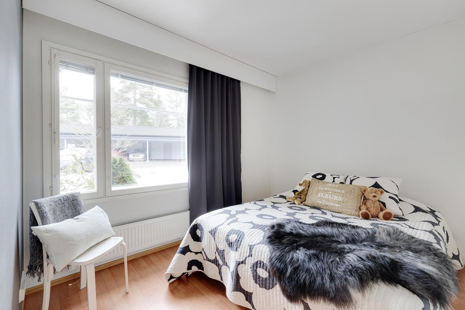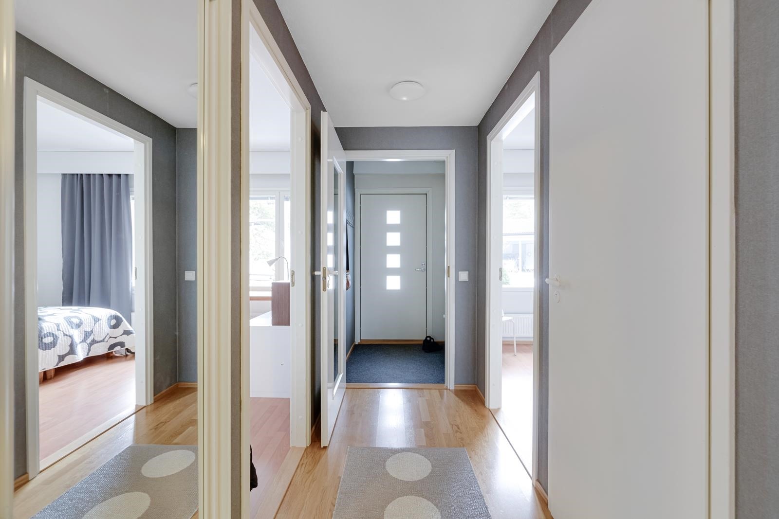 Keittiö: tapettia, parkettia. Olohuone: tapettia, parkettia. Makuuhuone 1: maalia, laminaattia. Makuuhuone 2: maalia, laminaattia. Kodinhoitohuone: maalia, muovimatto. Sauna: paneelia, laattaa. Kylpyhuone: kaakelia, laattaa. Eteinen: tapettia, parkettia. Wc: muovitapetti, laattaa.
