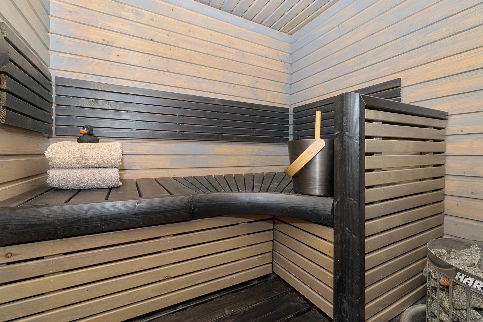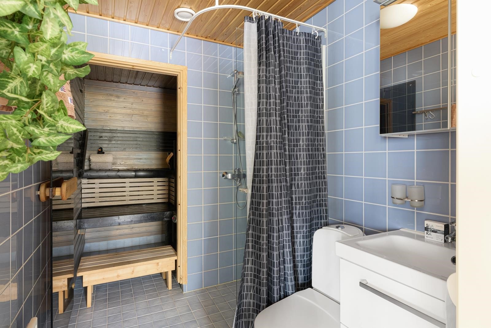 - Sauna, sähkökiuas 2020, kylpyhuone, erillinen wc /toinen kph yhteydessä, suihku, suihkuseinä, peilikaappi, pesukoneliitäntä, lattialämmitys kph ja wc sähköinen lattialämmitys, kiinteät valaisimet.