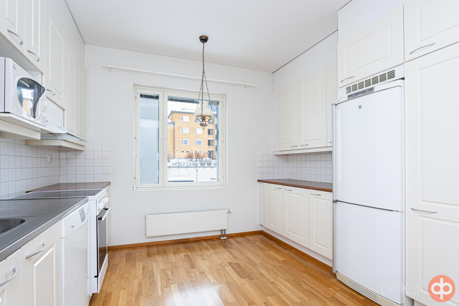 - Jääkaappipakastin, keraaminen liesi, liesituuletin, astianpesukone, kaapistot, kiinteät valaisimet.
