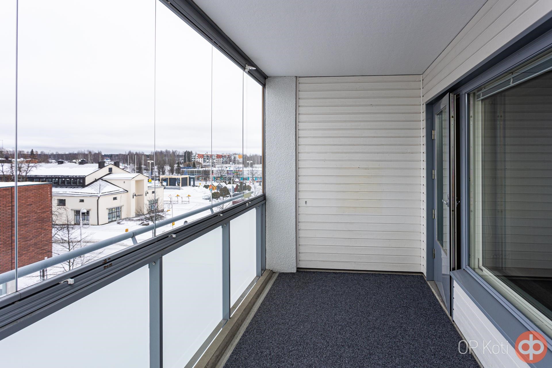 Olohuoneesta käynti tilavalle parvekkeelle, joka tarjoaa yhden lisähuoneen varhaisesta keväästä myöhäiseen syksyyn ja pysyy lasituksen ansiosta viihtyisänä säällä kuin säällä. Lämmön talteenotolla varustettu huoneistokohtainen ilmanvaihto pitää sisäilman miellyttävänä. Kylpyhuoneessa on paikka pesutornille ja oma sauna lämpenee silloin kun haluat.