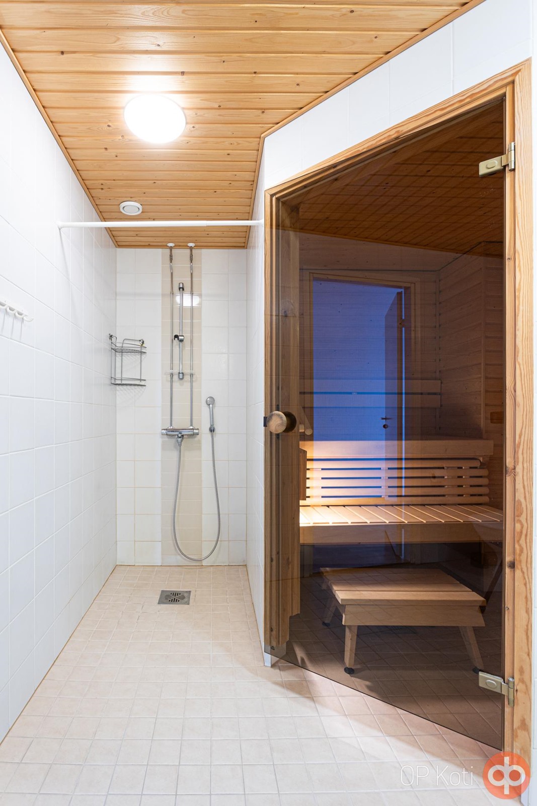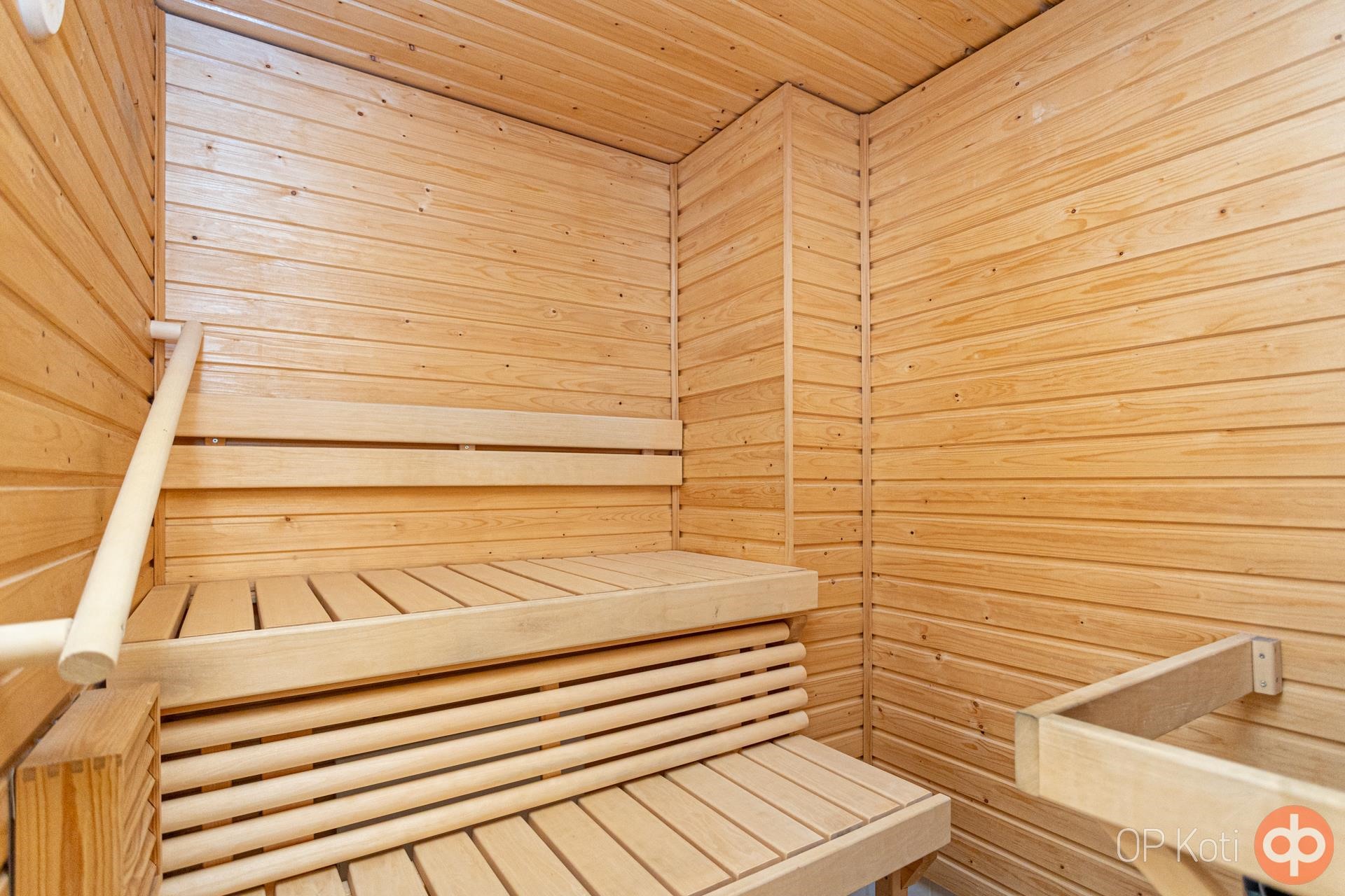 - Sauna, sähkökiuas, kylpyhuone, suihku, peilit, peilikaappi, allaskaappi, pesukoneliitäntä, lattialämmitys, kiinteät valaisimet.