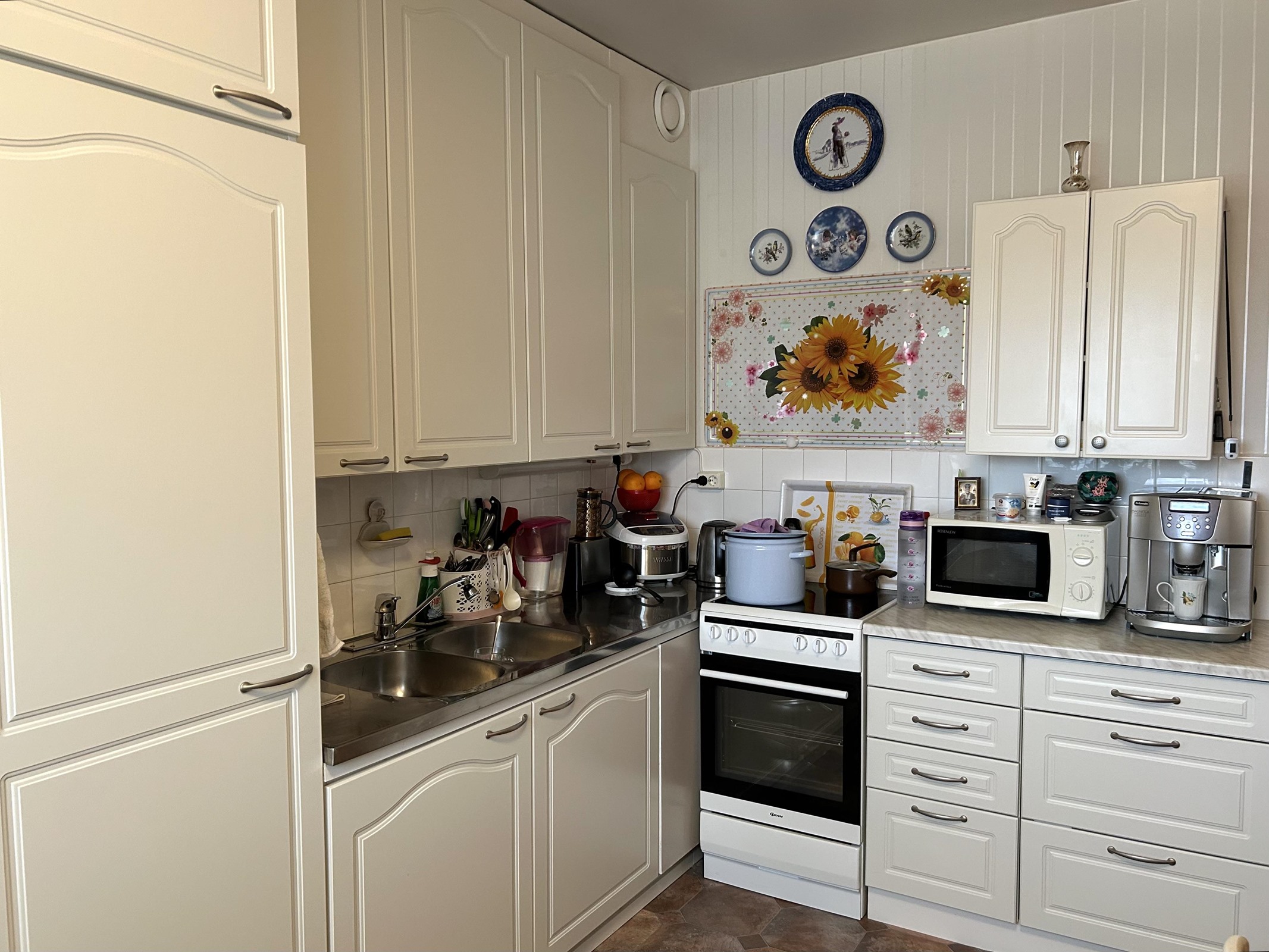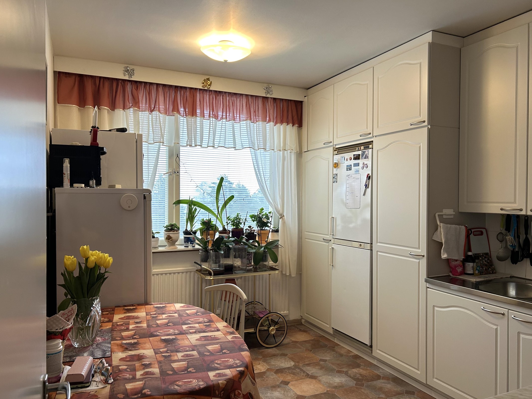 - Jääkaappipakastin, lattialiesi, sähköliesi, kaapistot, kiinteät valaisimet.