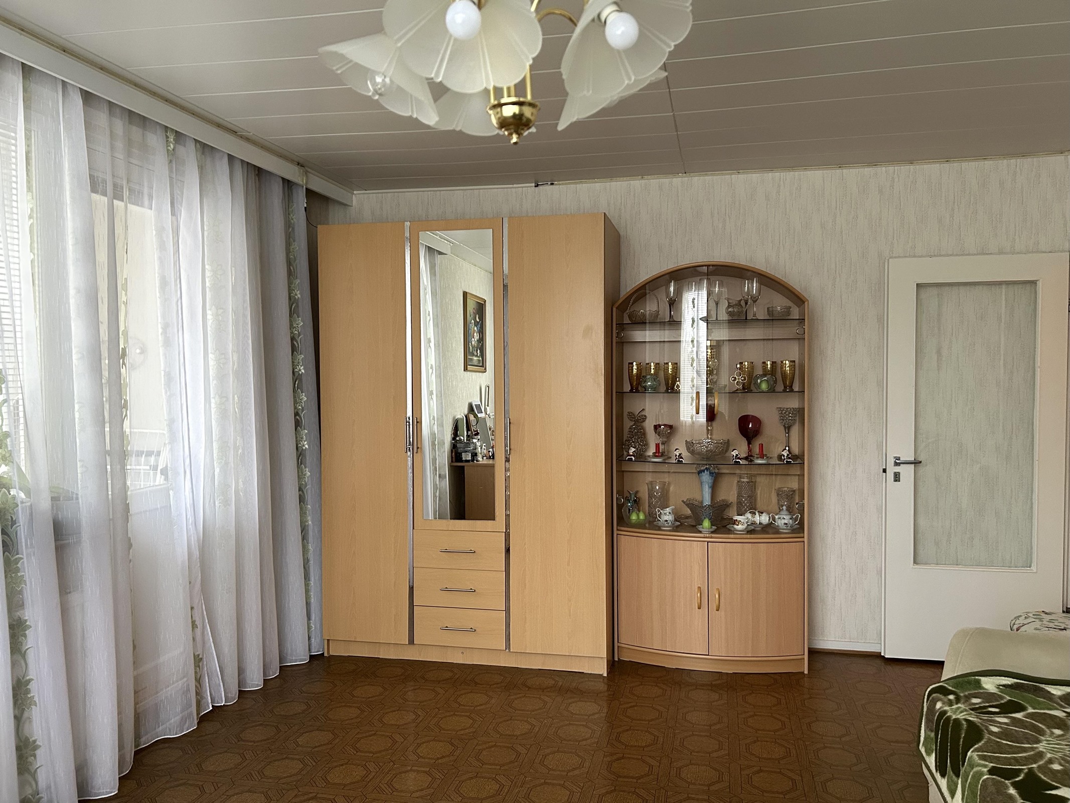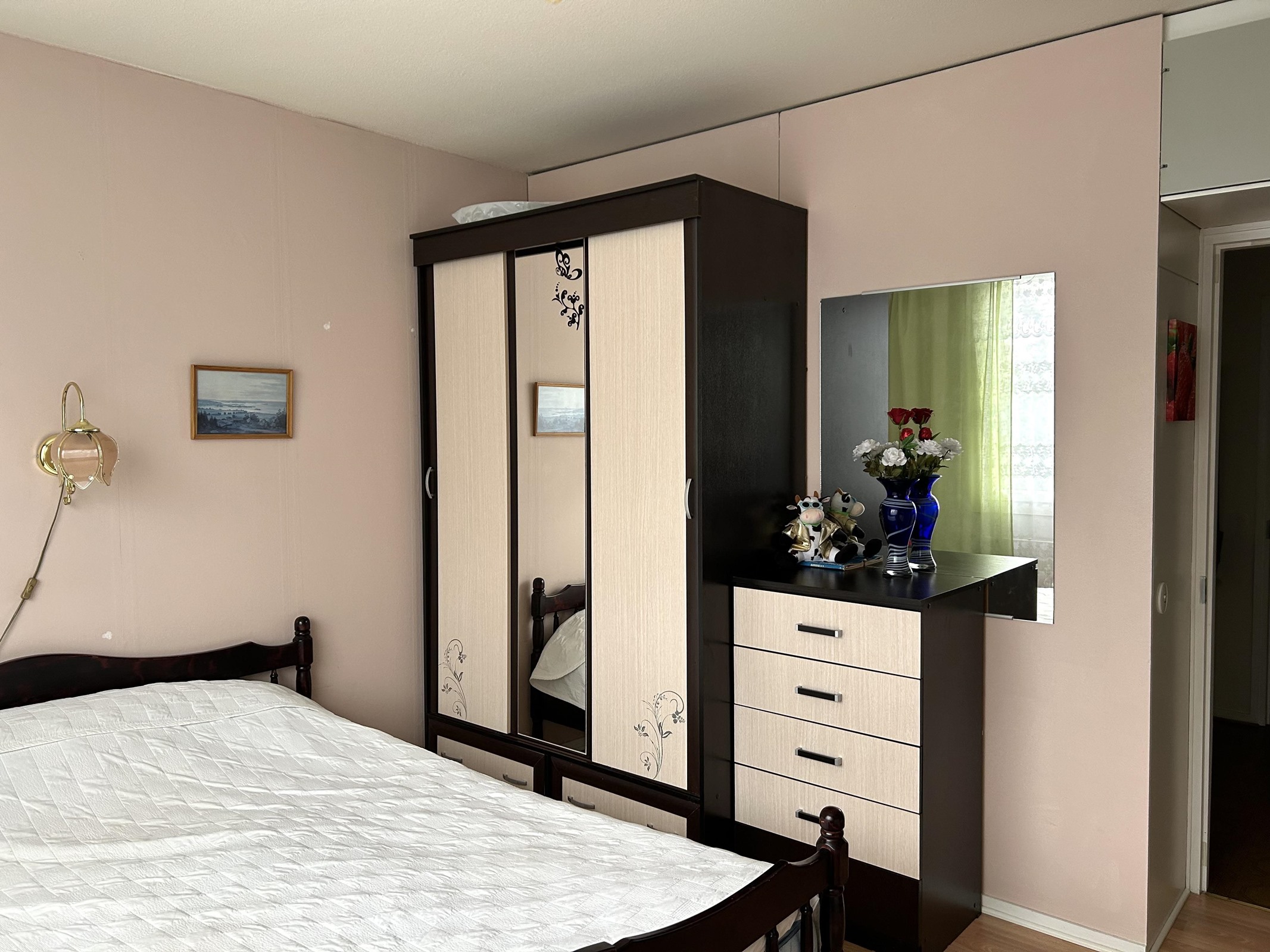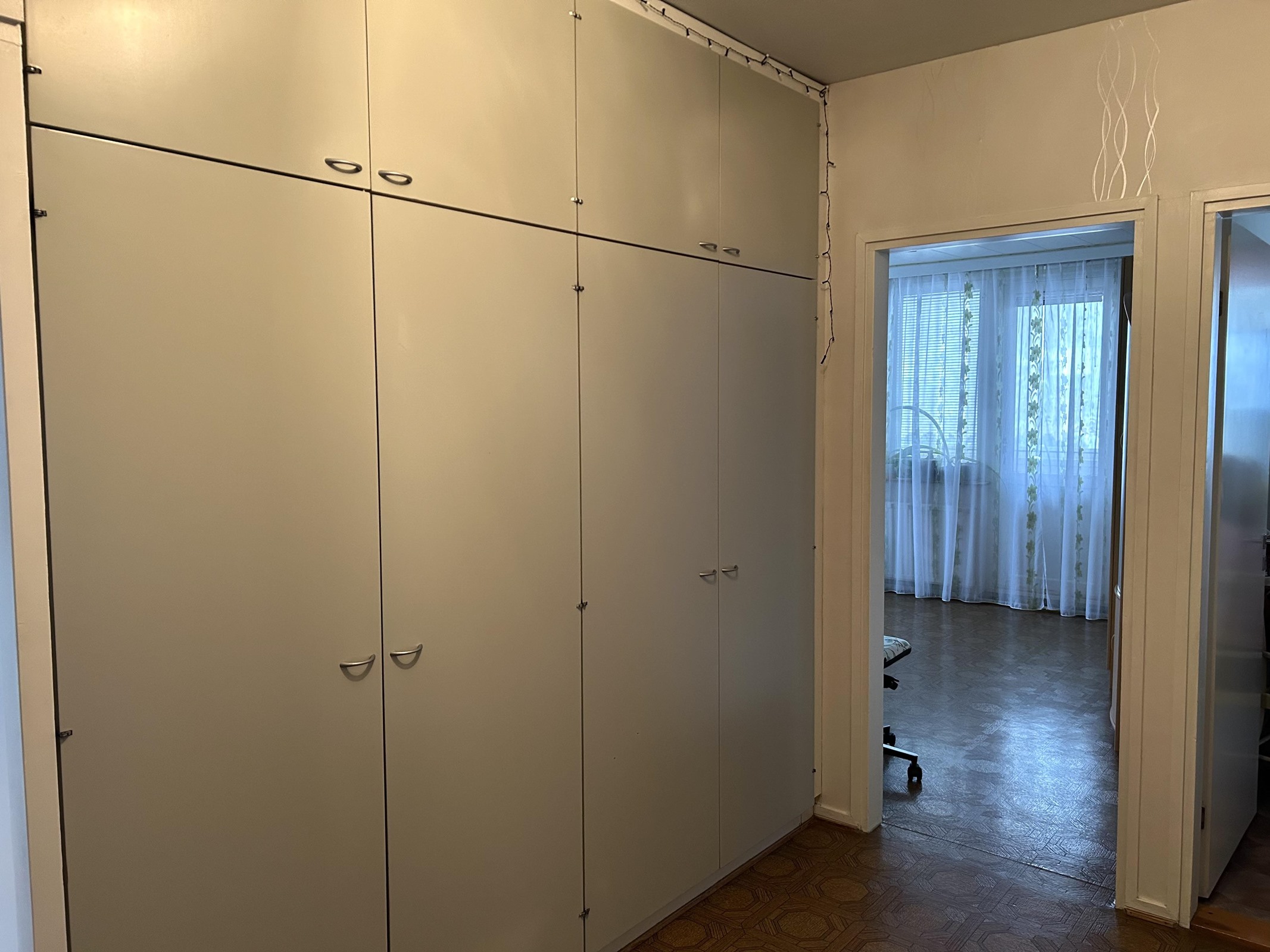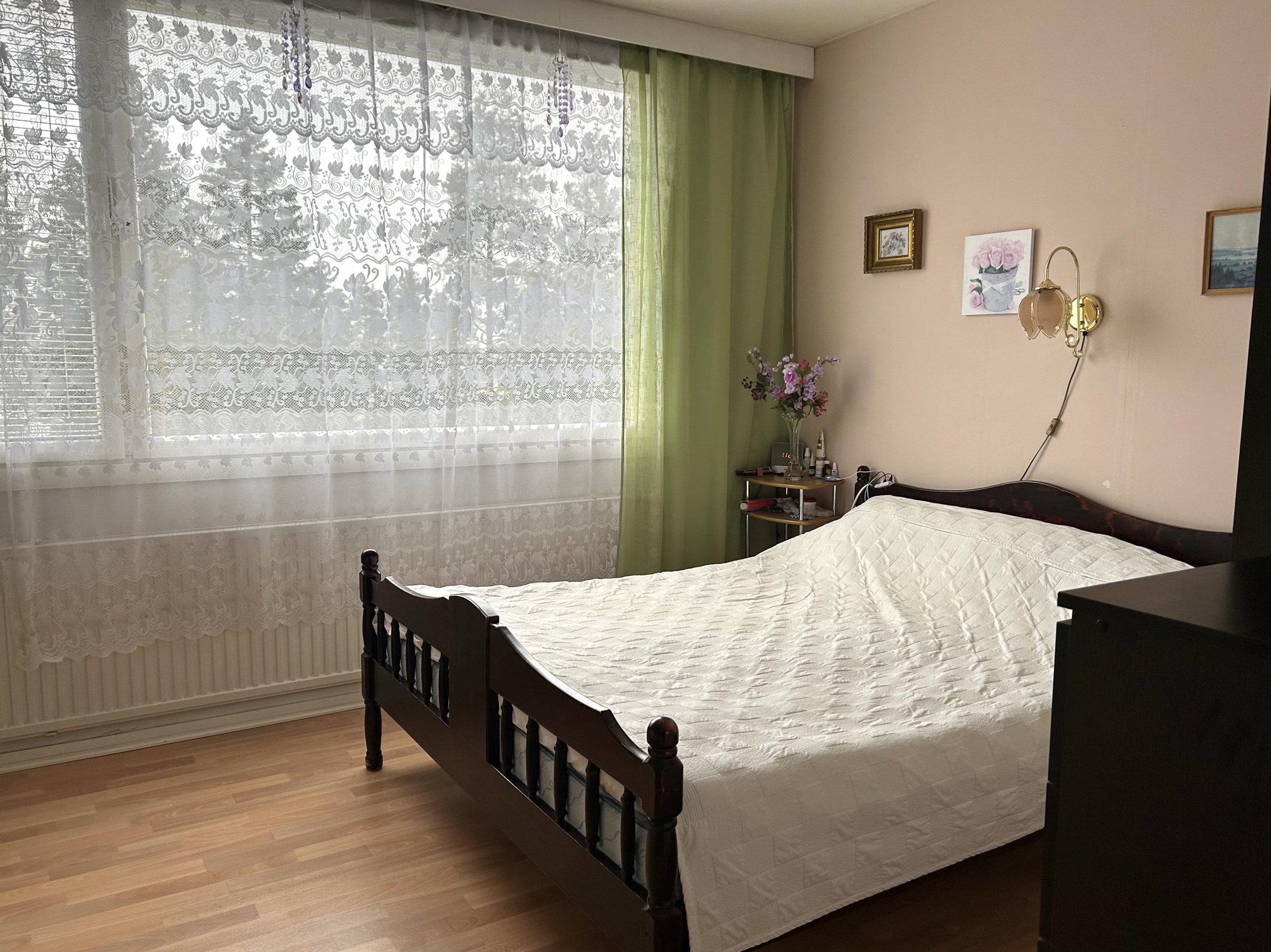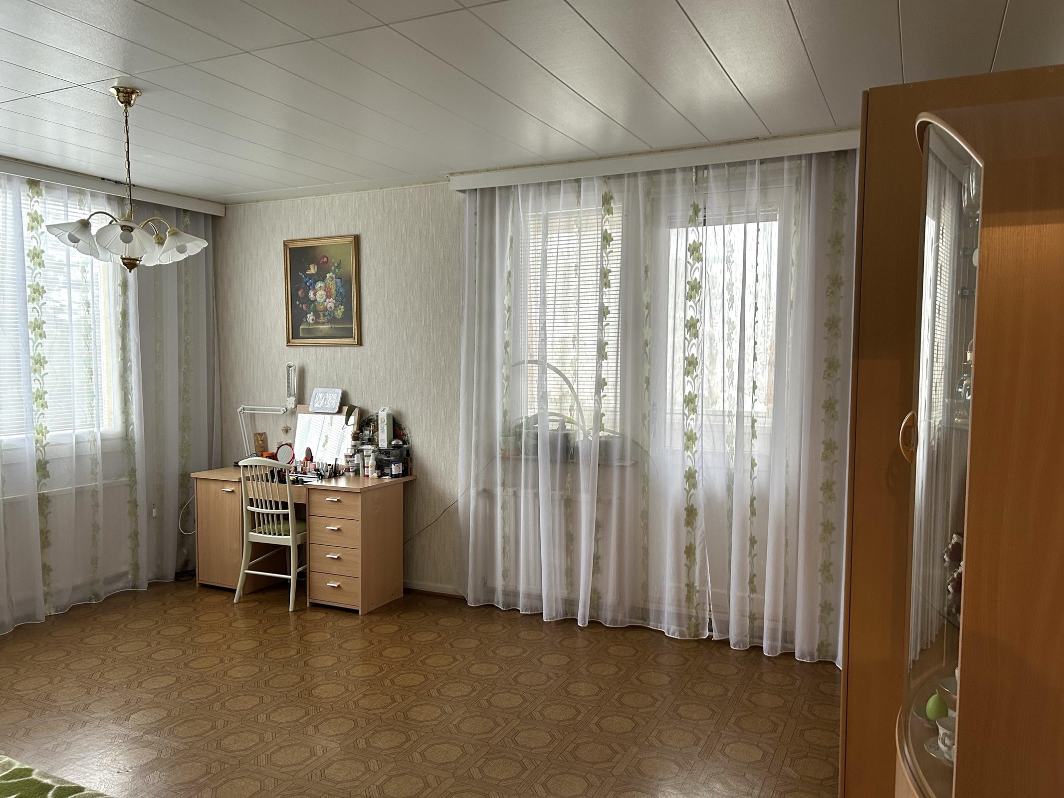 Keittiö: Muovimatto. seinät tapettia. Olohuone: Muovimatto. seinät tapettia. Makuuhuone 1: Muovimatto. seinät tapettia. Kylpyhuone: Laattalattia, seinät laattaa / maalattu.