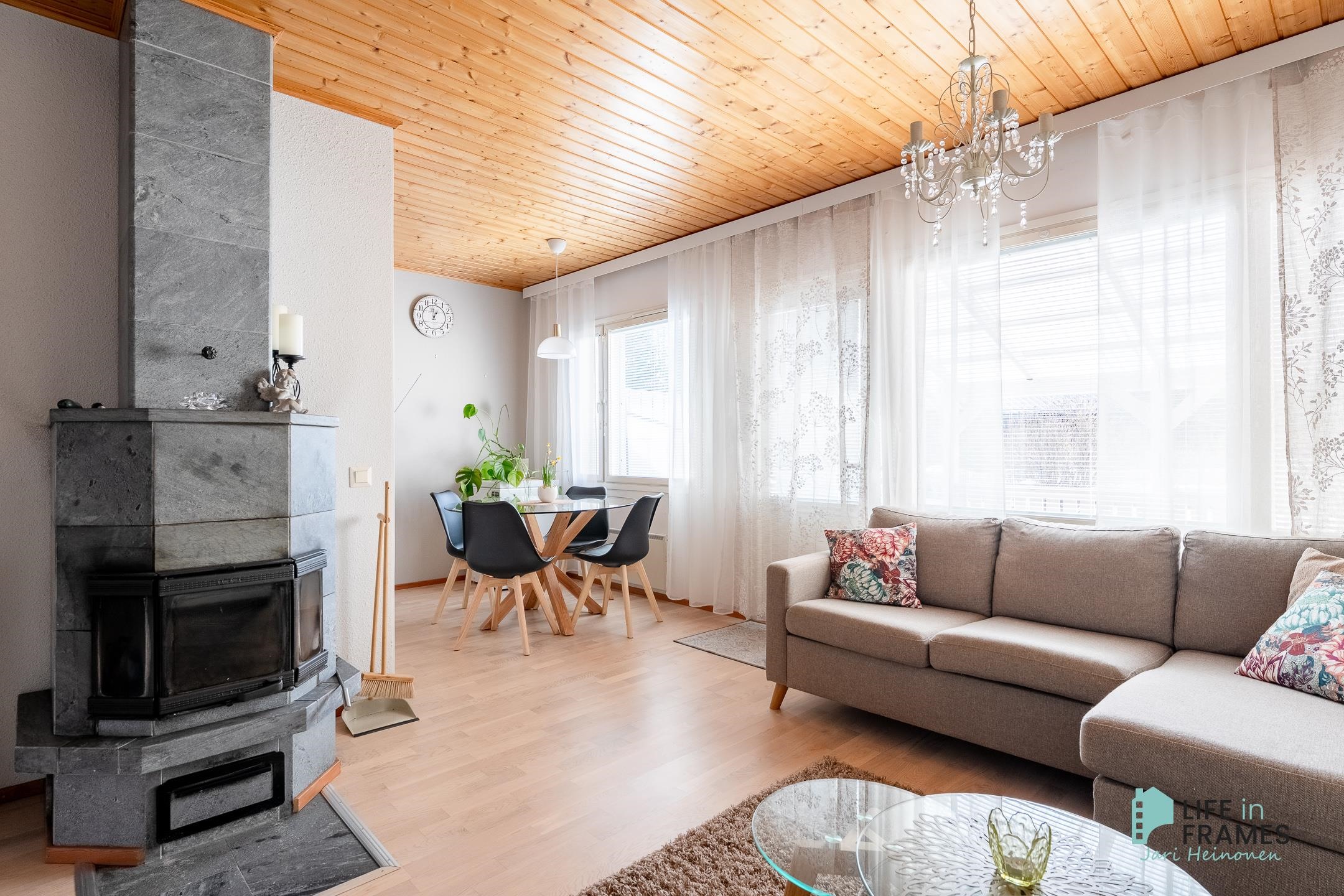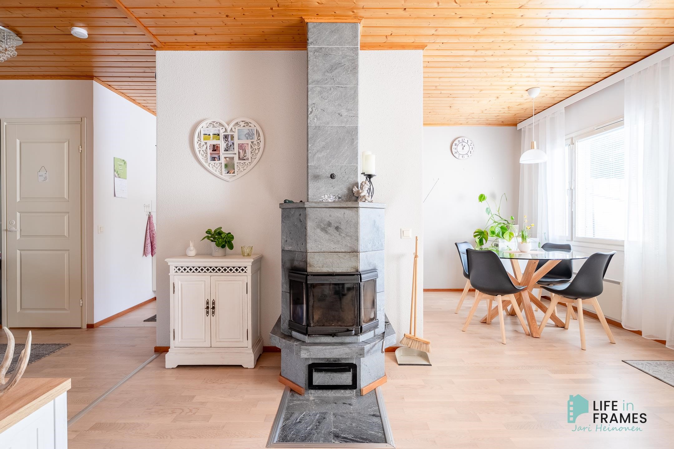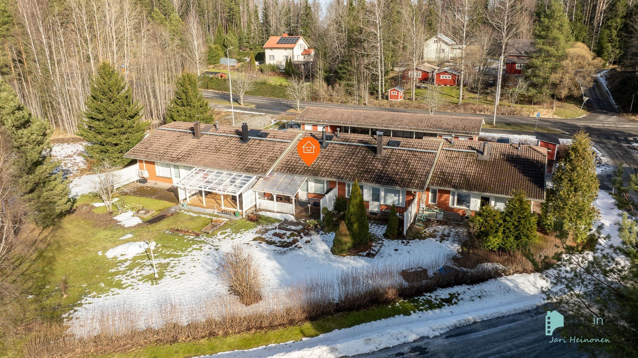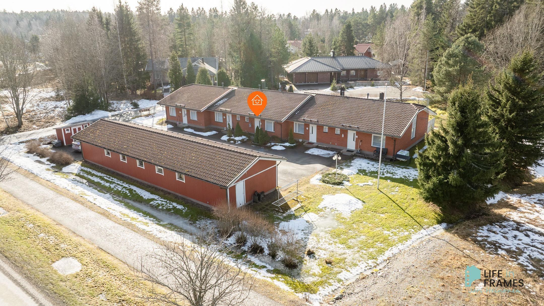 Tässä vuonna 1998 valmistuneessa rivitaloasunnossa on hyvä pohjaratkaisu - valoisat huoneet, paljon säilytystilaa ja jokaiselle toiminnolle omat tilat. Keittiö on siisti ja nykyaikainen ja ruokapöydälle on oma paikka ikkunan ääressä. Olohuone on keittiön ja ruokailutilan yhteydessä ja oleskelutilat jatkuvat reilunkokoiselle katetulle terassille. Olohuoneen varaava takka tuo sekä lämpöä että tunnelmaa asuntoon. Aamuauringon puolella sijaitsevan makuuhuoneen yhteydessä on hyvänkokoinen vaatehuone ja lisää säilytystilaa on myös eteisen kaapistoissa. Omassa saunassa kelpaa rentoutua päivän päätteeksi. Asuntoon kuuluu myös autokatospaikka ja ulkovarasto.
