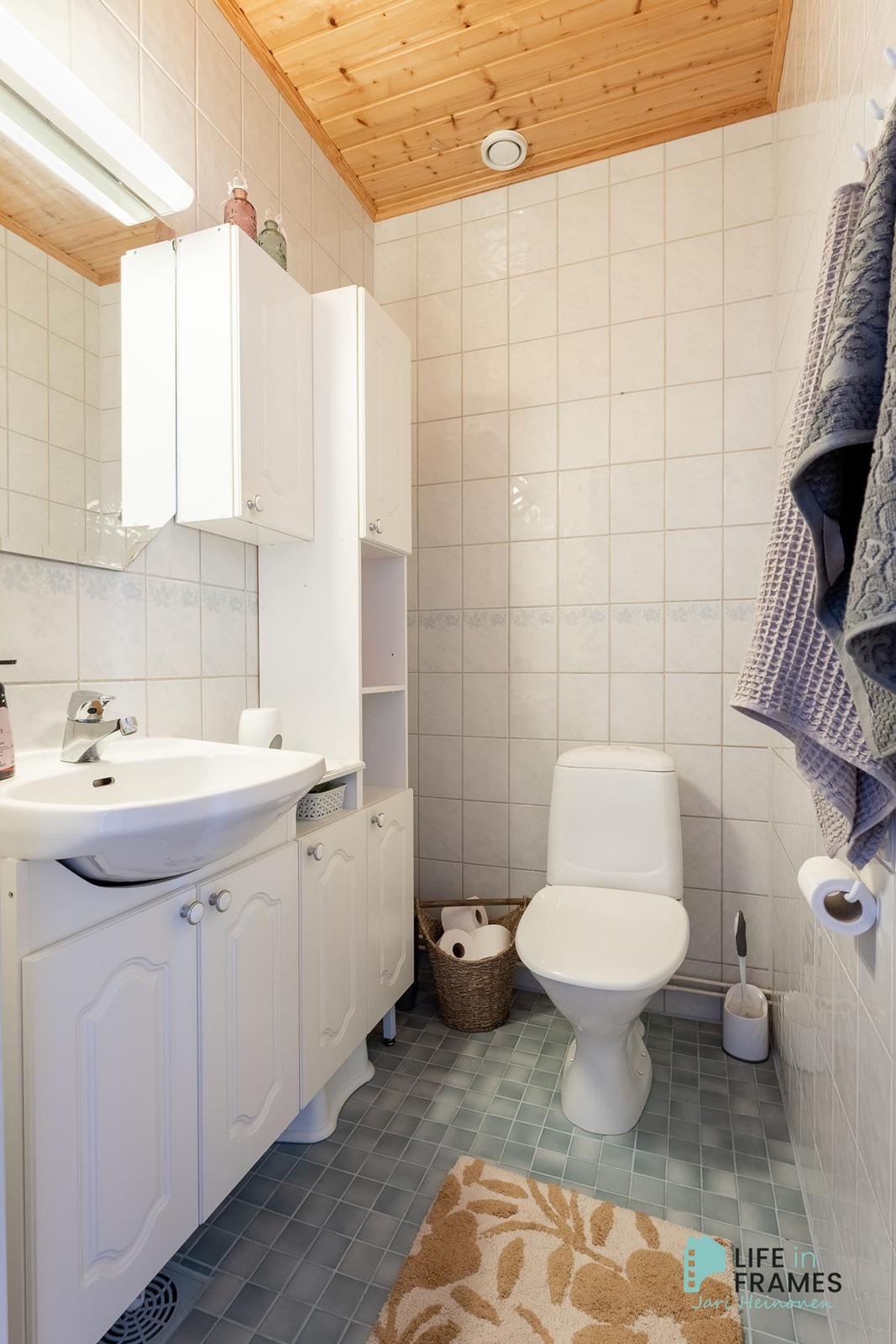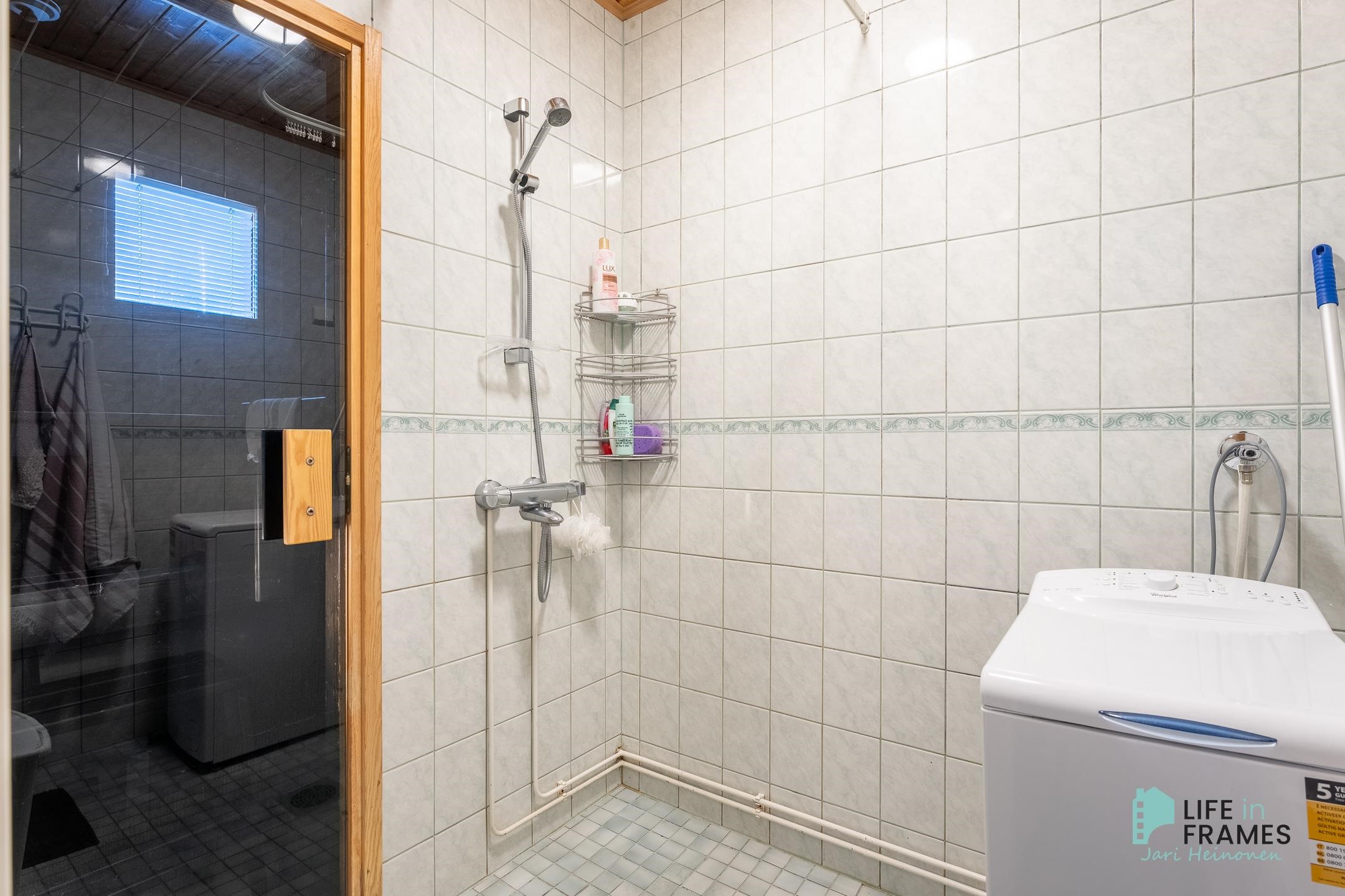 - Sauna, sähkökiuas, kylpyhuone, erillinen wc, suihku, peilit, kaapit, allaskaappi, pesukoneliitäntä, lattialämmitys, kiinteät valaisimet.