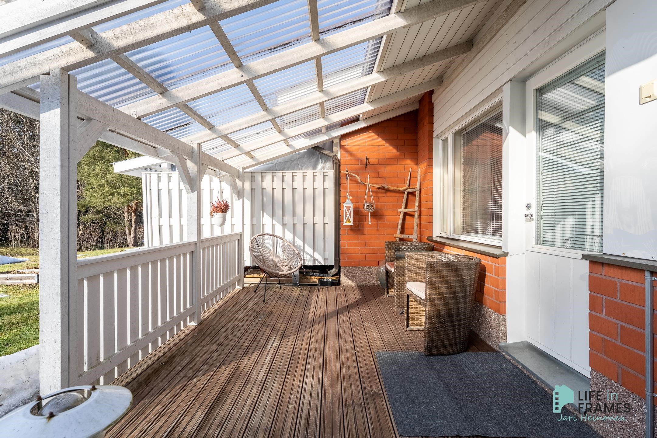 - Terassi ja olohuoneen ja ruokailutilan ikkunat lounaan suuntaan, makuuhuoneen ikkuna koilisen suuntaan.