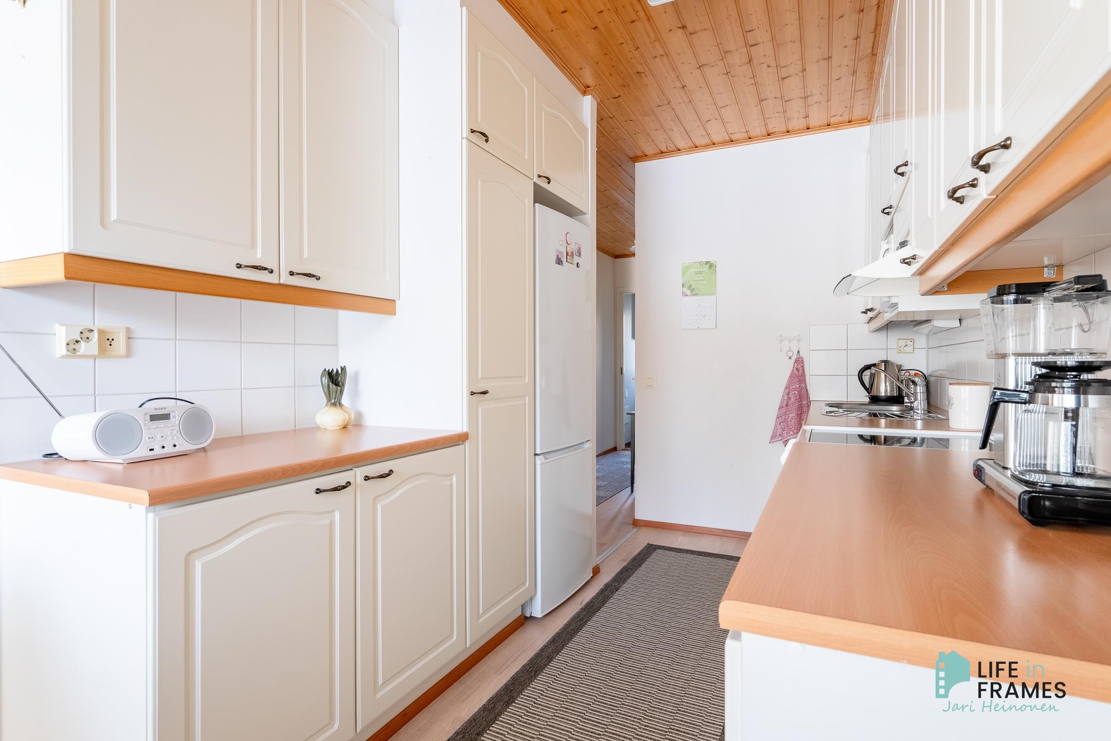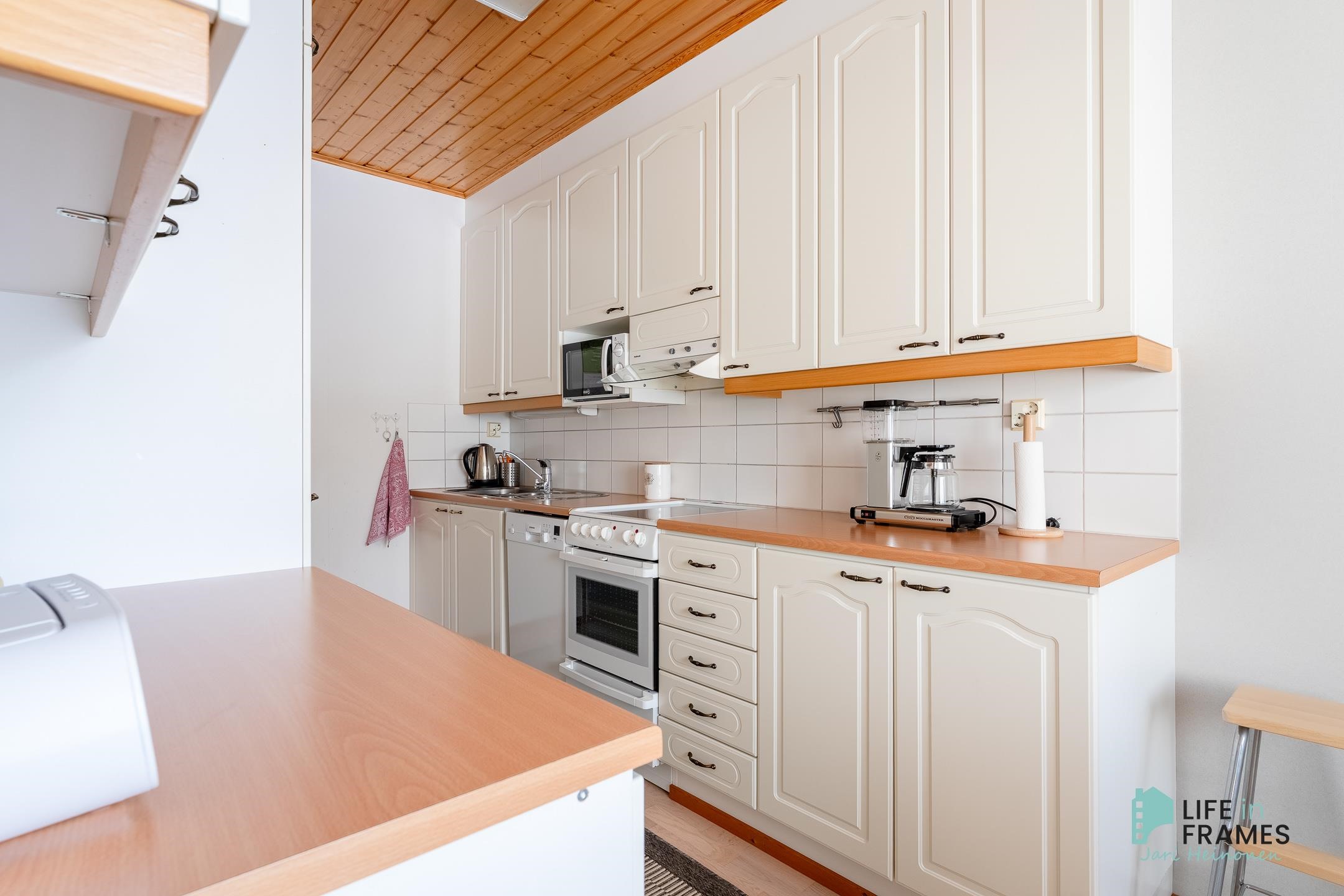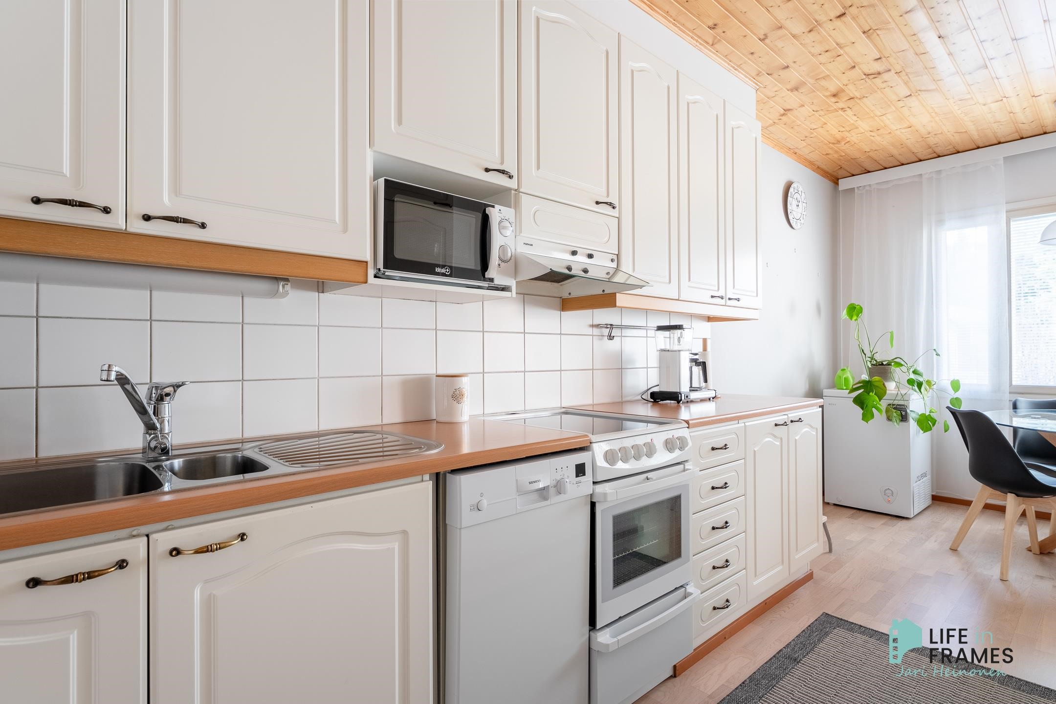 - Jääkaappipakastin, keraaminen liesi, liesituuletin, astianpesukone, kaapistot, kiinteät valaisimet.