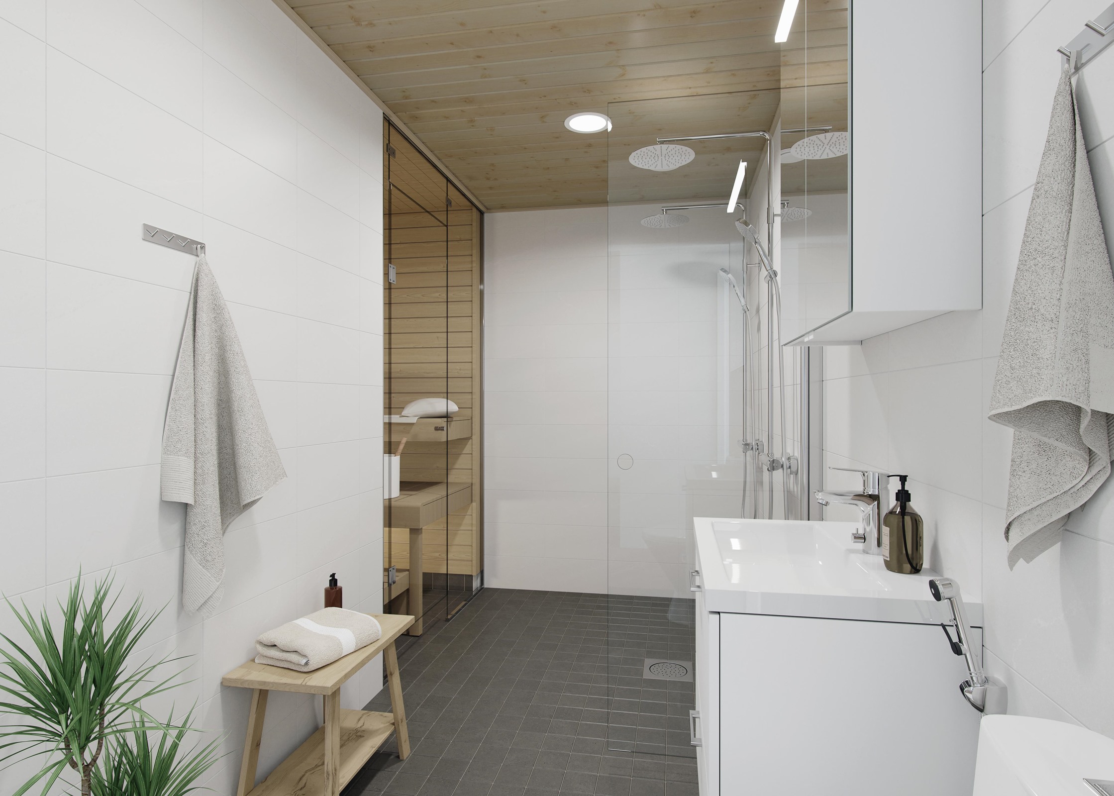 - Kylpyhuoneet ja pesutilat laatoitetaan, ja saunat paneloidaan. Saunan ja pesuhuoneen välinen lasiseinä tuo tilaan avaruutta ja modernia ilmettä. Kodinhoitotiloissa on varaukset sekä pyykinpesukoneelle että kuivausrummulle.