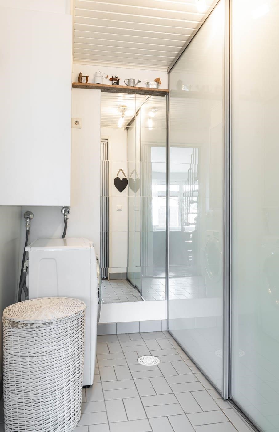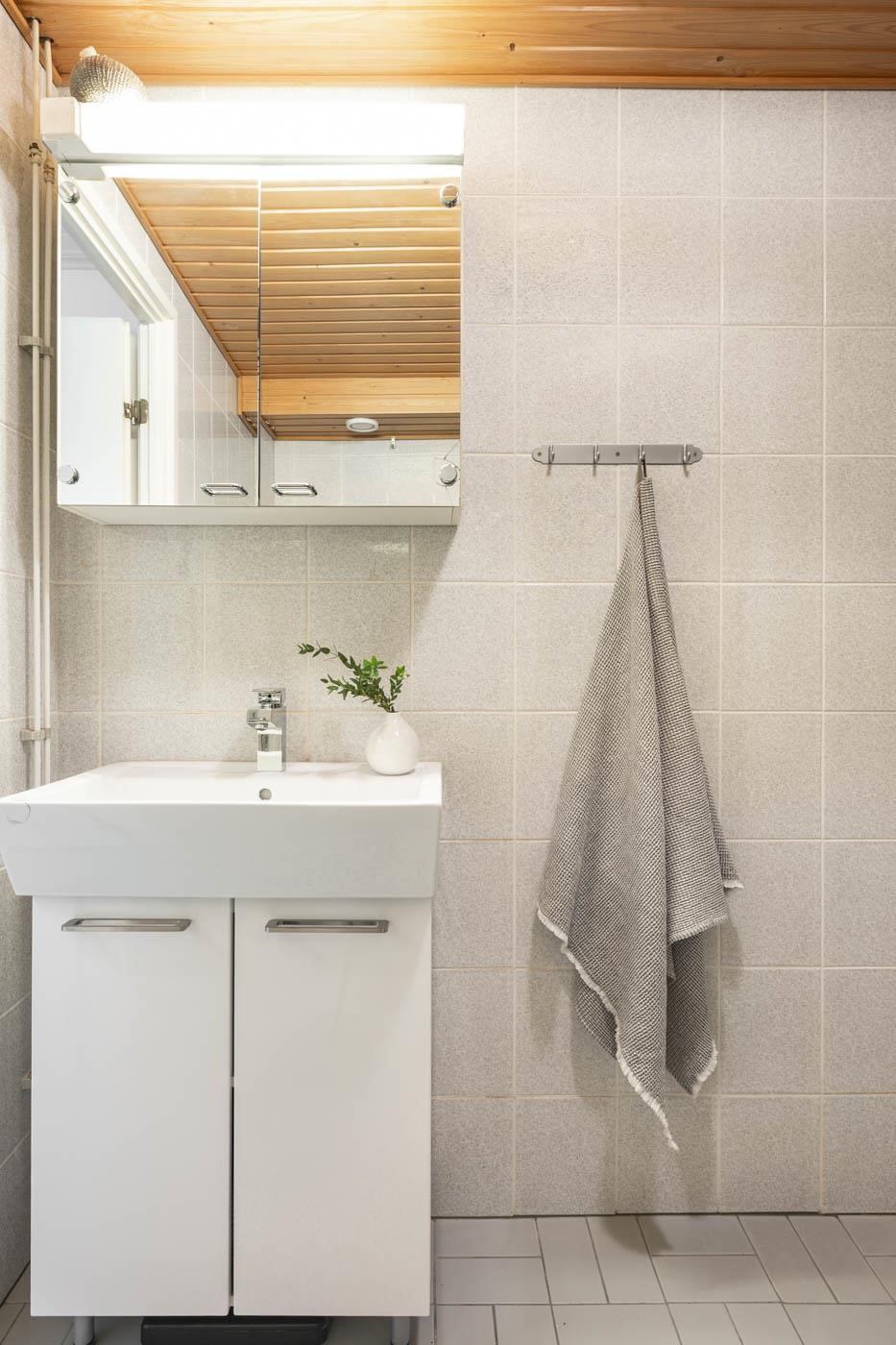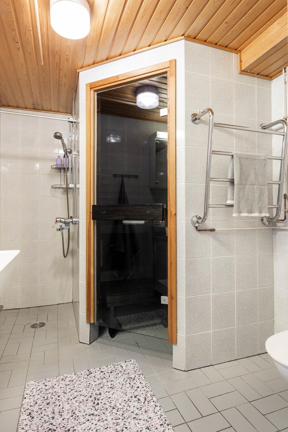 - Kylpyhuoneessa : Pesukoneliitäntä ja kodinhoitotilaa mukavasti, suihku, sauna sähkökiukaalla, peilikaappi ja allaskaappi, naulakko, wc, pyyhepatteri, lattialämmitys ja kiinteät valaisimet.