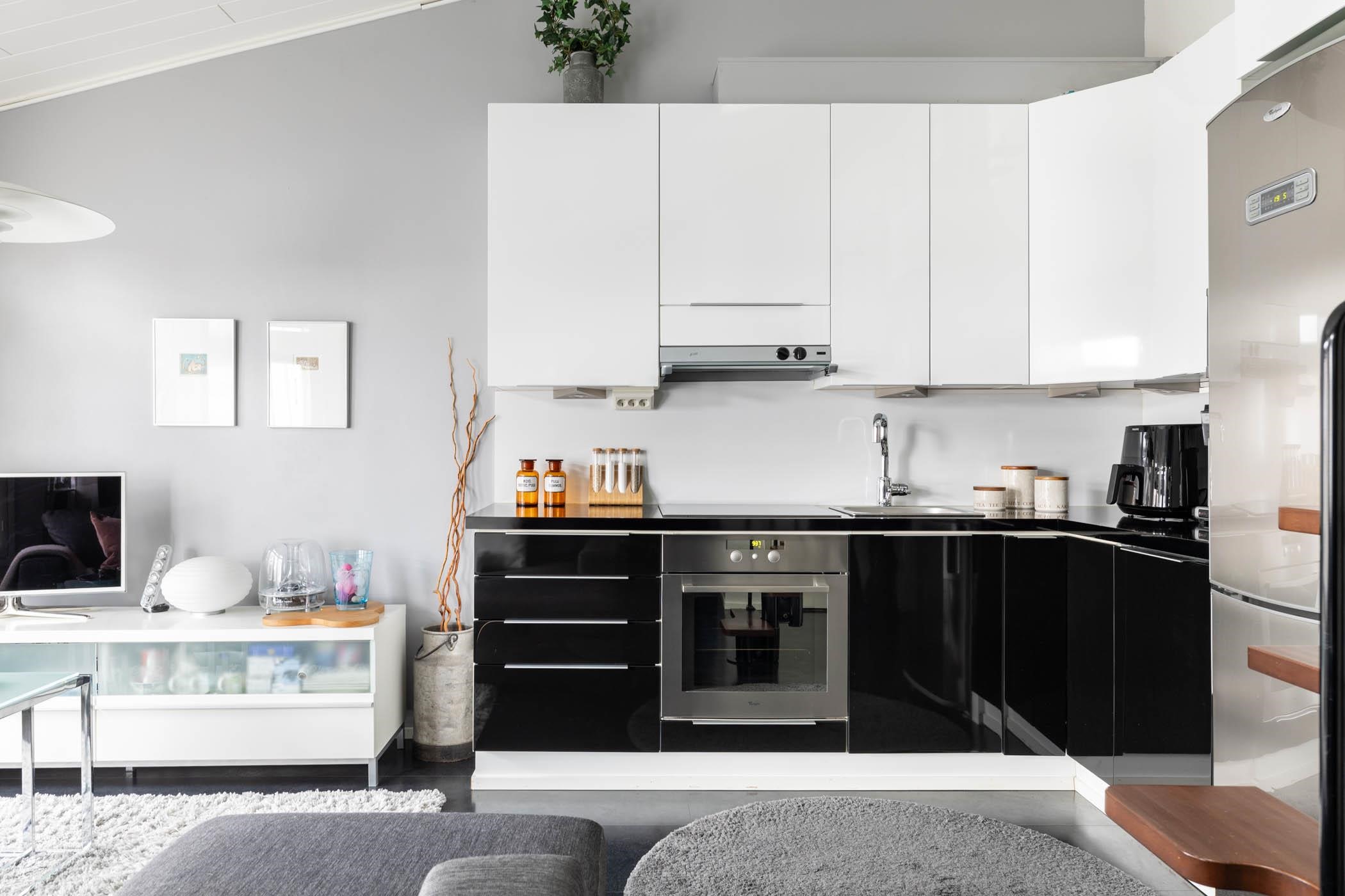 - Keittiössä : Jääkaappipakastin, integroitu erillisuuni ja induktiotaso, liesituuletin, integroitu astianpesukone, kaapistot ja kiinteät valaisimet.