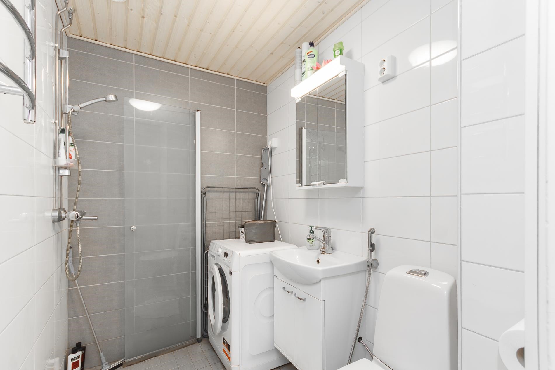 - Kylpyhuone, suihku, suihkuseinä, peilikaappi, allaskaappi, pesukoneliitäntä, kiinteät valaisimet, Pyyhepatteri.