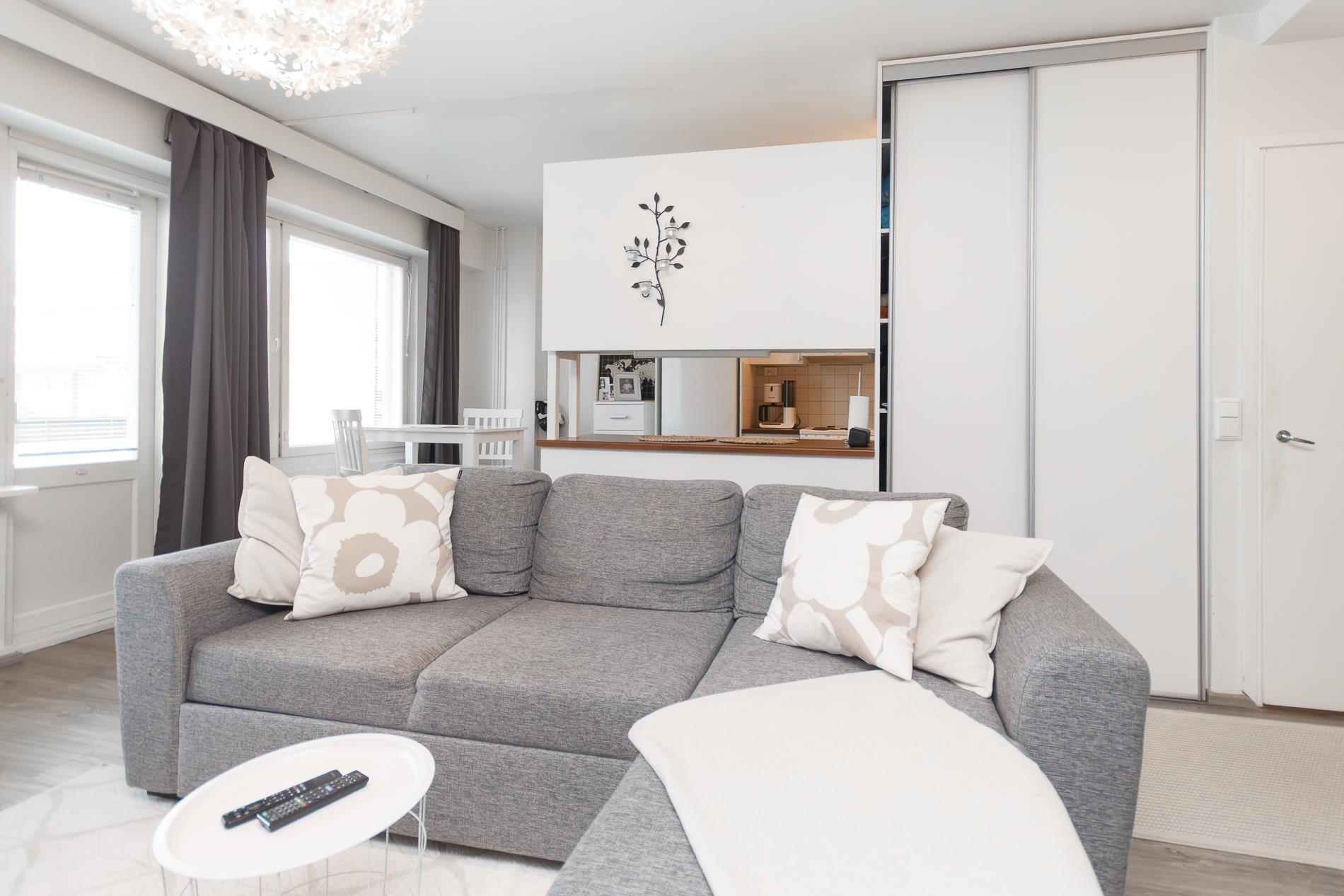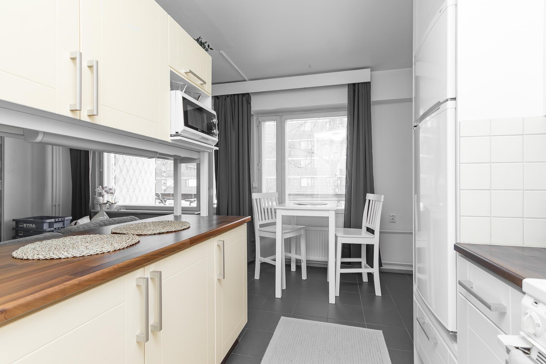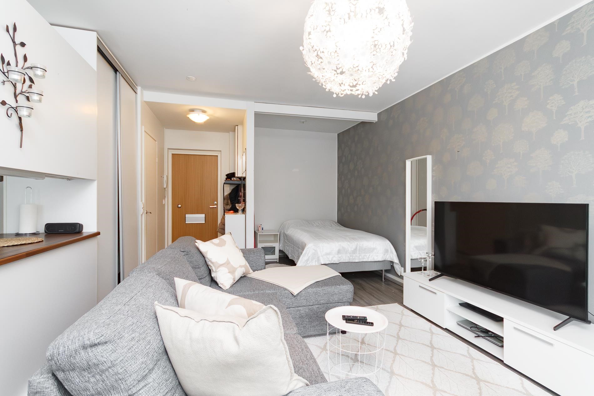Keittiökalusteet ovat avaruutta luoden osin välitilan kohdalta avonaiset huoneen puolelle. Huoneessa on makuualkovi ja upotettu kaapisto. Remontoidussa kylpyhuoneessa on paikka pyykinpesukoneelle. Tilavalta parvekkeelta on näkymät sisäpihalle ja etelään päin.