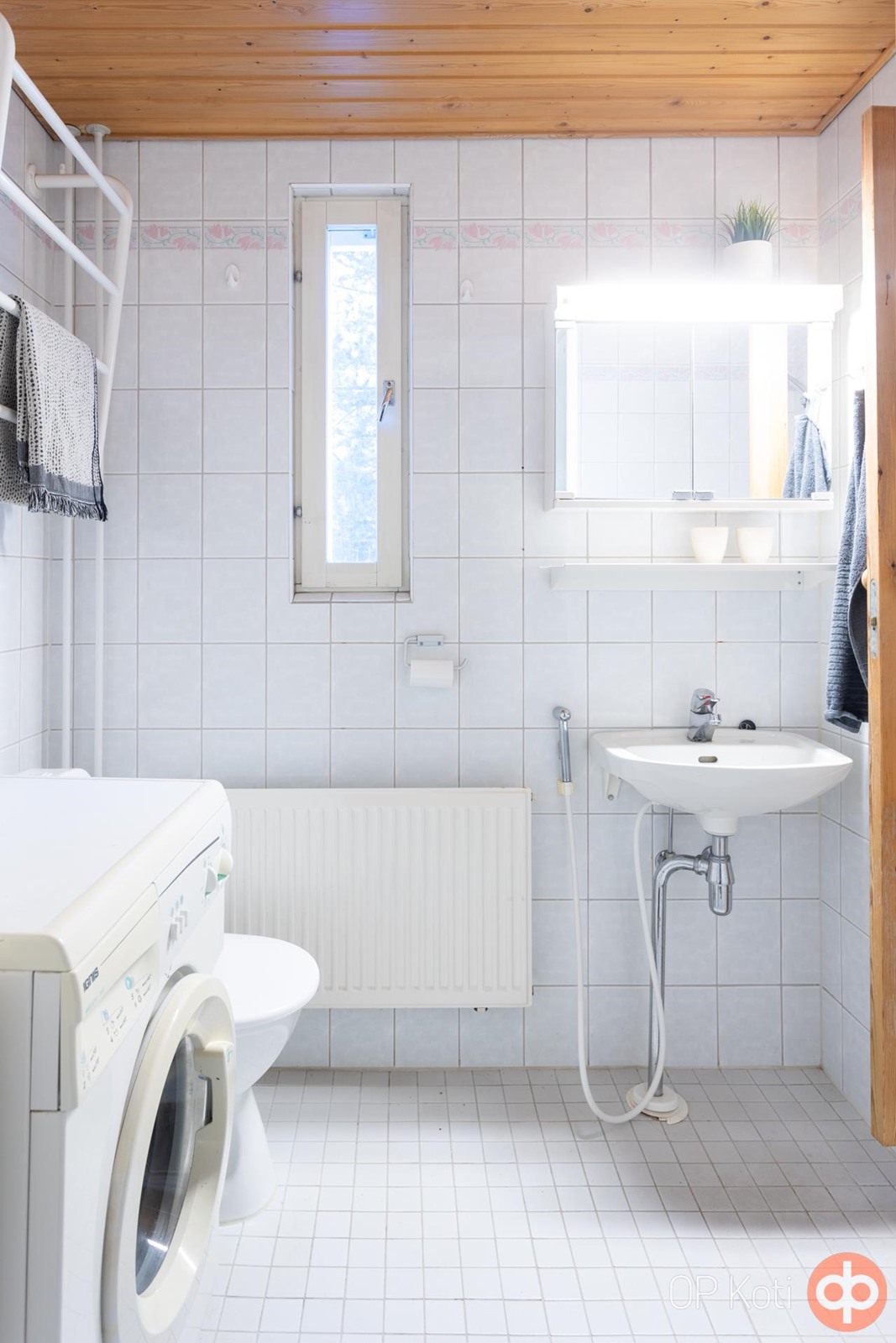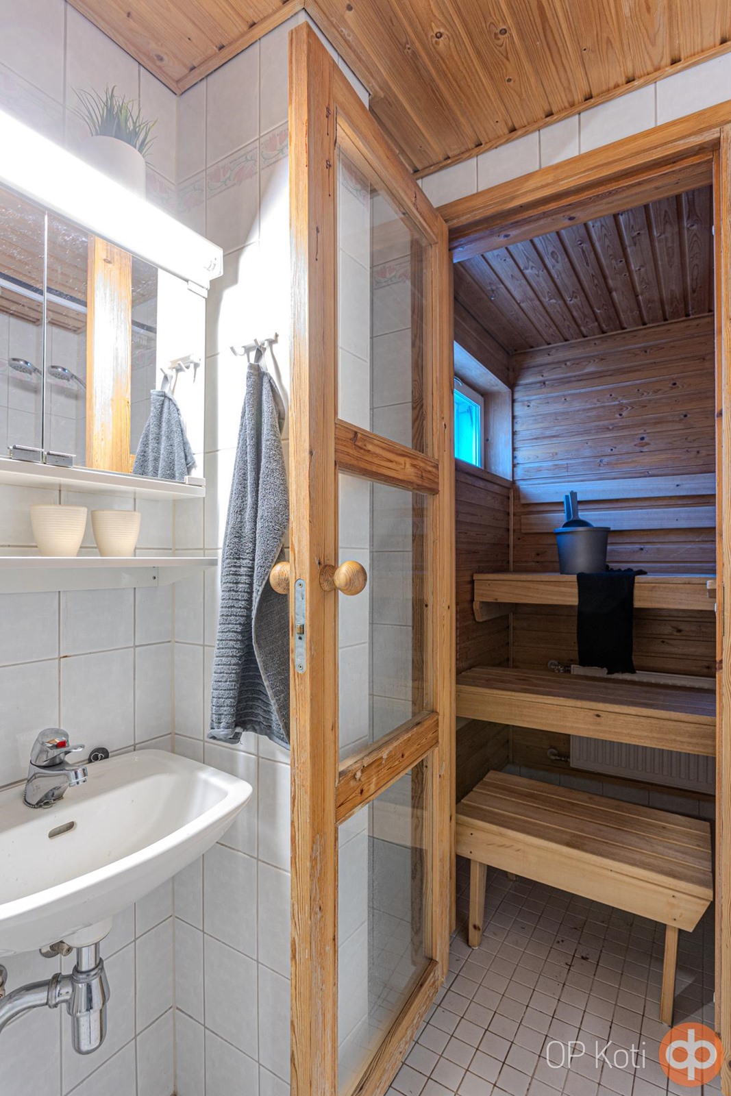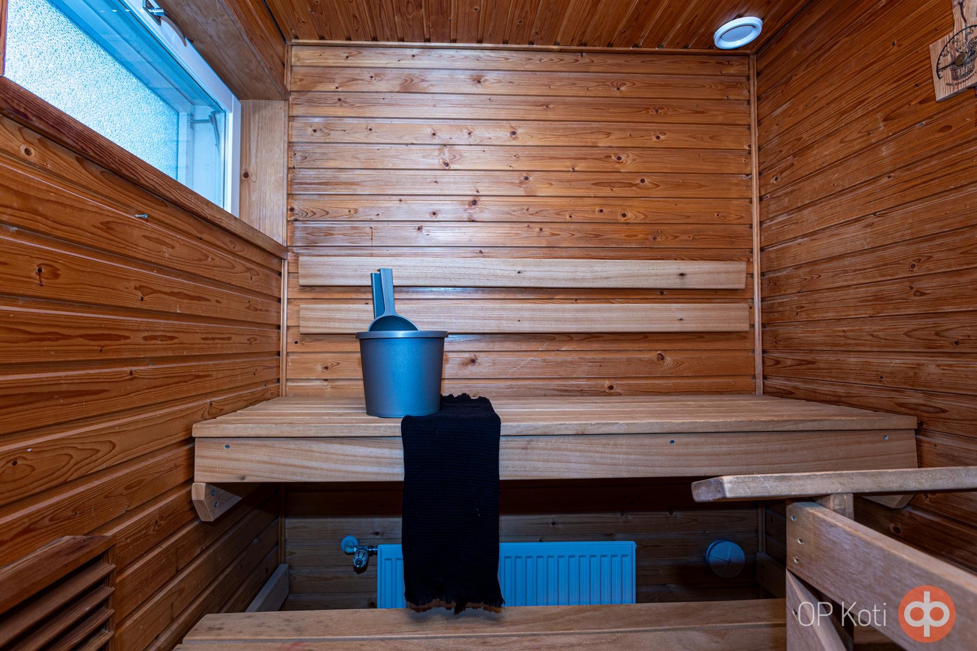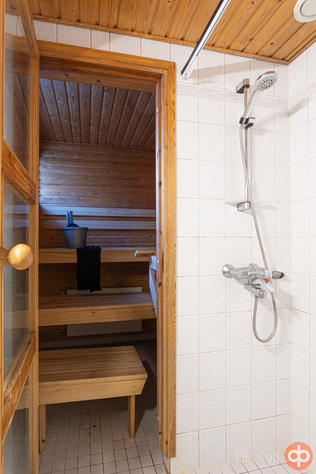 - Sauna, sähkökiuas, kylpyhuone, suihku, suihkuseinä, peilikaappi, allaskaappi, pesukoneliitäntä, kiinteät valaisimet.