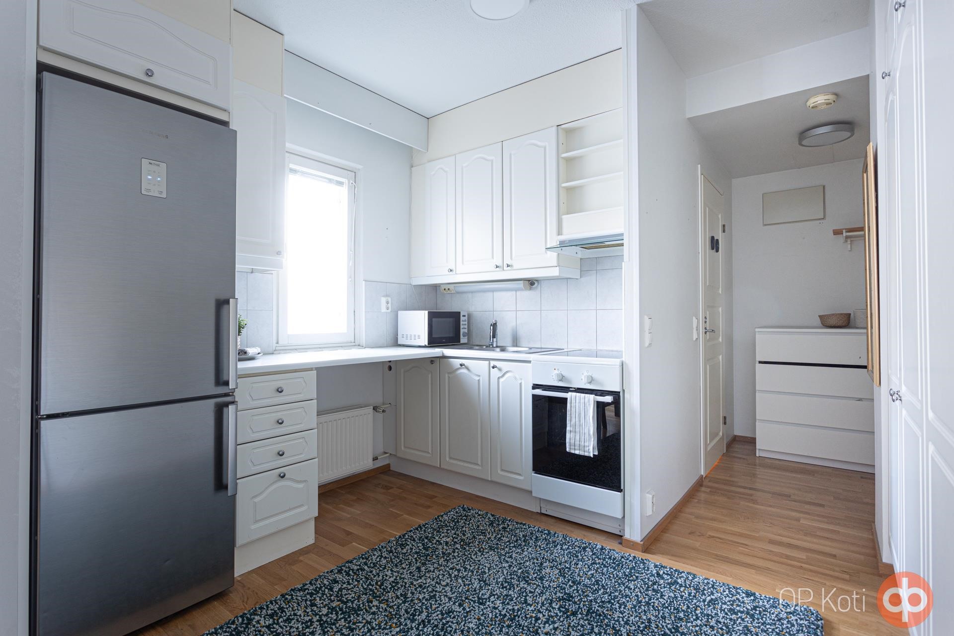 - Jääkaappipakastin, sähköliesi, liesikupu, kaapistot, kiinteät valaisimet.
