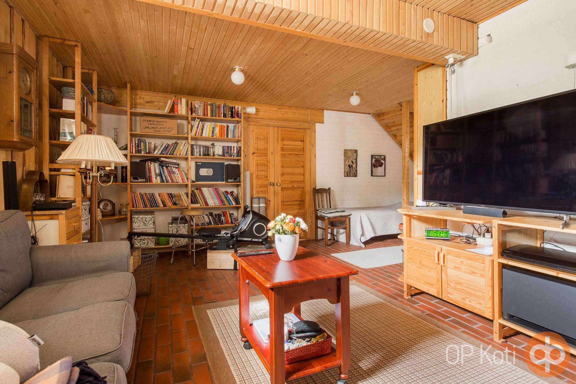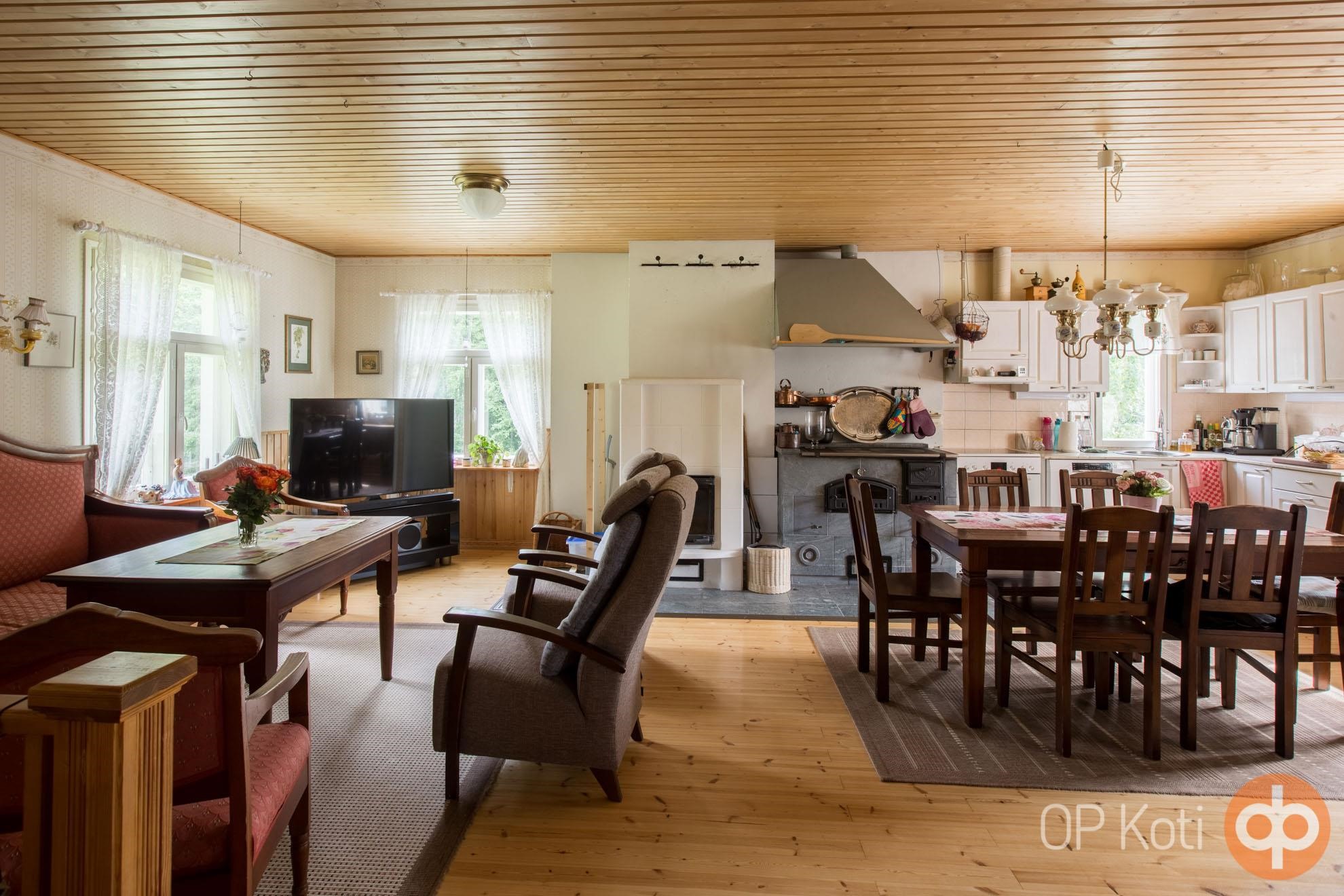 Keittiö: Lattia: mäntylautalattia, seinät: tapetti, puolipaneeli ja laatta.. Olohuone: Lattia: mäntylautalattia, seinät: tapetti, puolipaneeli ja laatta.. Makuuhuone 1: Lattia: mäntylautalattia, seinät: maalattu.. Makuuhuone 2: Lattia: mäntylautalattia, seinät: maalattu.. Kodinhoitohuone: Laatta. Kylpyhuone: Laatta. Eteinen: Lattia: laatta, seinät: maalattu (lattialämmitys).. Wc: mäntylautalattia, seinät: puolipaneeli.. Takkahuone: Lattia: tiili, seinät: leppälauta.. Sisäkatot: Leppäpaneeli.