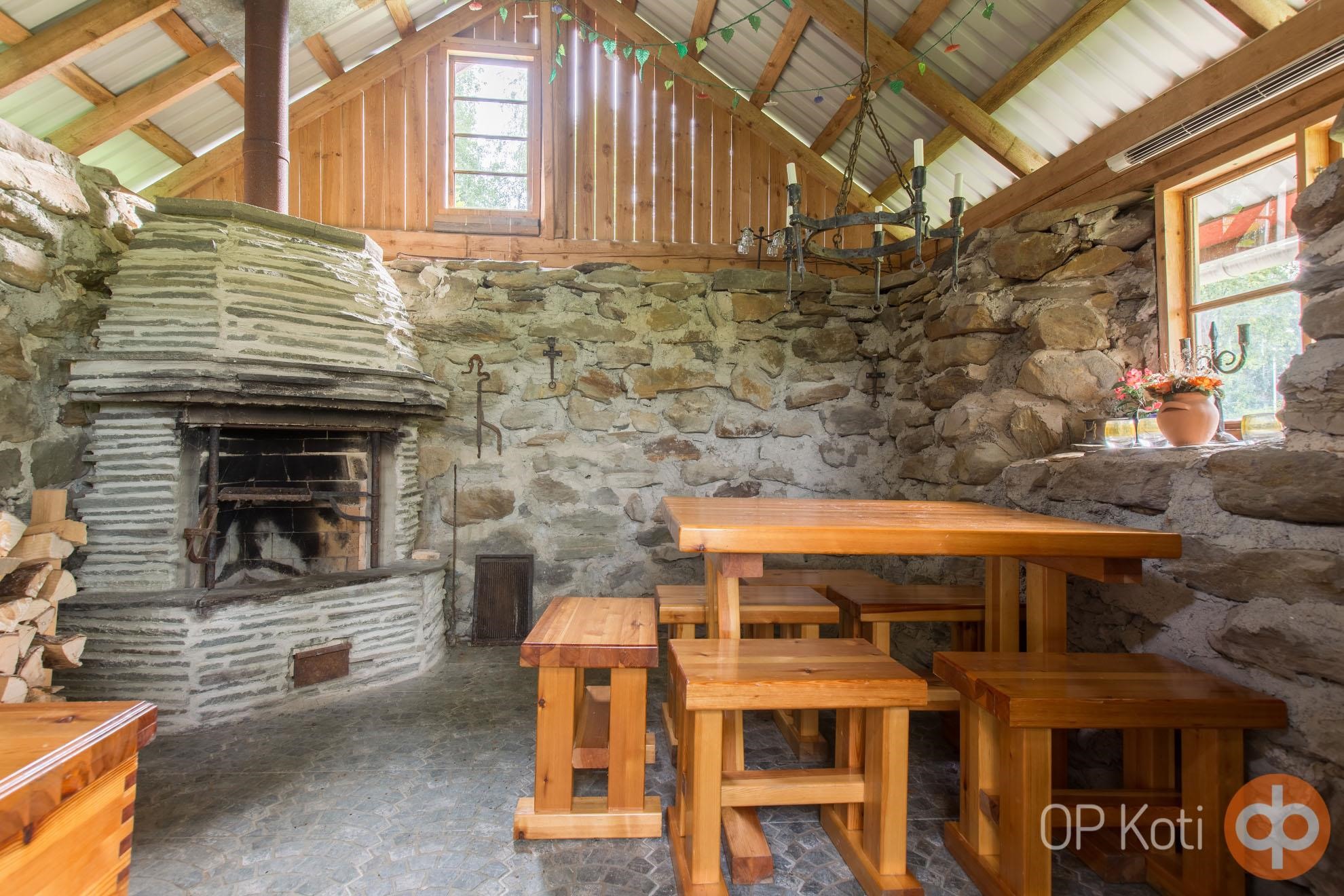 Päärakennus, joka on rakennettu vuonna 1995, kohoaa kahteen kerrokseen kallion päälle. Viihtyisä viherhuone, jossa on tunnelmaa luova kamina, kruunaa kokonaisuuden ja tarjoaa täydellisen paikan nauttia luonnonvalosta ja rentoutua kesällä ja talvella. Tunnelma ja kodikkuus ovat tämän paikan teemoja, ja sen kyllä huomaa heti sisään astuessa.