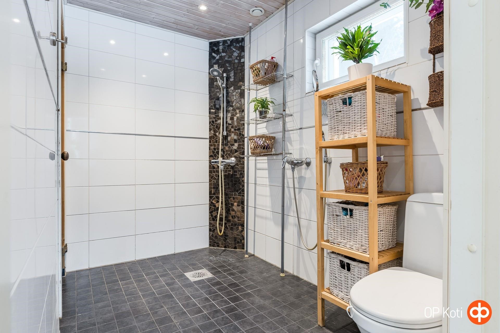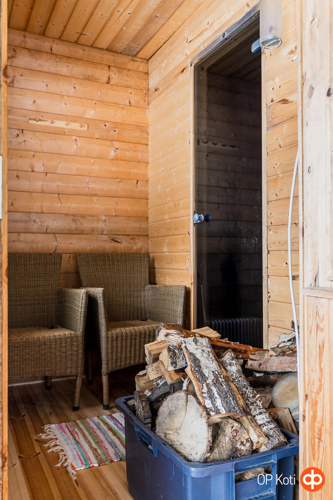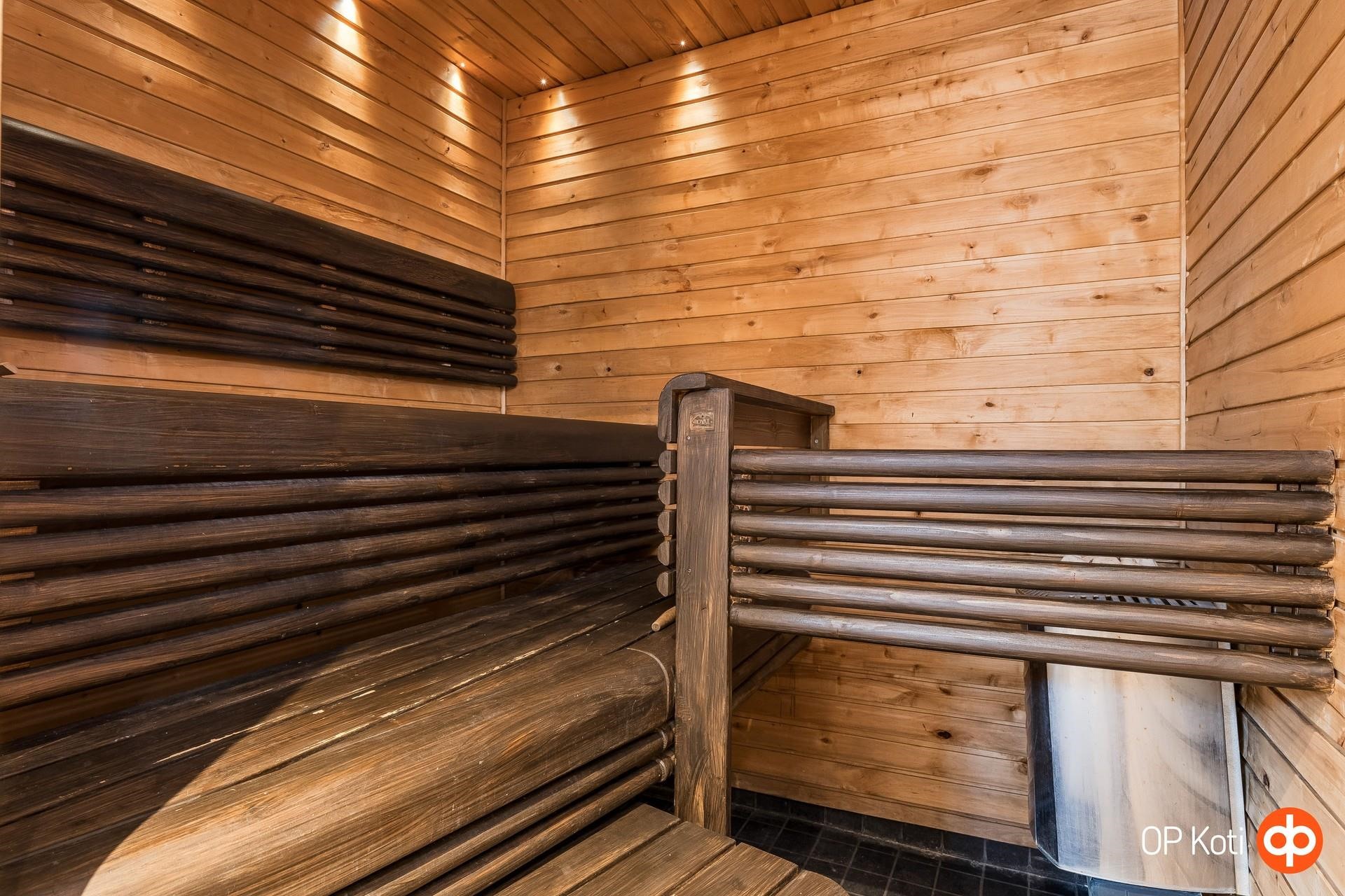- Sauna sisäsauna ja rantasauna, sähkökiuas (sisäsaunassa), puukiuas (rantasaunassa), kylpyhuone, erillinen wc, suihku (2 kpl), peilit (valopeili), kaapit, allaskaappi, pesukoneliitäntä (khh:ssa), lattialämmitys.