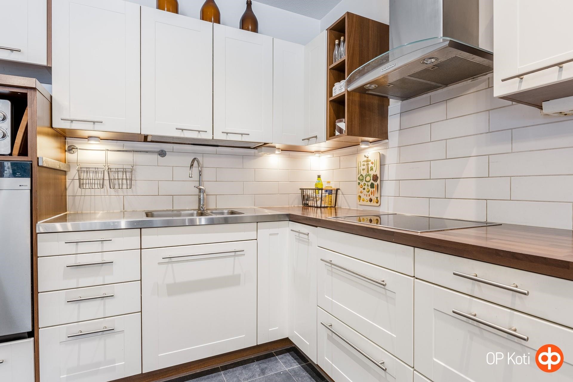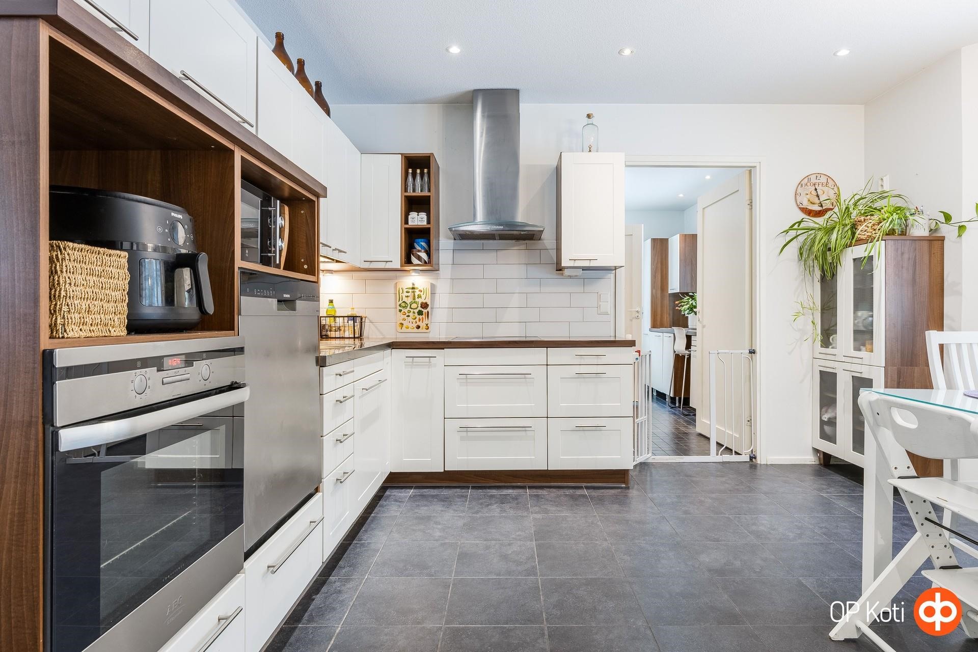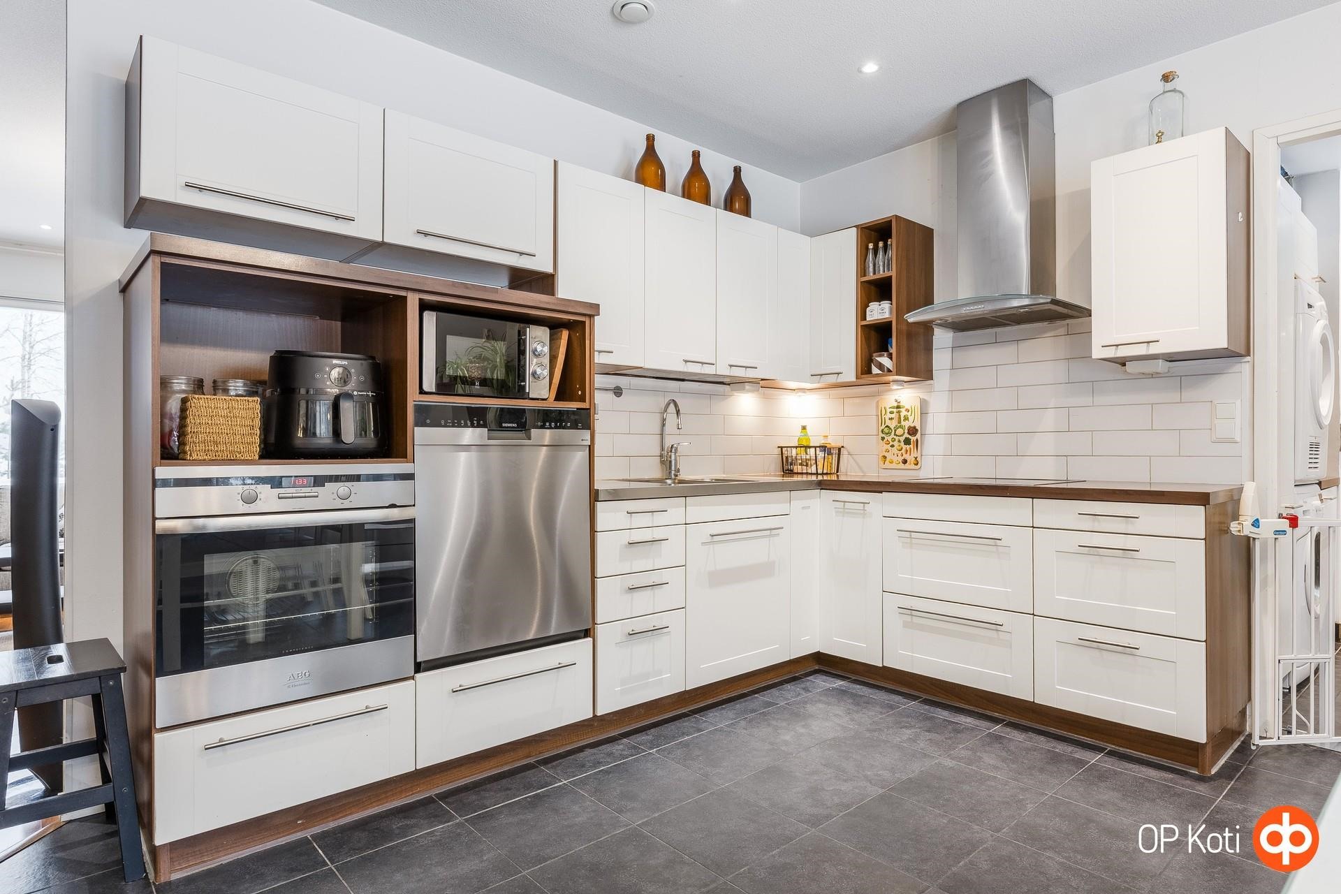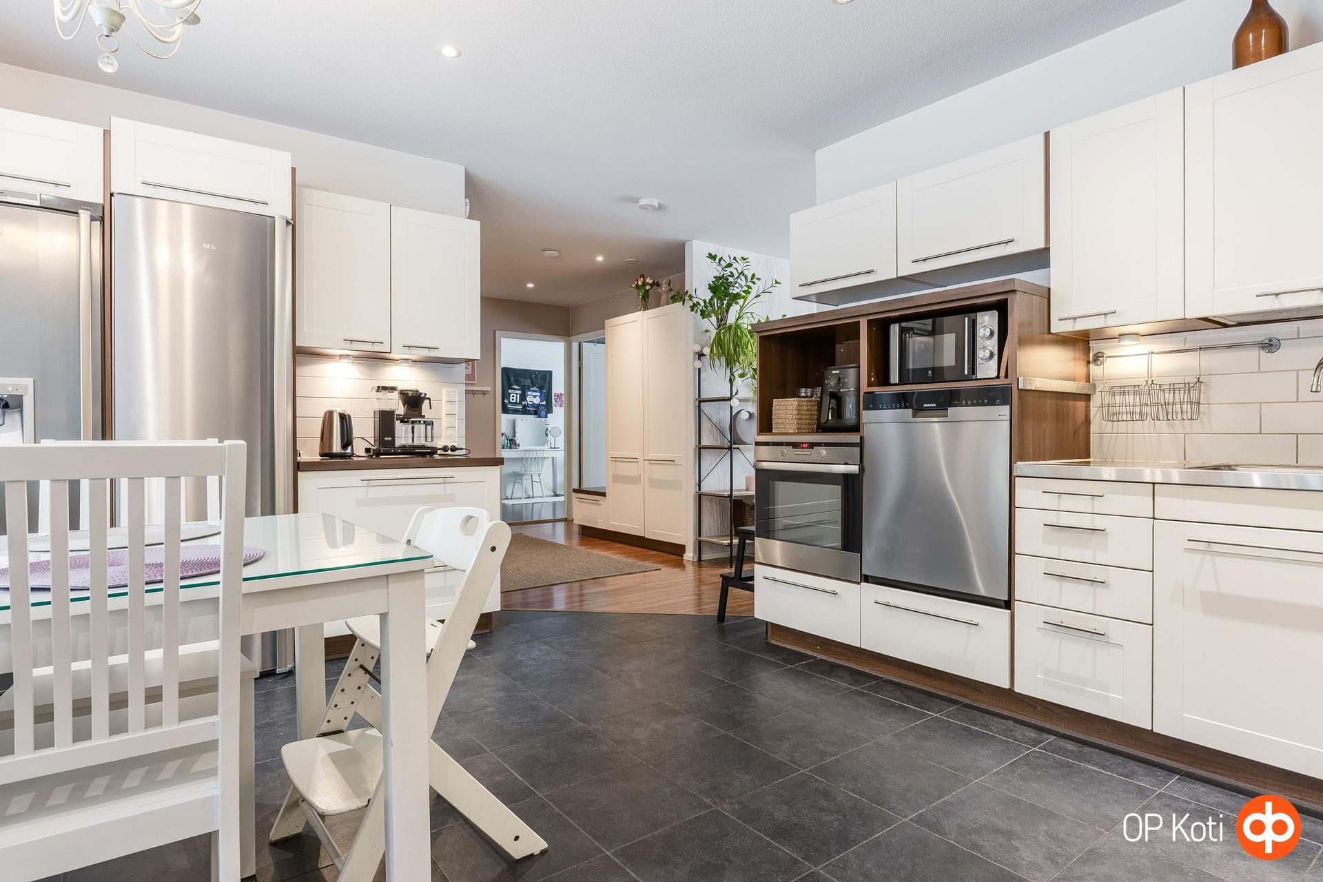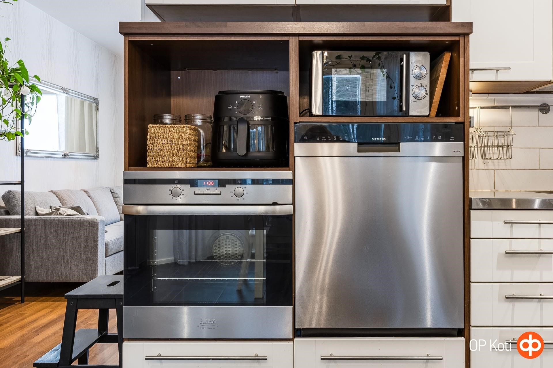 - Jääkaappi, pakastekaappi, erillisuuni, keraaminen liesi, liesituuletin, astianpesukone, kaapistot. Puustellin keittiö