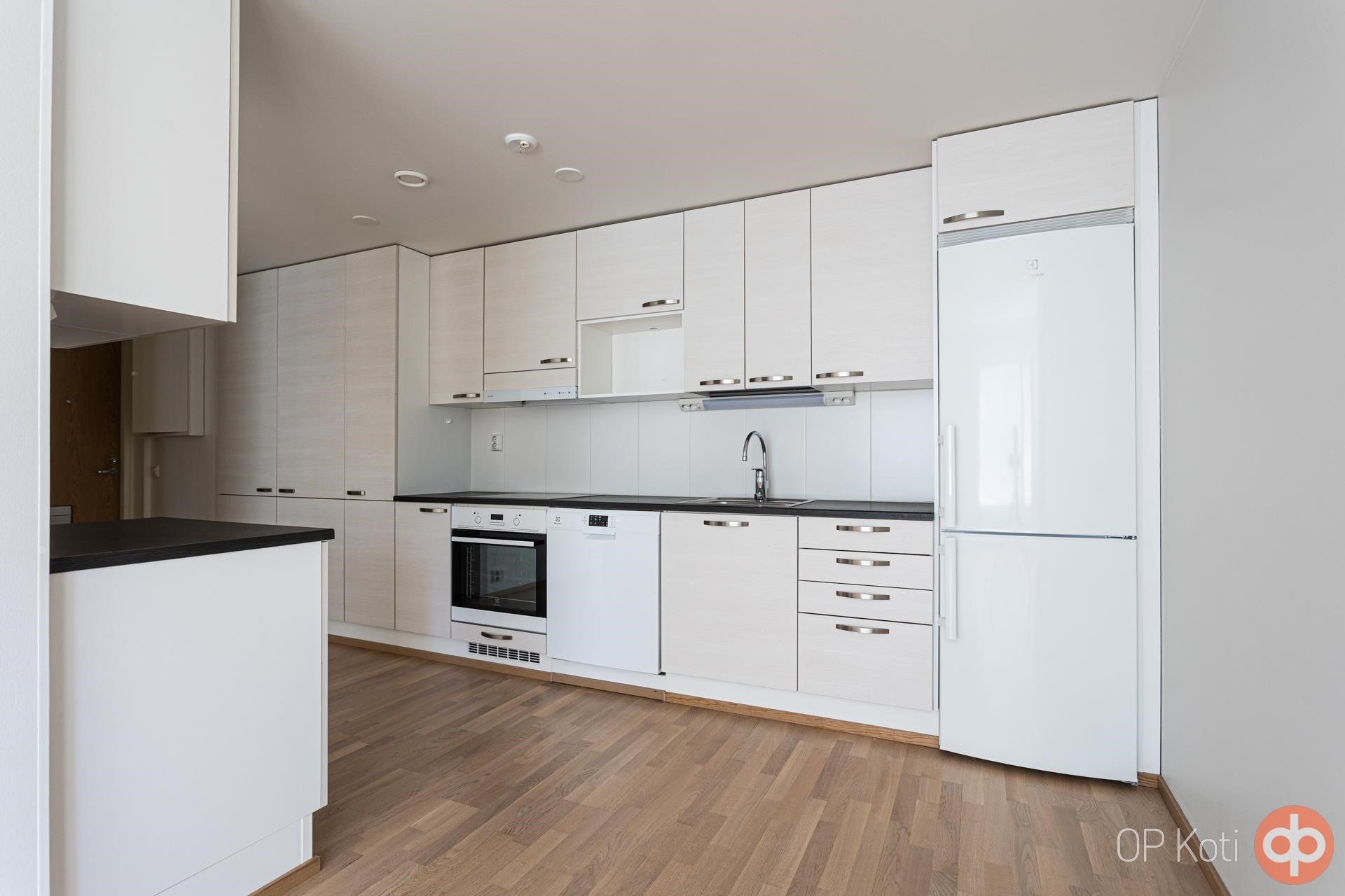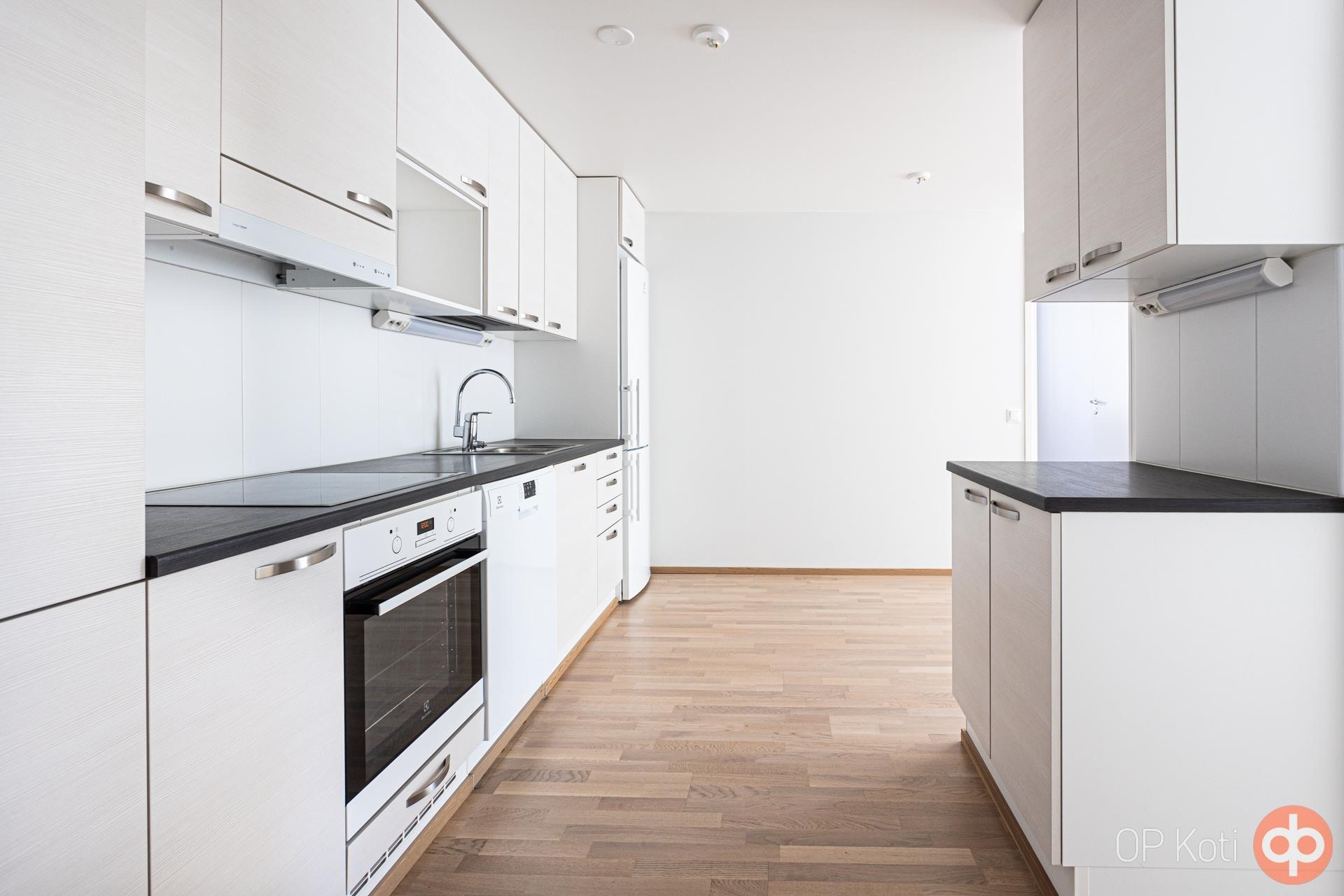 - Jääkaappipakastin, erillisuuni, liesitaso keraaminen, liesituuletin, astianpesukone, kaapistot, kiinteät valaisimet.