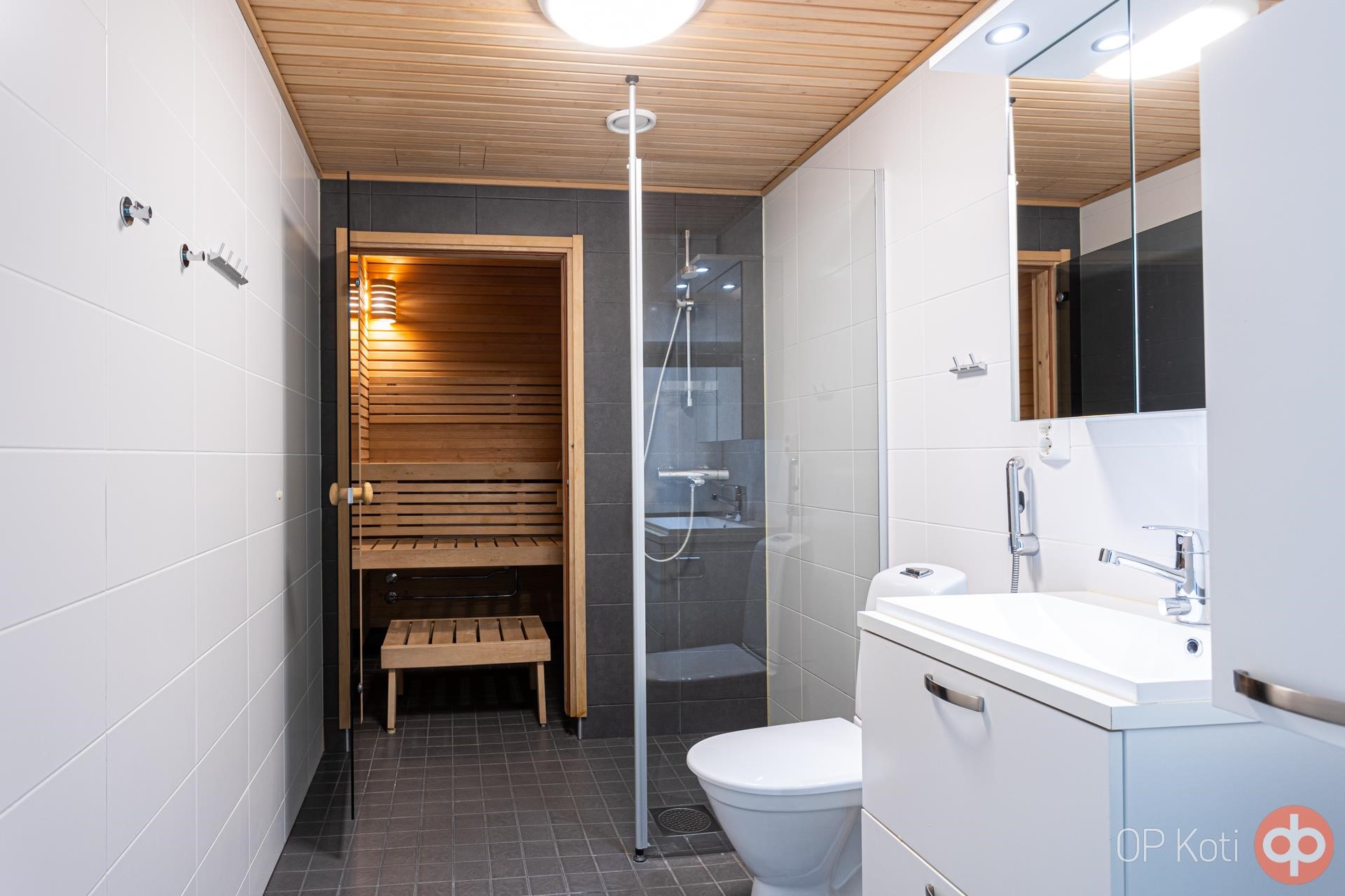 - Sauna, sähkökiuas, kylpyhuone, suihku, peilikaappi, kiinteät valaisimet.