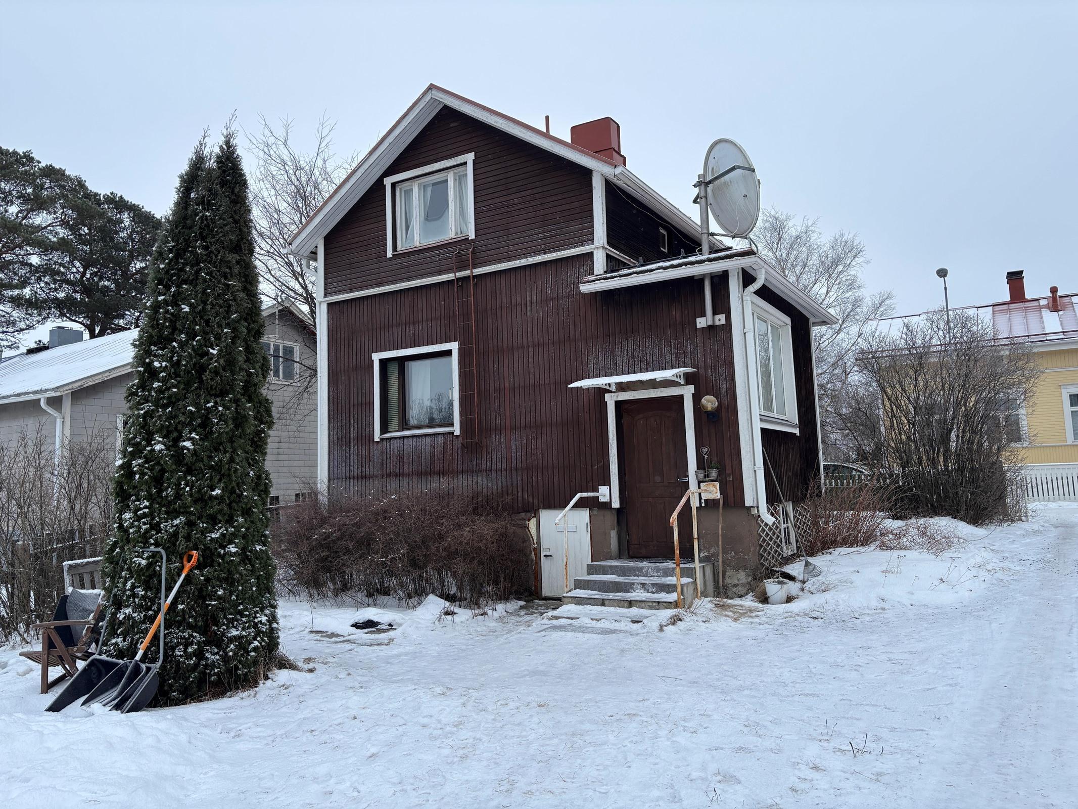 - 60 m2Yläkerrassa huone ja kylmä ullakko. Asuinkerroksessa wc, keittiö ja olohuone ja kuisti. Kellarissa sauna ja pukuhuone. Pinta-ala on arvio, ulkomittojen mukaisesti