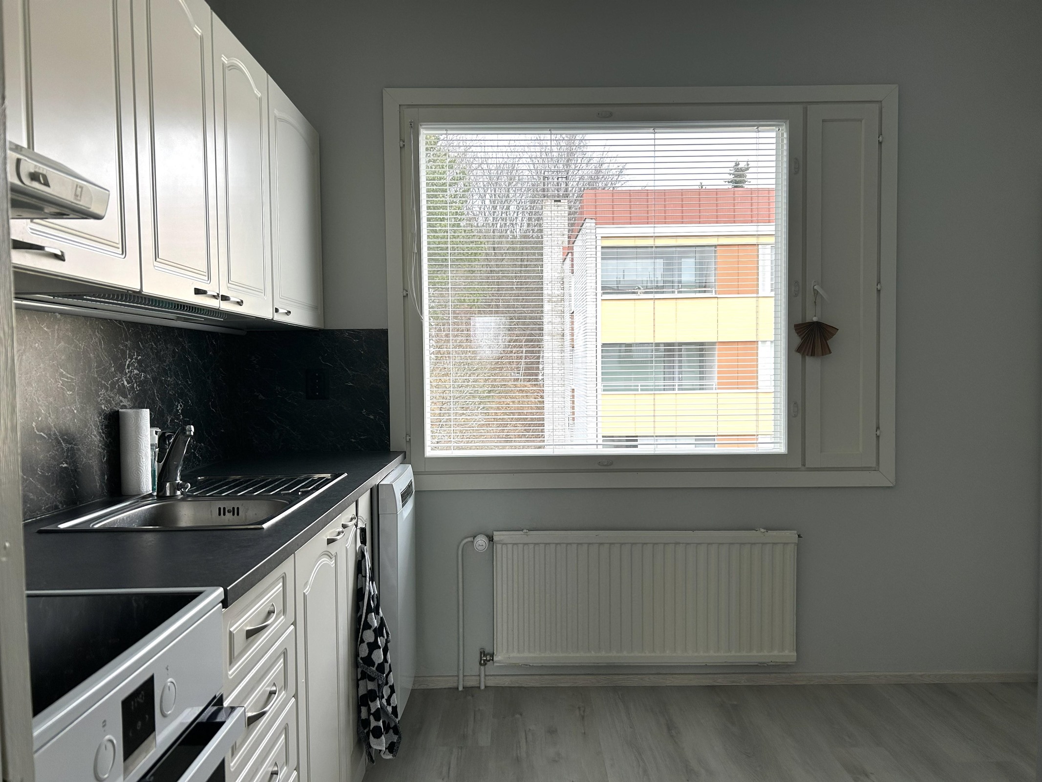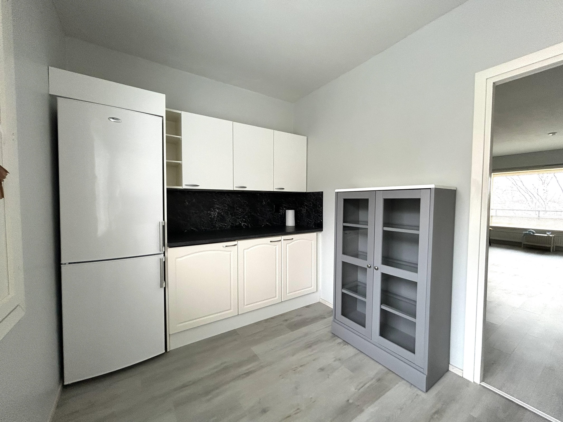 - Jääkaappipakastin, keraaminen liesi, astianpesukone, kaapistot, kiinteät valaisimet.