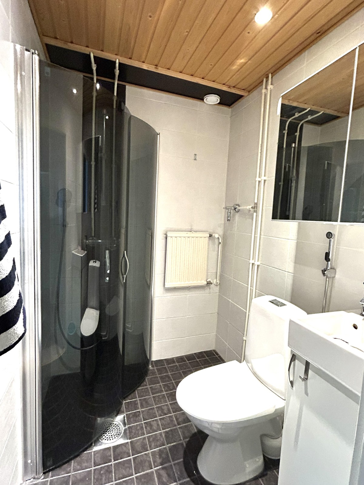 - Kylpyhuone, suihku, suihkuseinä, peilikaappi, allaskaappi, kiinteät valaisimet.