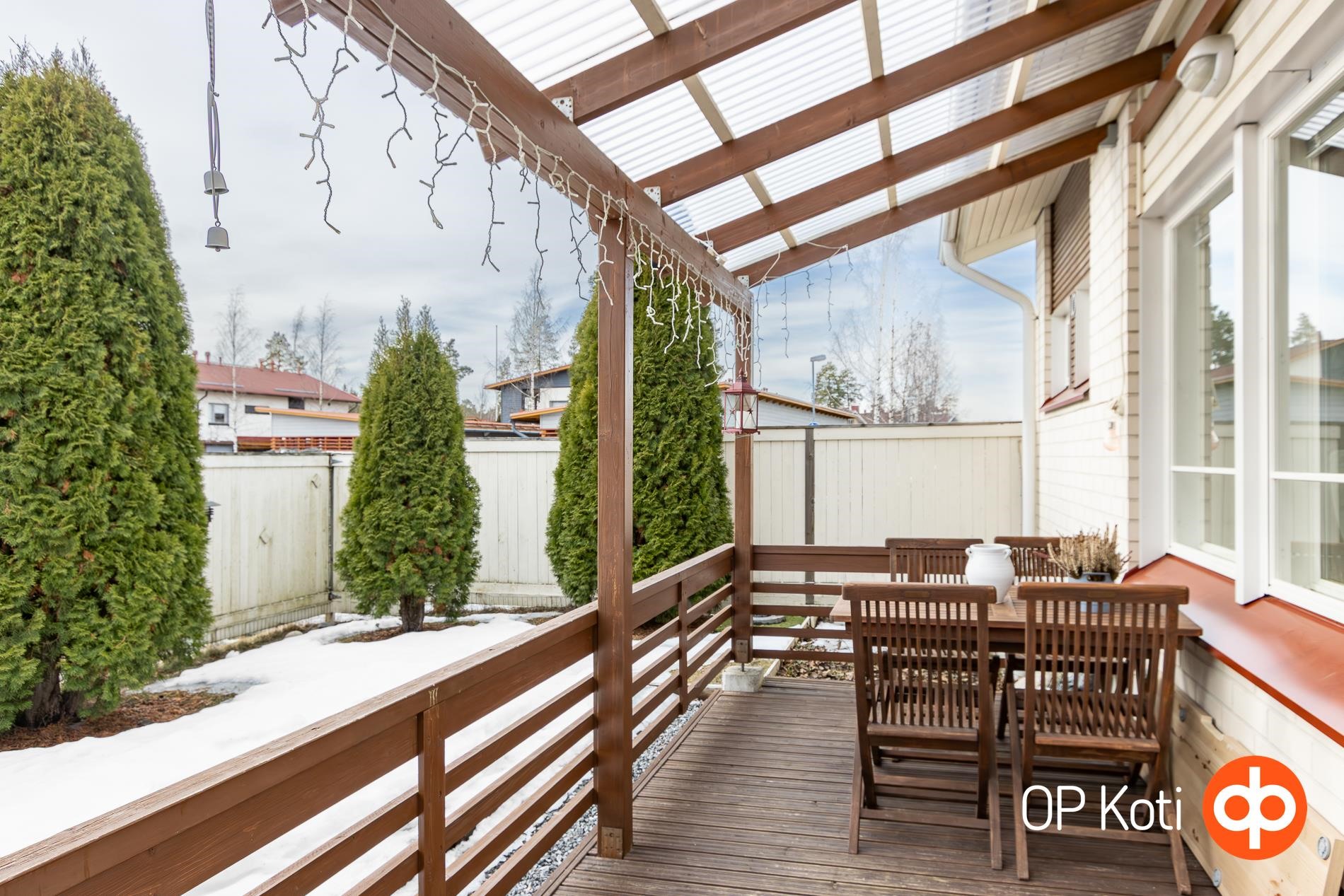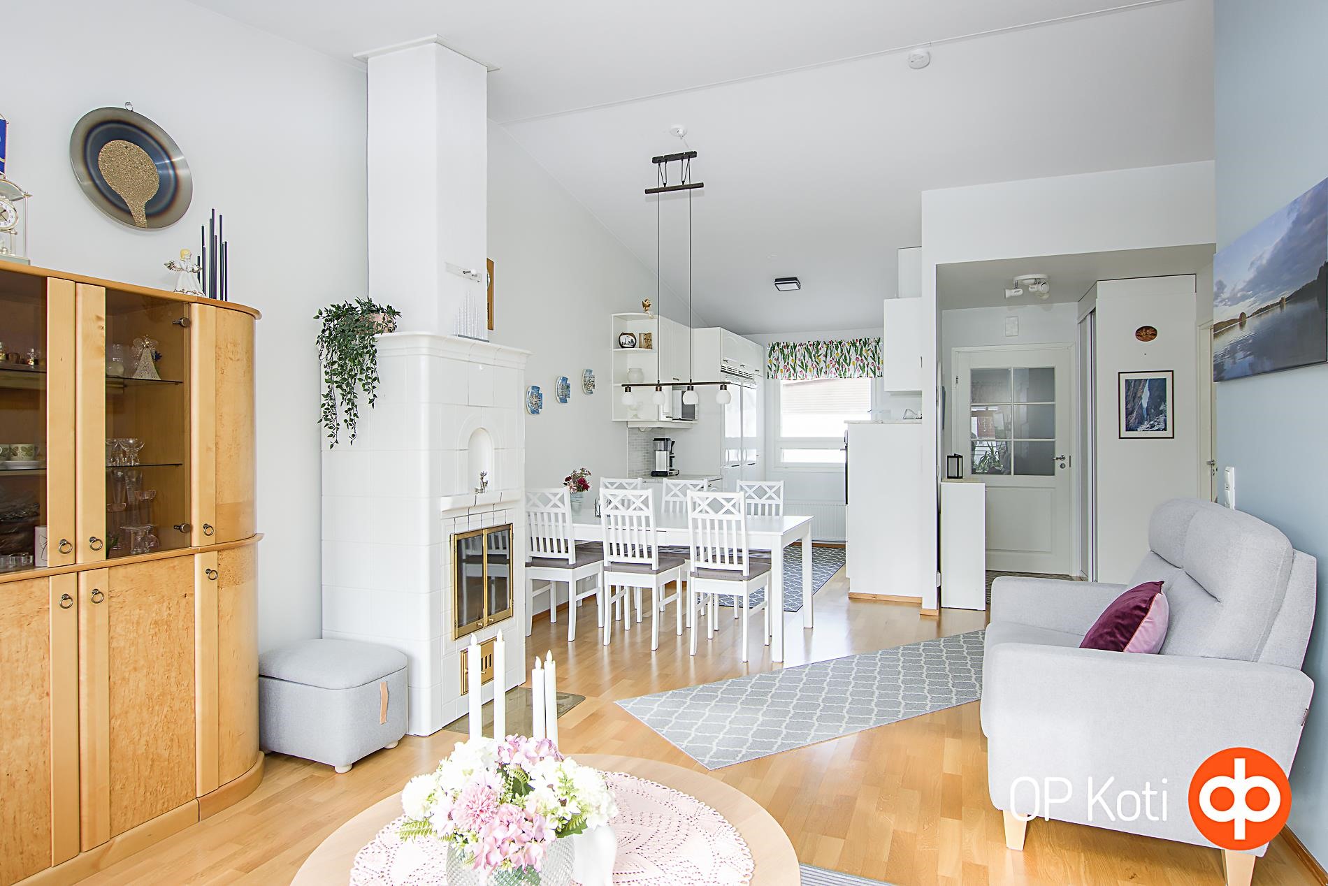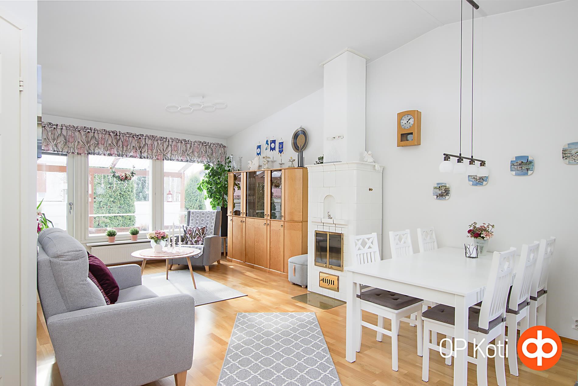 Pohjaratkaisu on erittäin toimiva ja kaikki neliöt otettu huomioon mainiosti. Keittiössä on reilusti kaapistoja ja riemastuttavan paljon laskutilaa. Ruokailutilaan mahtuu isompikin ruokapöytä ja avoin olohuoneyhteys lisää tilantuntua entisestään. Olohuoneessa on tyylikäs takka, upea korotettu sisäkatto ja käynti aurinkoiselle aidatulle takapihalle. Suojaisalla takapihalla on käytännöllinen terassi sekä nurmipihaa viherpeukalolle unohtamatta pientä kasvimaata.