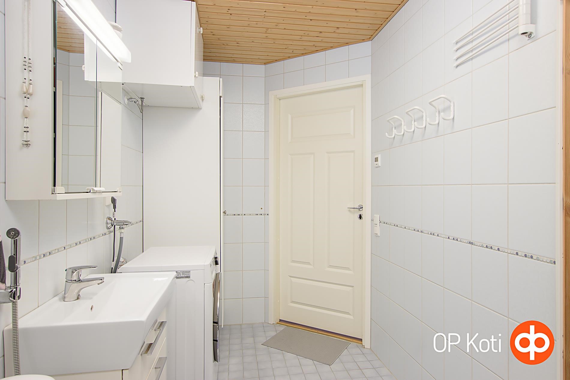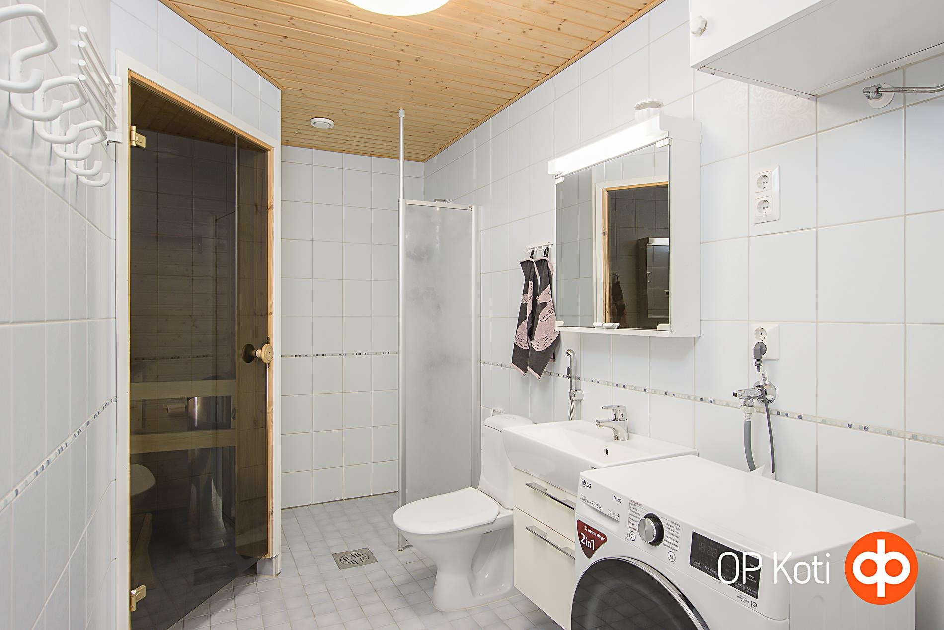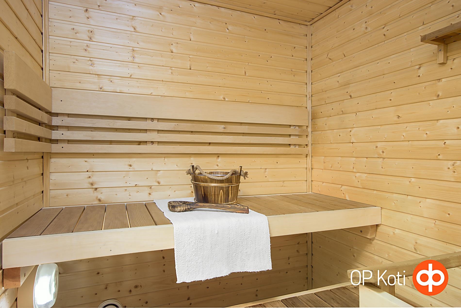 Kylpyhuoneen yhteydessä on kodinhoitotilaa ja saunan lempeissä löylyissä kelpaa nautiskella arjen kiireet pois hartioilta. Säilytystilaa ei tästä kodista puutu: kaapistojen lisäksi kodin edessä on tilava ulkovarasto ja erillinen lämminvarasto yhtiön tiloissa.