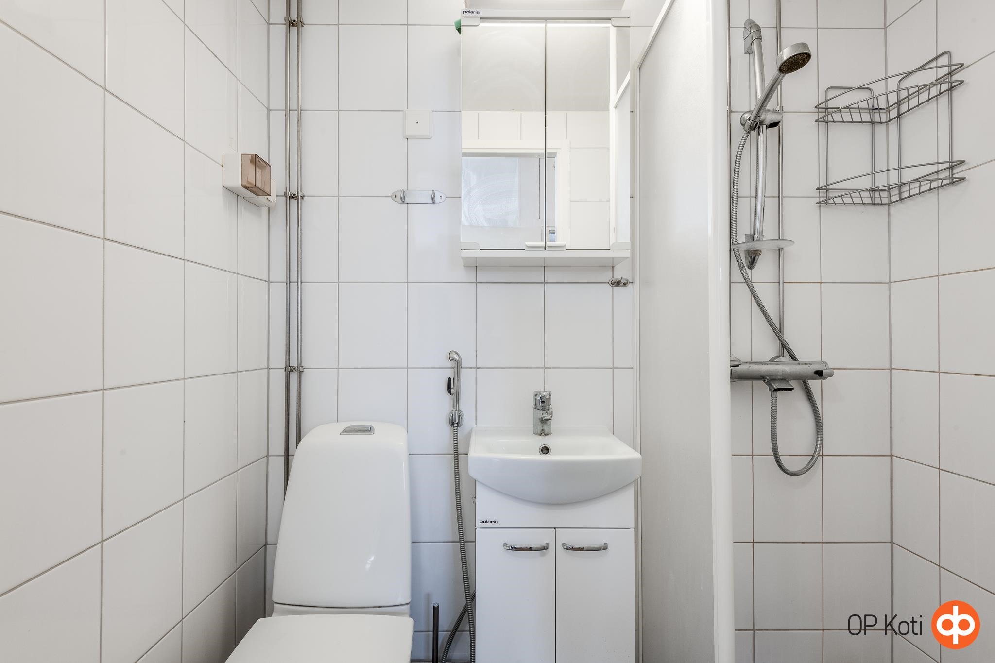 - Kylpyhuone, suihku, suihkuseinä, peilit, peilikaappi, kaapit, allaskaappi, pesukoneliitäntä, kiinteät valaisimet. Ei pesukoneelle tilaa.
