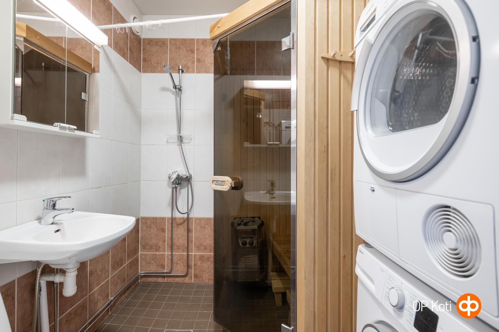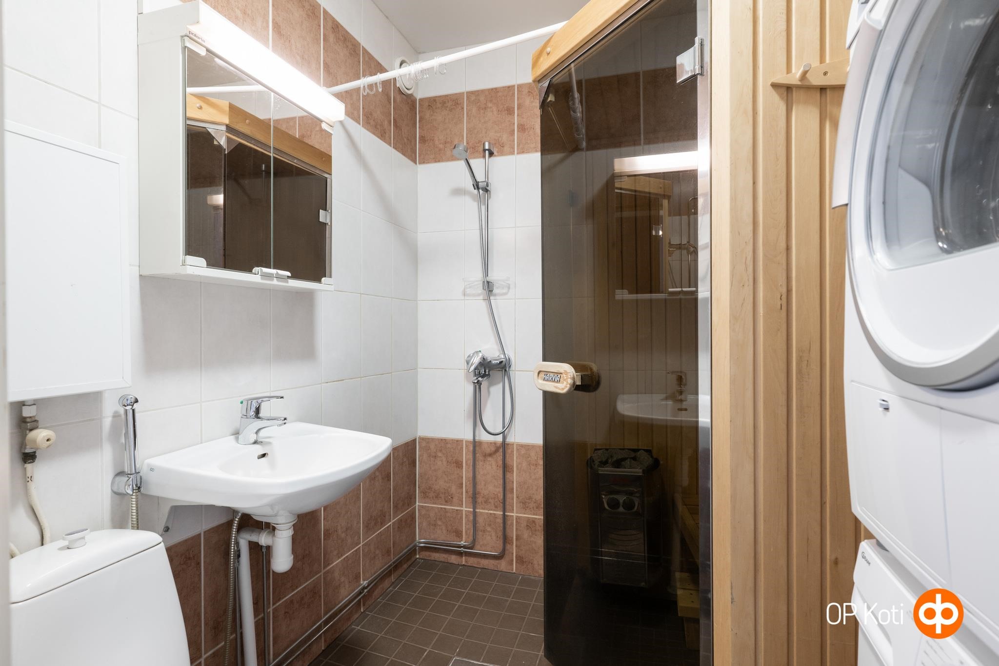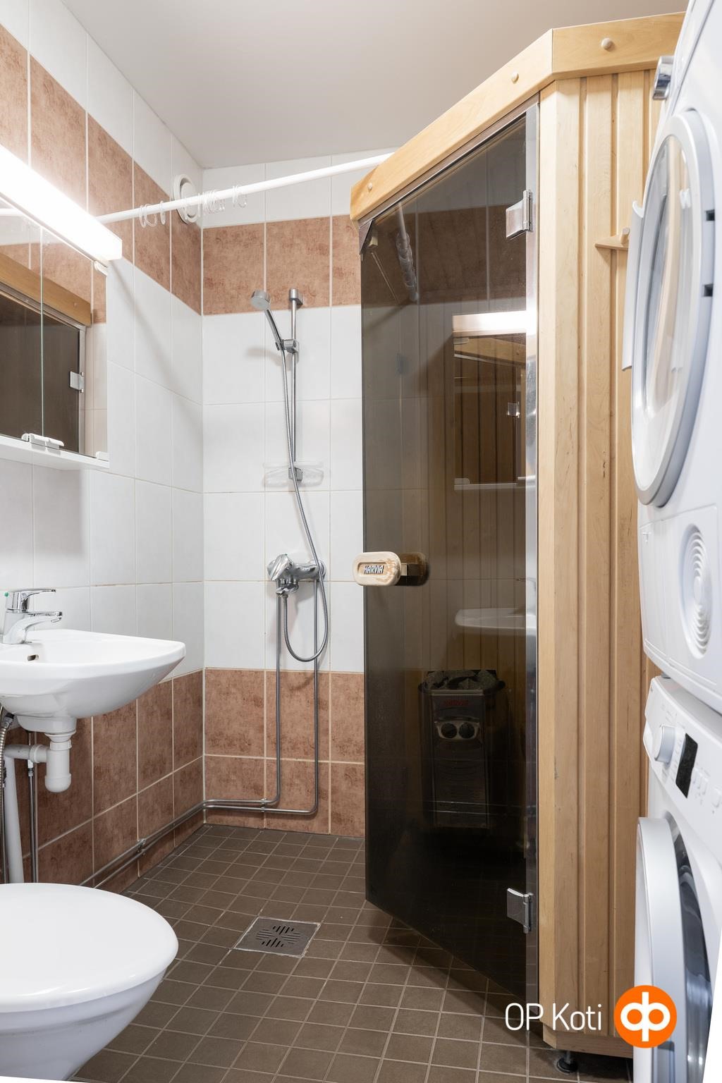 - Kylpyhuonesauna, sähkökiuas, kylpyhuone, suihku, peilikaappi, pesukoneliitäntä, lattialämmitys, kiinteät valaisimet.