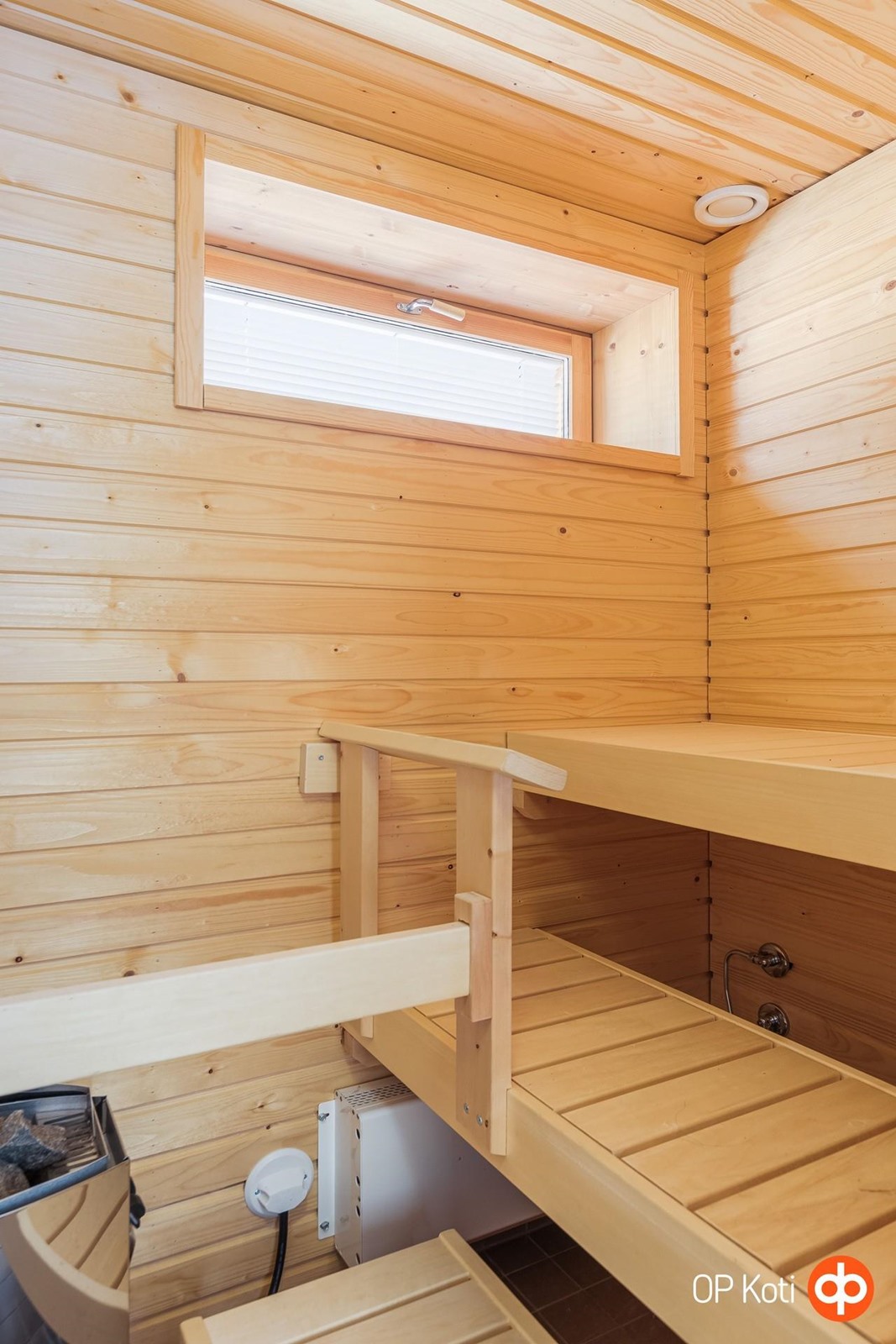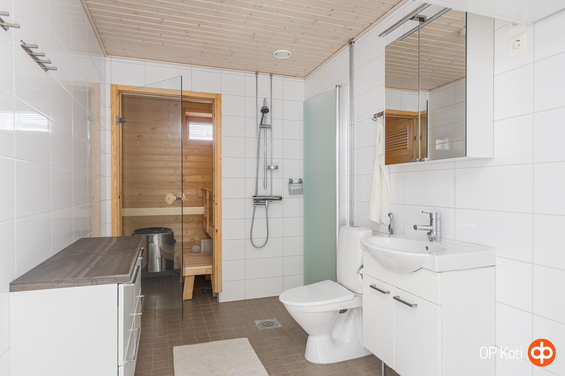 - Sauna, sähkökiuas, kylpyhuone, suihku, suihkukulma, peilikaappi, kaapit, allaskaappi, pesukoneliitäntä ja lattialämmitys.
