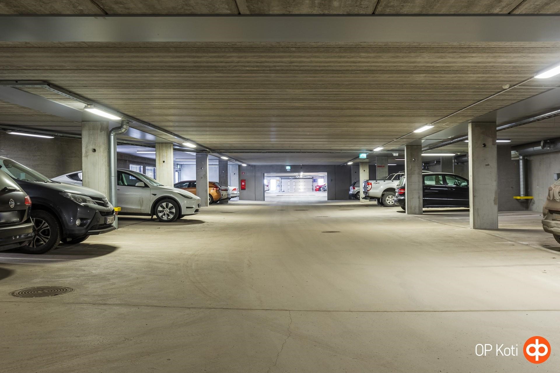 Taloyhtiön pihakannen alla on autohalli, josta on suora kulku sisäkautta rakennukseen.