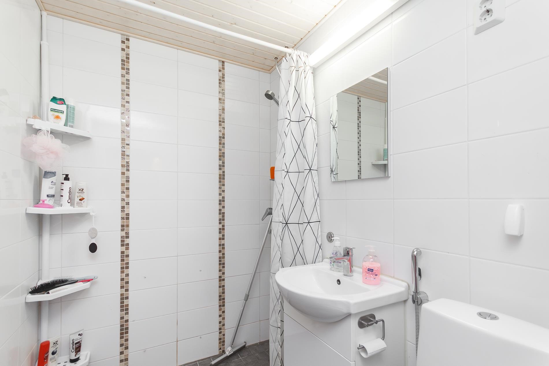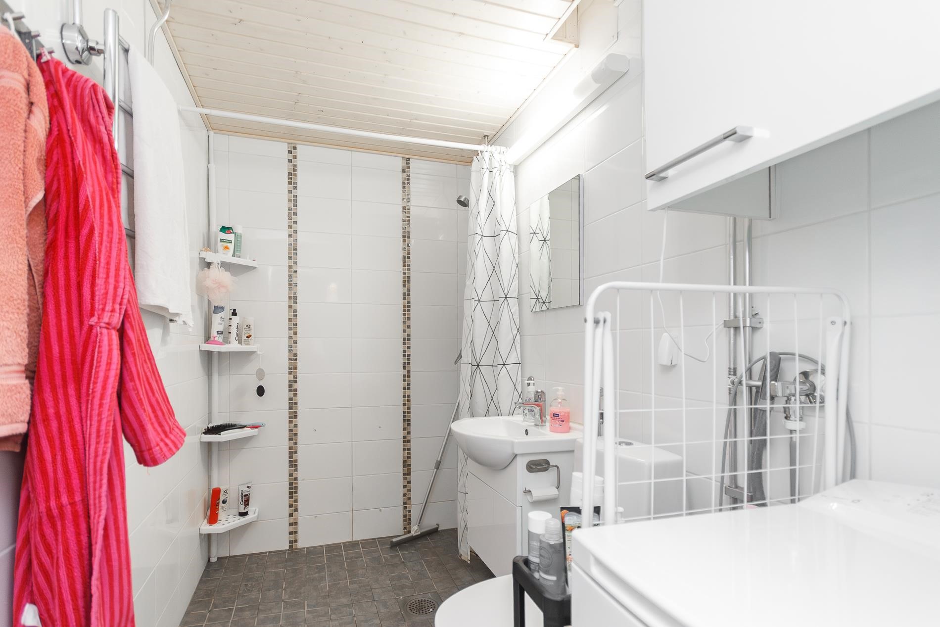 - Kylpyhuone, suihku, peilit, allaskaappi, pesukoneliitäntä, kiinteät valaisimet.