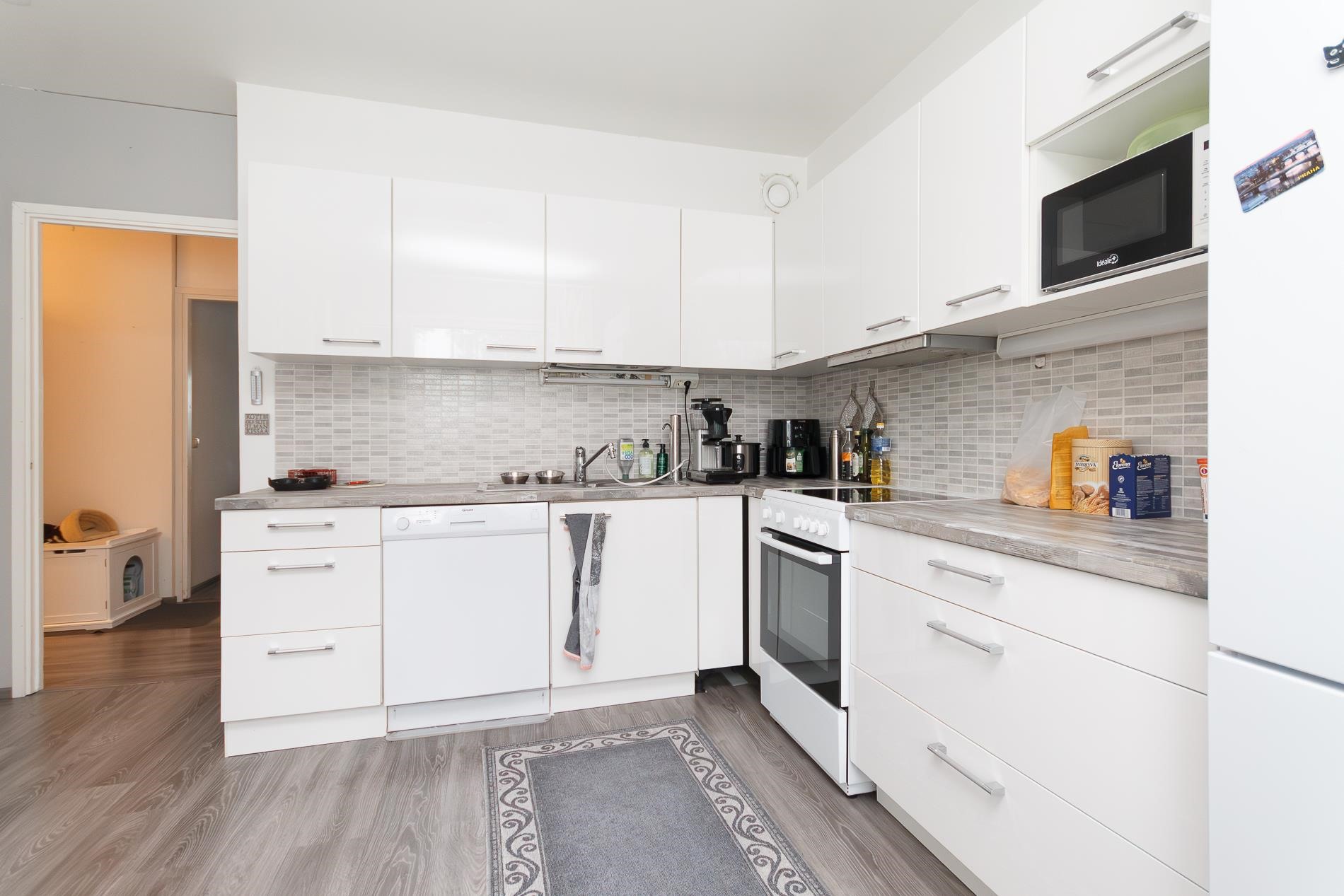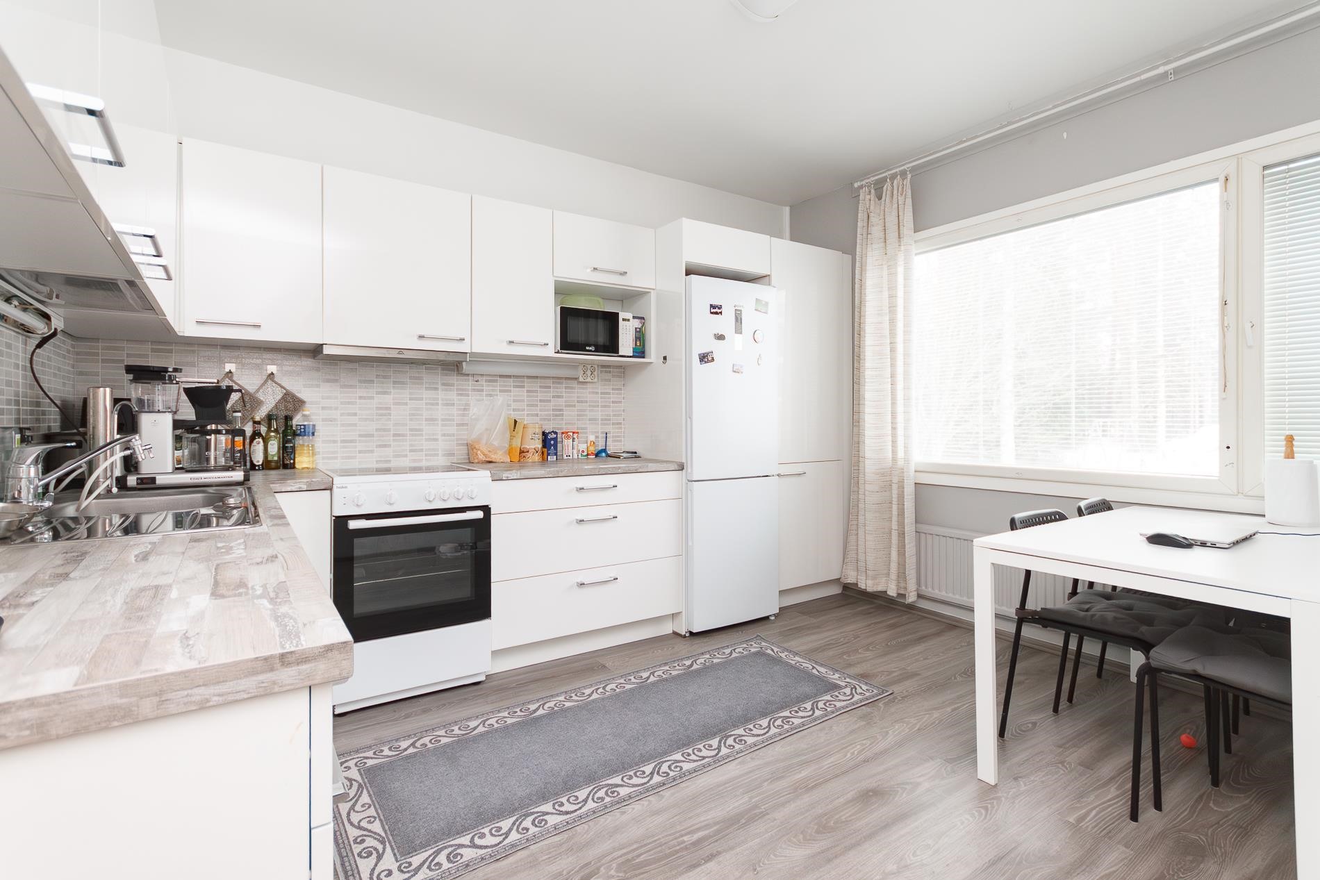Valoisassa keittiössä on tilaa kokkailla. Olohuoneesta on käynti lasitetulle parvekkeelle, josta on näkymät länteen päin. Kylpyhuoneessa on paikka pyykinpesukoneelle. Lasitetulta parvekkeelta on näkymät länteen päin.