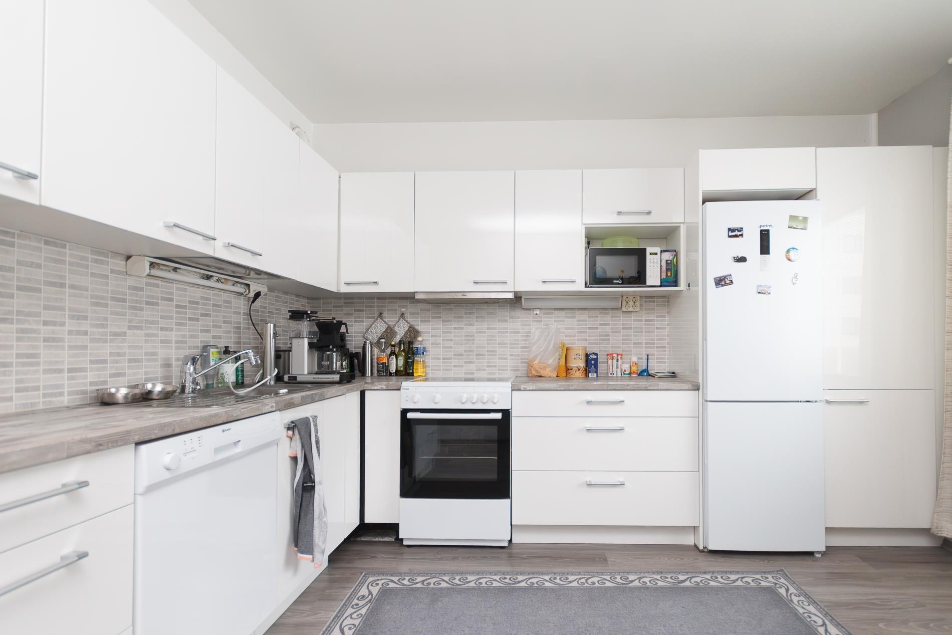 - Jääkaappipakastin, sähköliesi, liesituuletin, astianpesukone, kaapistot, kiinteät valaisimet.