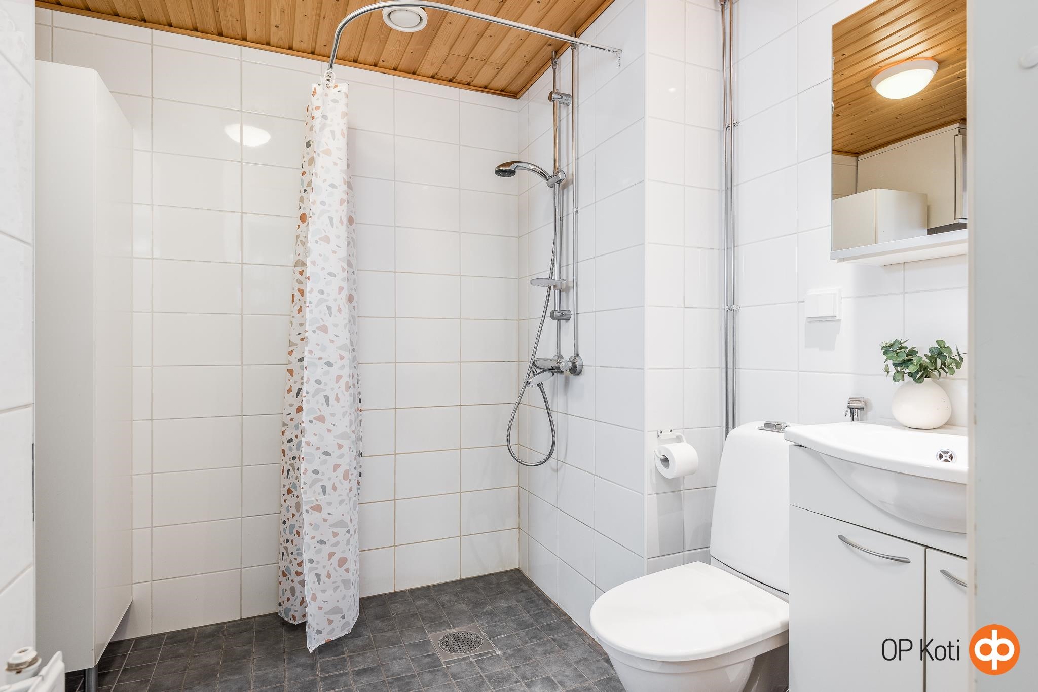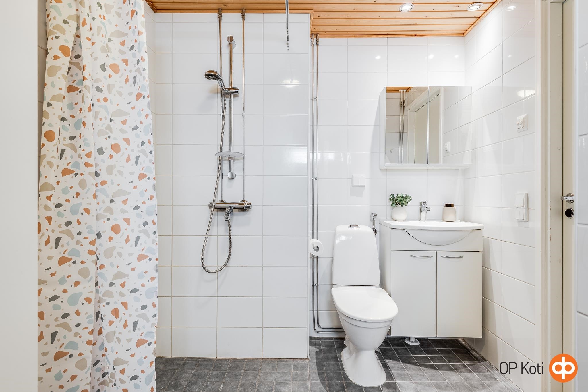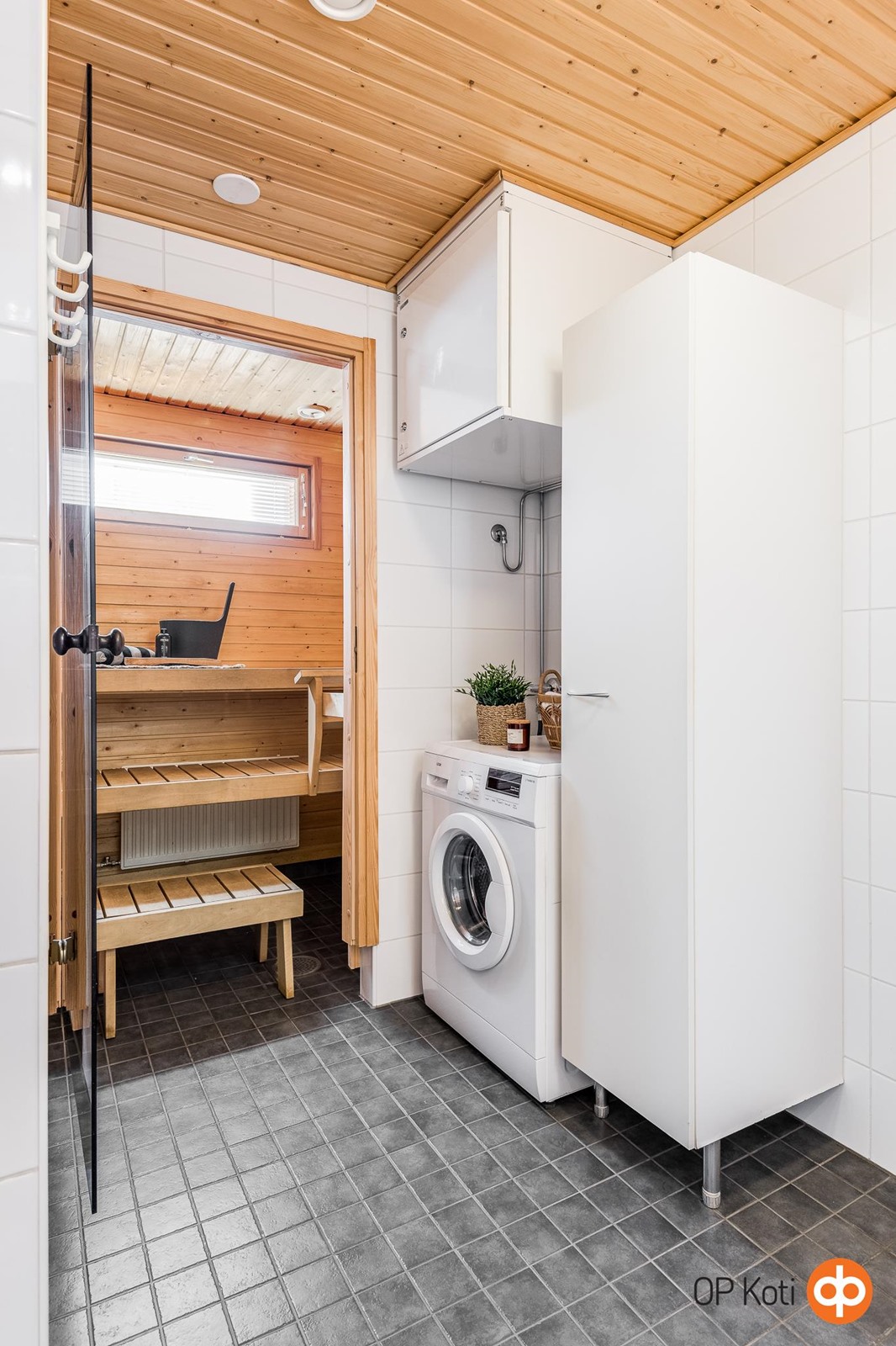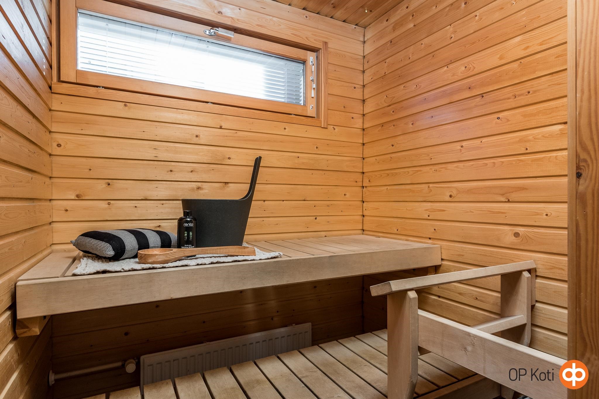 - Sauna, sähkökiuas, kylpyhuone, suihku, peilikaappi, kaapit, allaskaappi, pesukoneliitäntä, lattialämmitys, kiinteät valaisimet. -