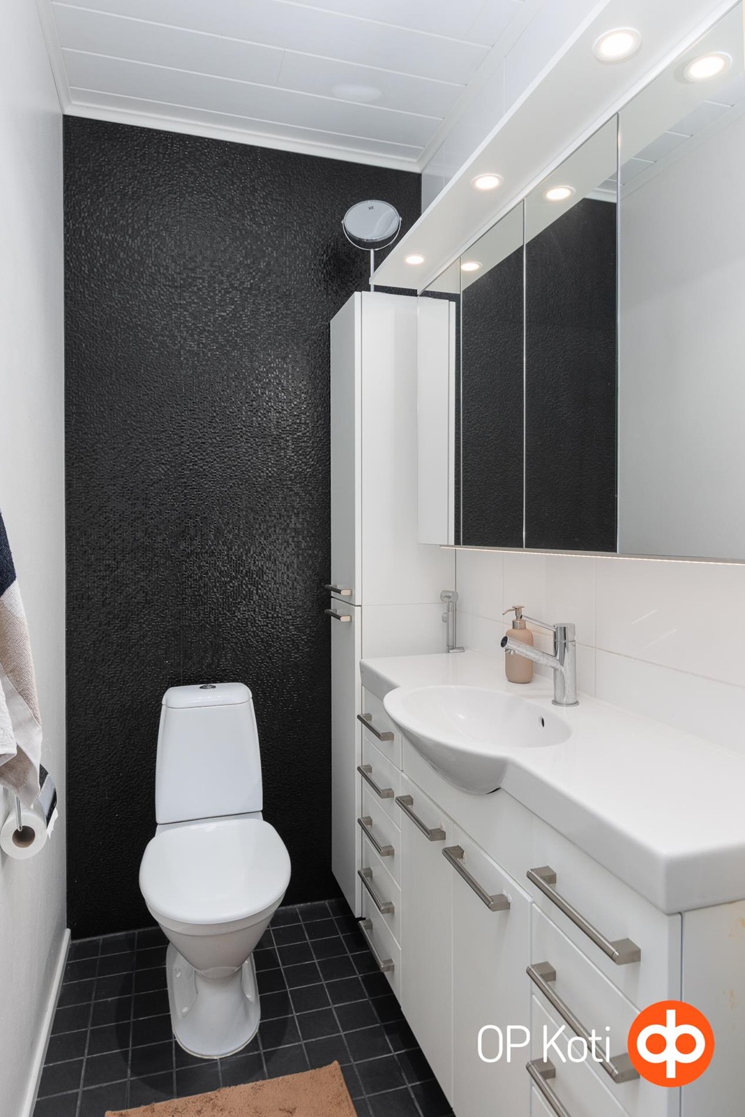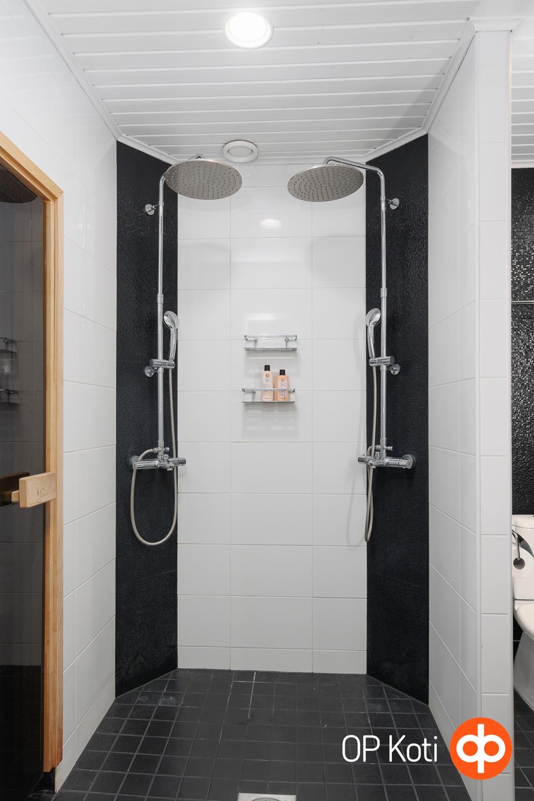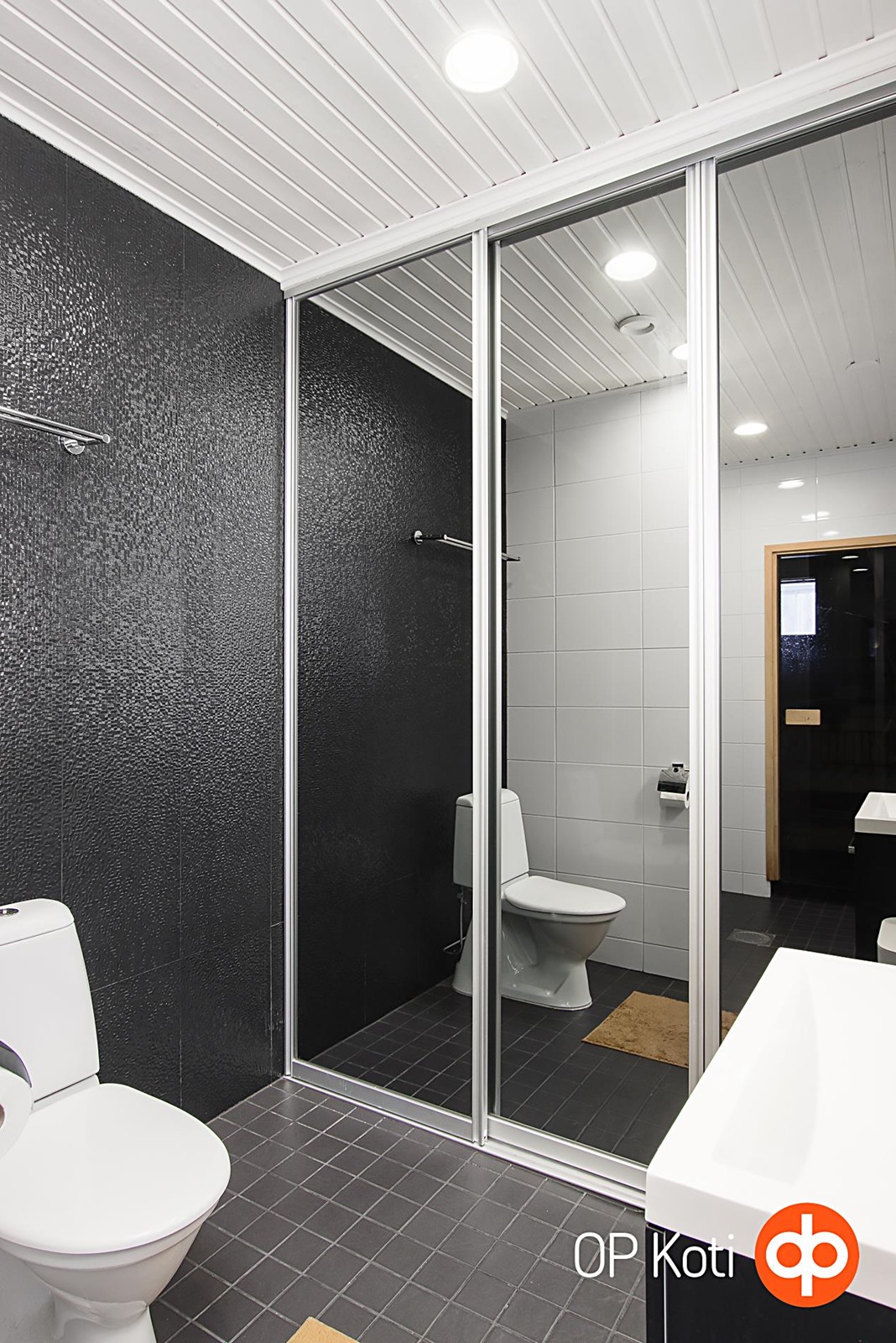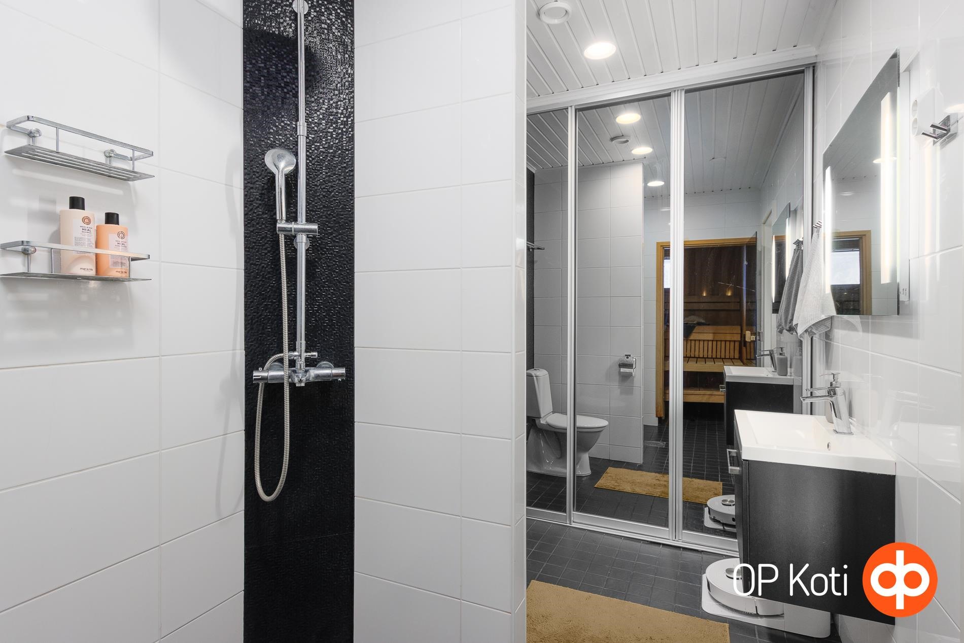 - Sauna, sähkökiuas, kylpyhuone, erillinen wc, suihku x2, peilit kph, peilikaappi wc:ssä, kaapit (liukuovikaapit kph), allaskaappi, pesukoneliitäntä, lattialämmitys, kiinteät valaisimet.