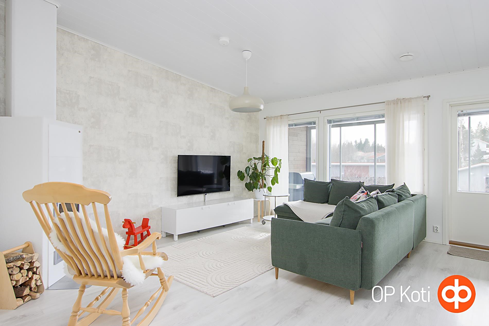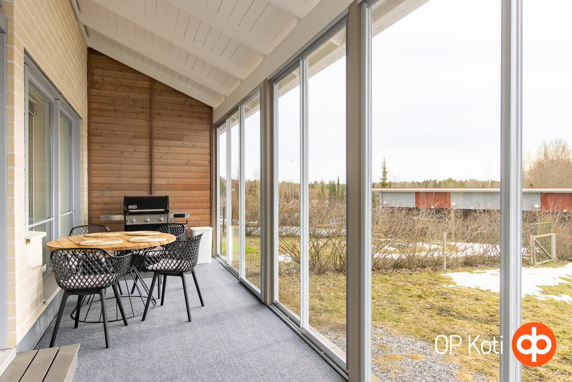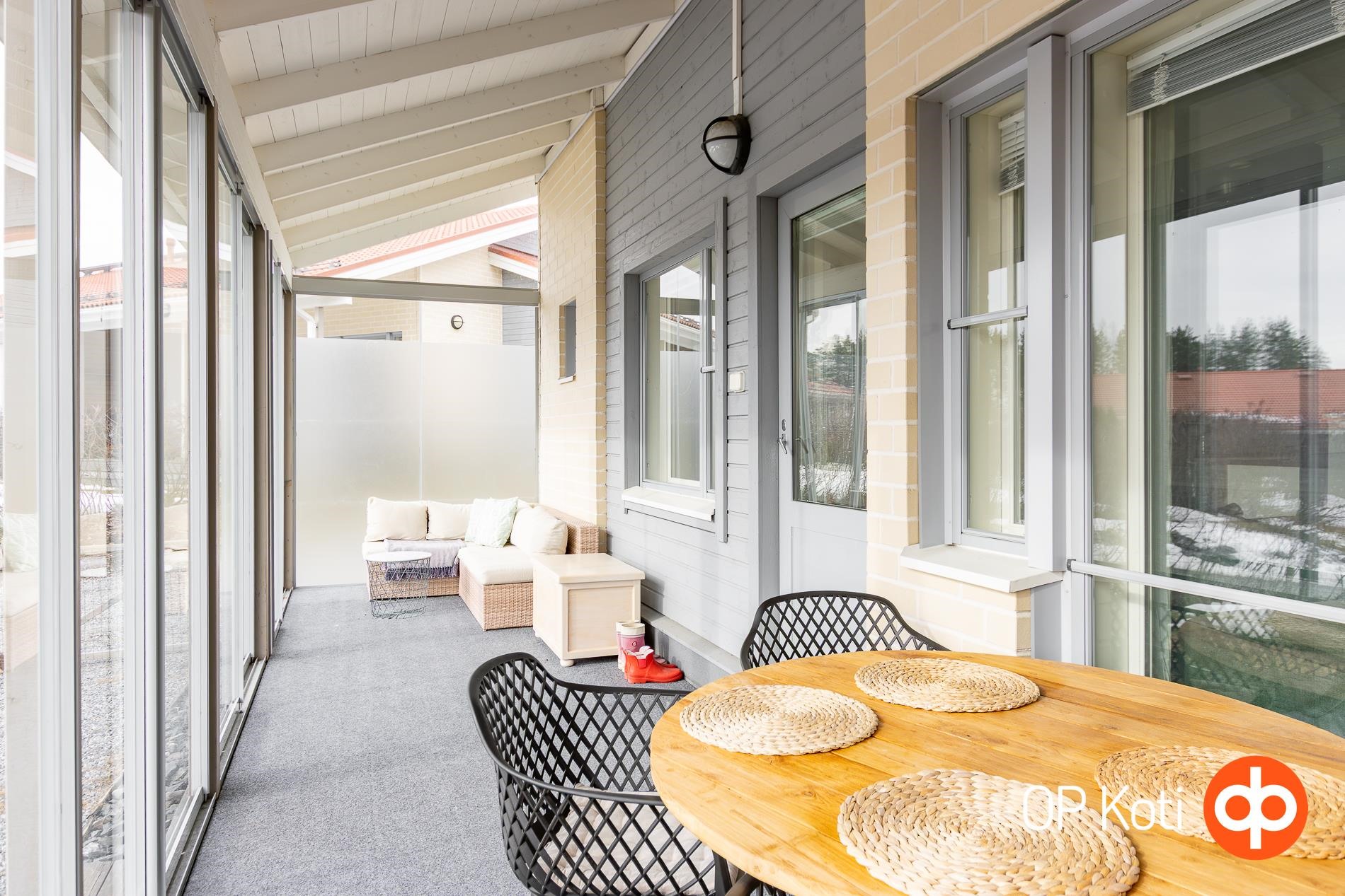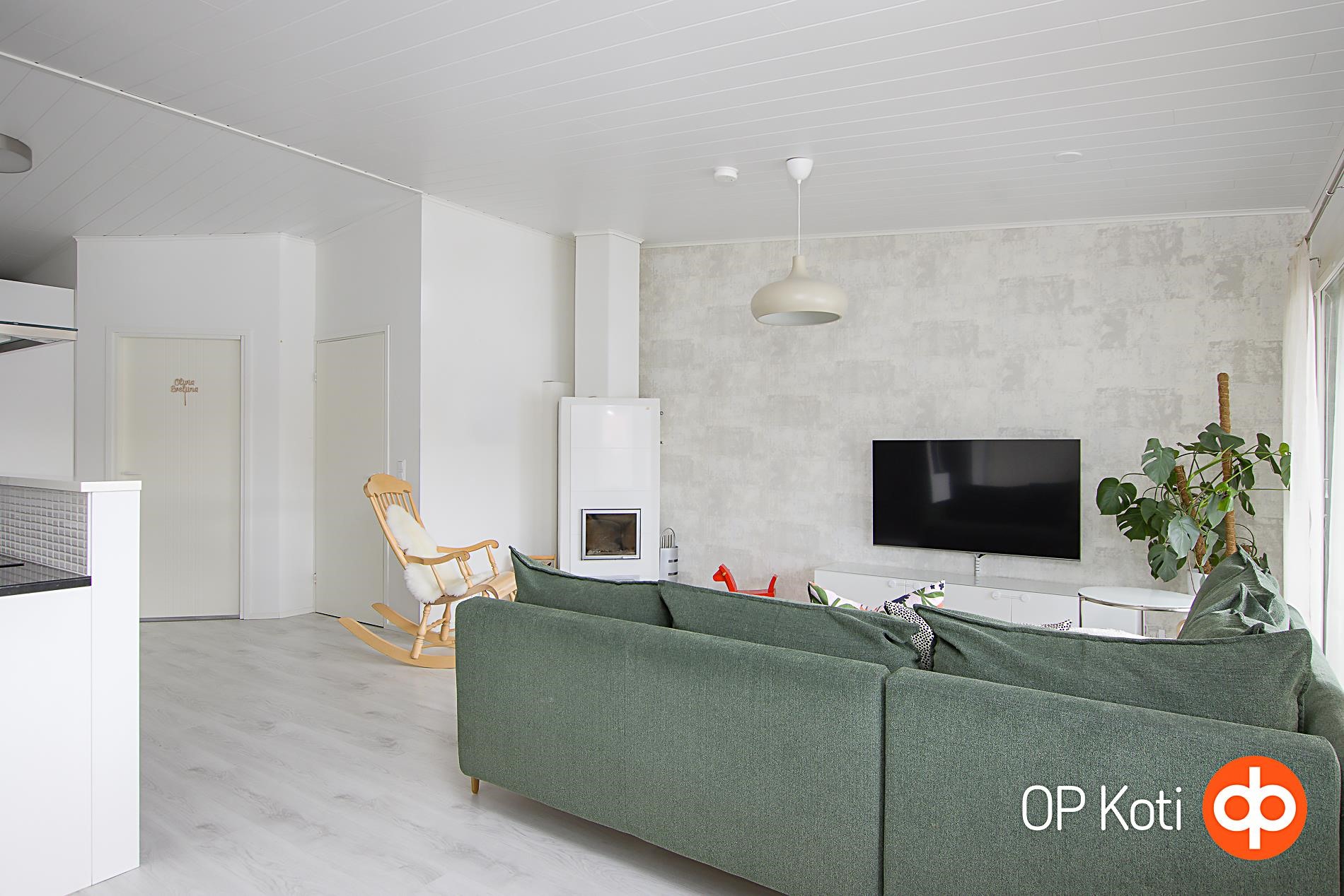 Tämä valoisa ja avara koti hurmaa jo ensisilmäyksellä. Keittiö ja olohuone muodostavat avaran, yhtenäisen kokonaisuuden, jota korotettu sisäkatto korostaa entisestään. Kaunis takka tuo lisätunnelmaa kodin tunnelmaan. Olohuoneesta on käynti lasitetulle terassille, joka laajentaa oleskelutilaa pitkälle sesonkiin.