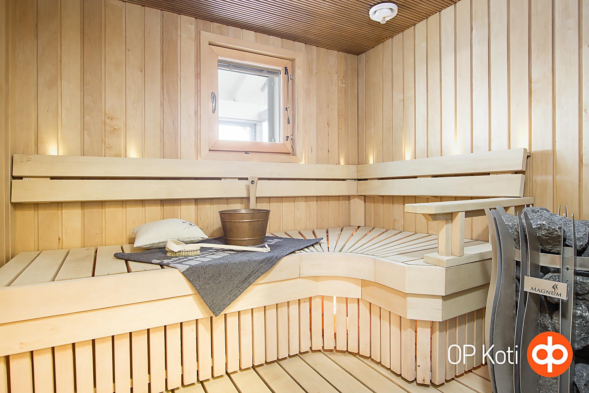 Tunnelmallisessa saunassa on pilarikiuas, ja lasiseinä tuo modernia ilmettä ja erottaa saunan pesutiloista tyylikkäästi. Kodinhoitotilat ovat käytännölliset ja toimivat hyvin arjen pyörittämisessä. Wc-tiloja on kaksi. Autoille on mahdollista hankkia katospaikka sekä pistokkeellinen pihapaikka erillisillä osakekirjoilla.