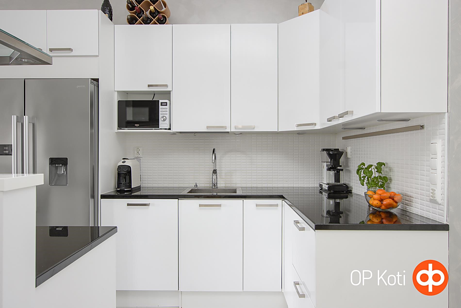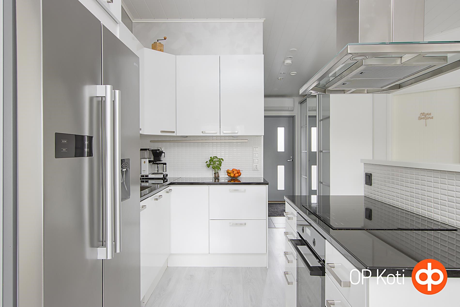 - Jääkaappipakastin side-by-side, erillisuuni, induktioliesi, liesituuletin, astianpesukone (integroitu), kaapistot, kiinteät valaisimet. Kivitasot