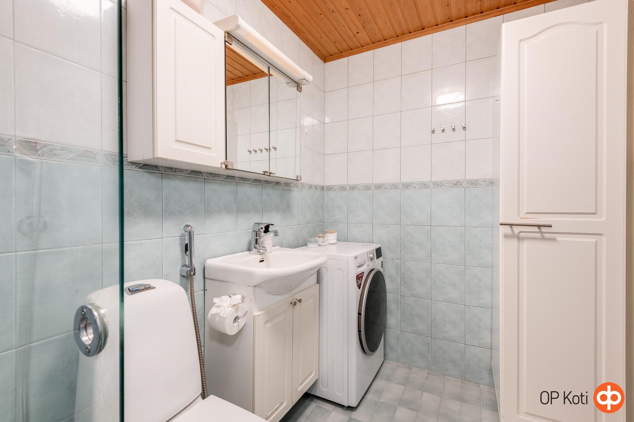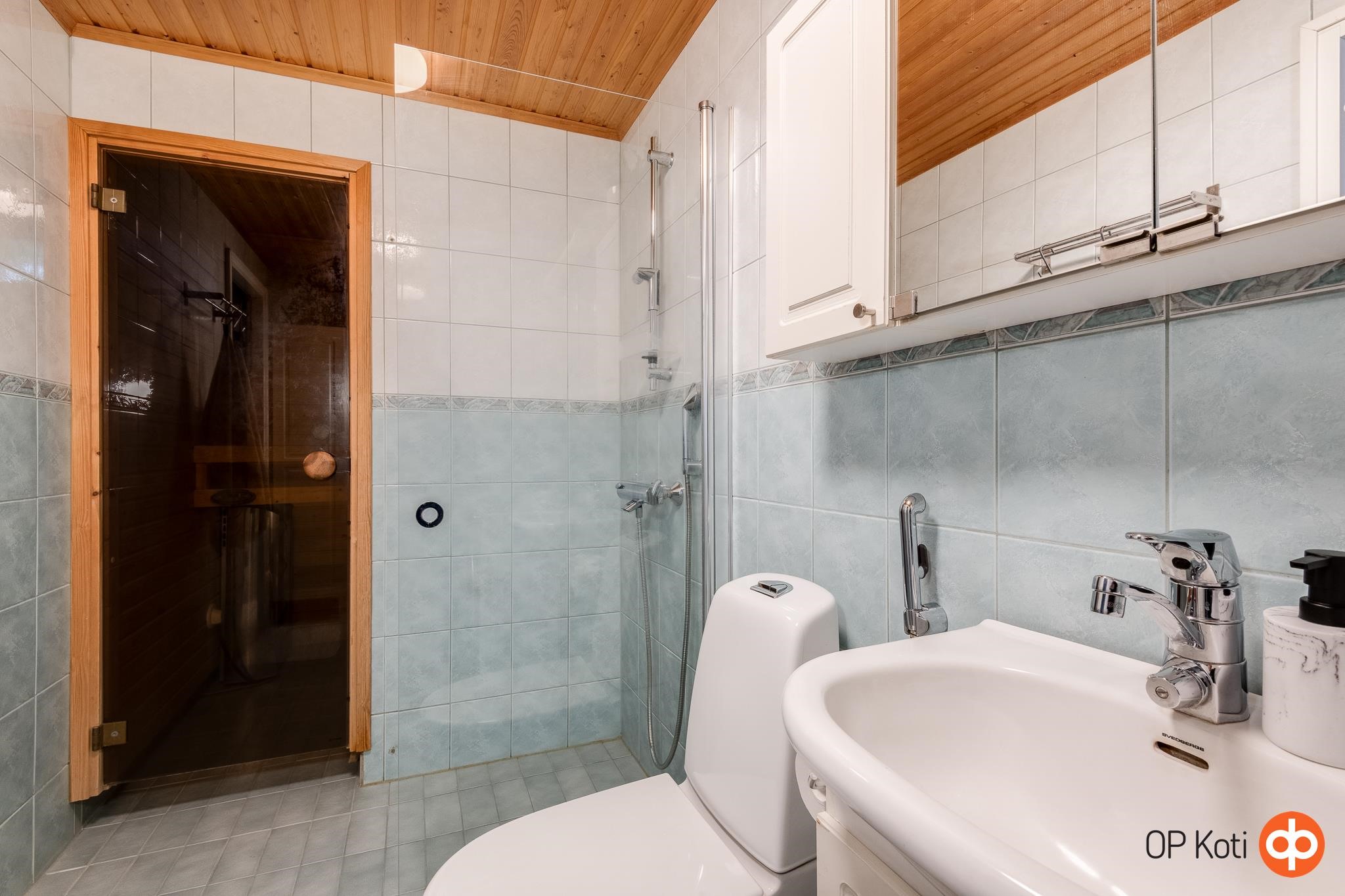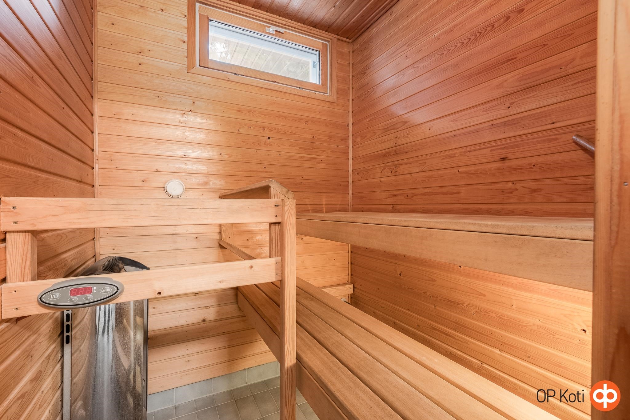 - Sauna, sähkökiuas, kylpyhuone, suihku, suihkuseinä, peilikaappi, allaskaappi, pesukoneliitäntä, lattialämmitys.