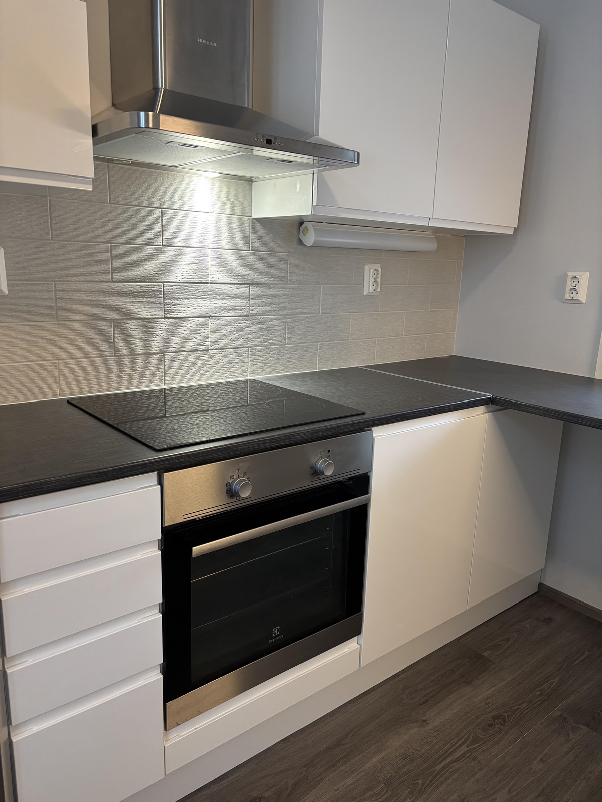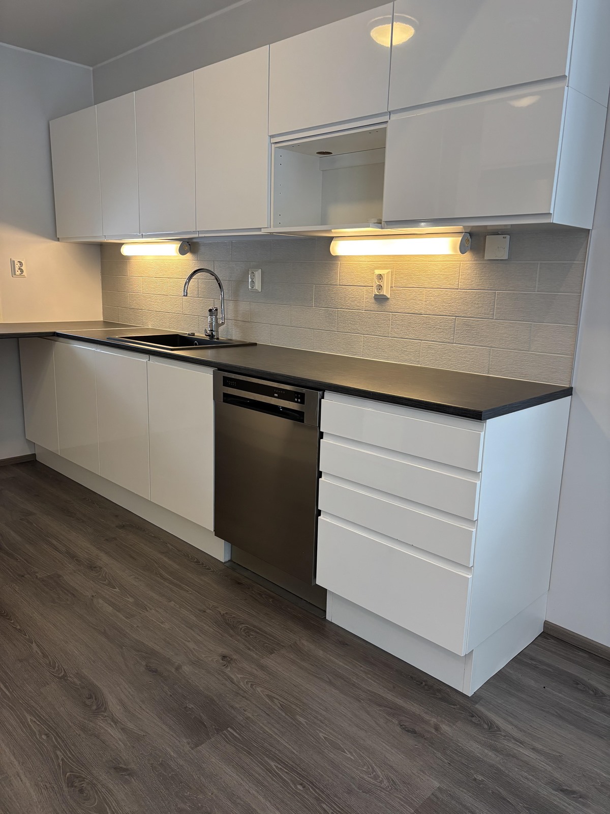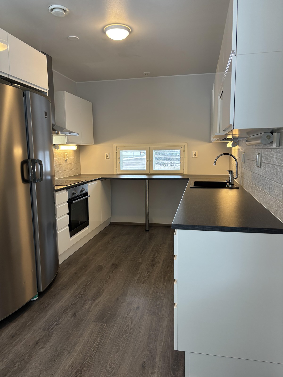 - Jääkaappipakastin, erillisuuni, liesitaso, induktioliesi, liesituuletin, astianpesukone, kaapistot, kiinteät valaisimet.