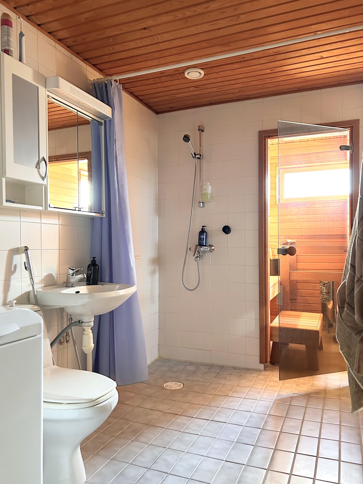 - Sauna on remontoitu 2023. Kylpyhuoneessa suihku, wc-istuin, peilikaappi, allaskaappi sekä pesukoneliitäntä.
