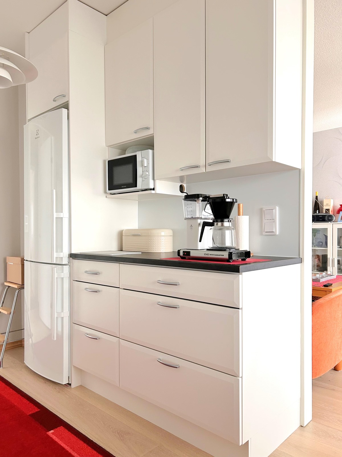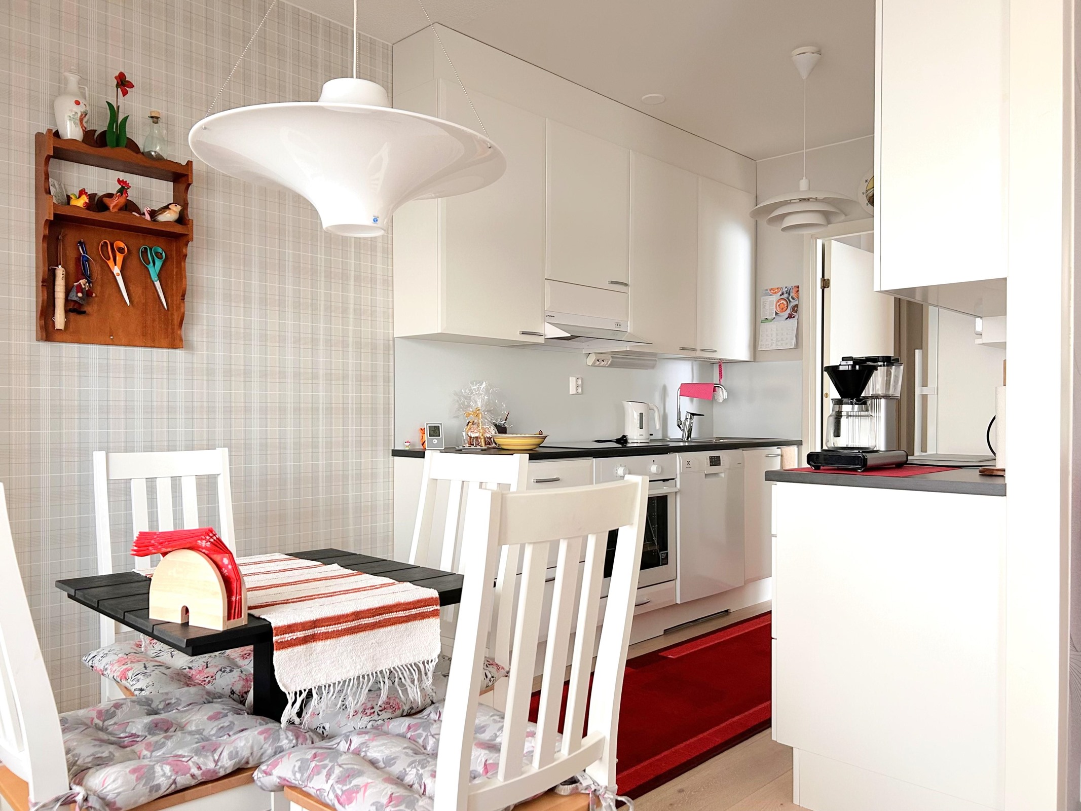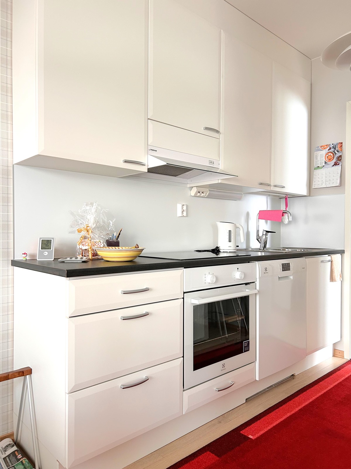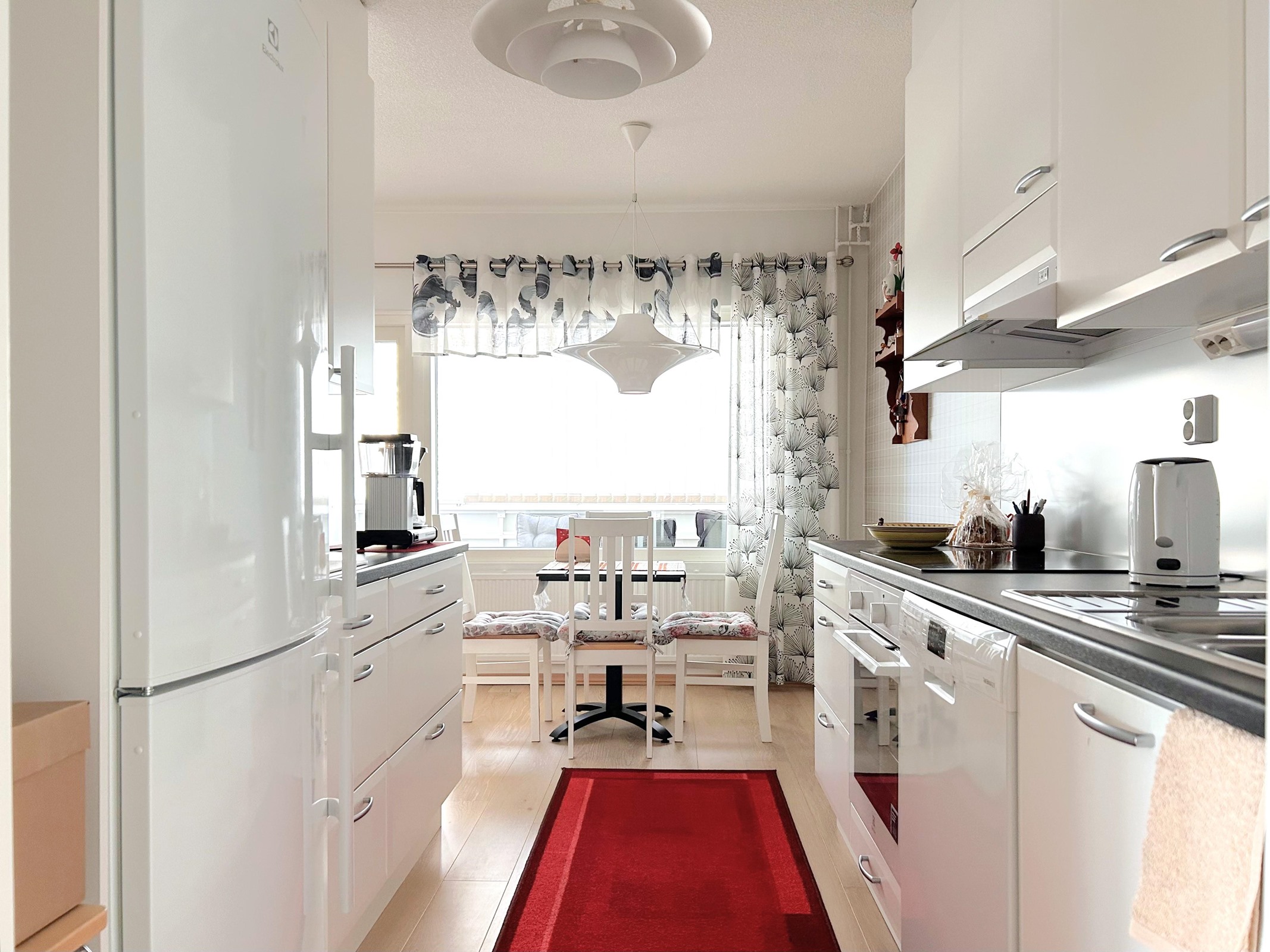- Vuonna 2021 uusitun keittiön varusteina jääkaappipakastin, erillisuuni, liesitaso, induktioliesi, liesituuletin, astianpesukone, kaapistot.