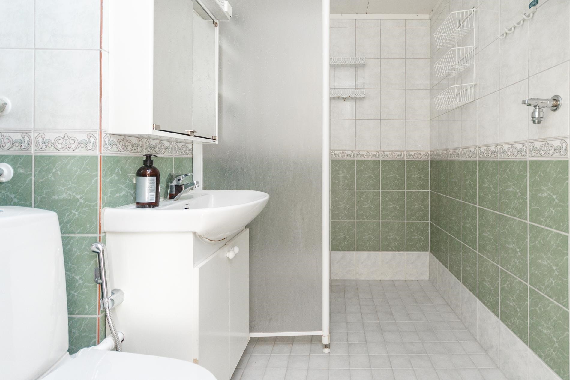 - Kylpyhuone, suihku, suihkuseinä, peilikaappi, allaskaappi, kiinteät valaisimet.