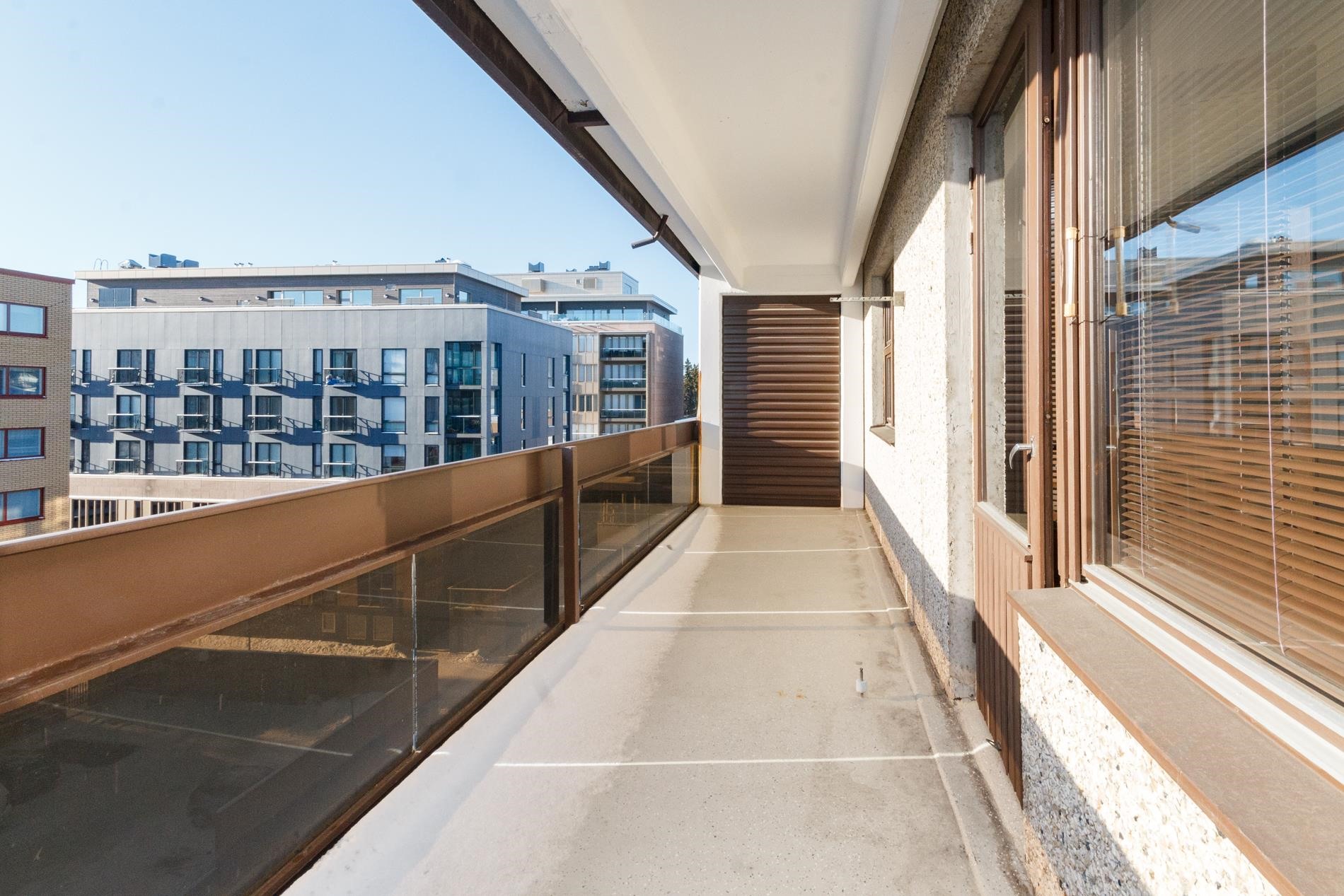 - Koko asunnon levyinen parveke, näkymä etelään päin.