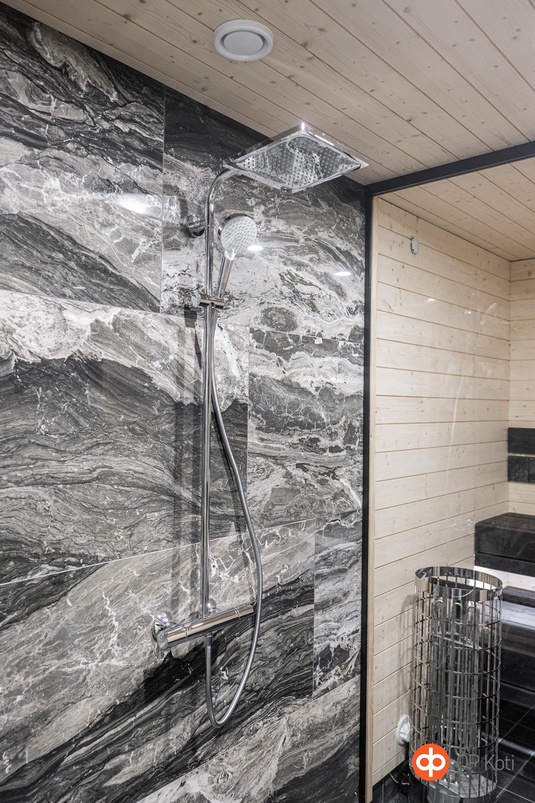 - Pesuhuoneiden lattiat ja seinät ovat laatoitettuja. Saunan seinät ja katot ovat sävytettyä vähäoksaista kuusipaneelia, jossa LED-tunnelmavalaistus. Saunassa on sähkökiuas erillisellä ohjausyksiköllä. Saunan ja pesuhuoneen erottaa lasiseinä. WC:n seinät ovat maalipintaiset, lattia on laatoitettu.