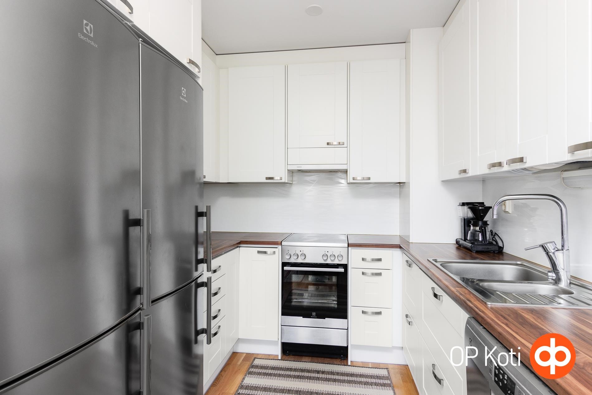 - Jääkaappipakastin x 2, keraaminen liesi, liesituuletin, mikroaaltouuni, astianpesukone, kaapistot, kiinteät valaisimet.
