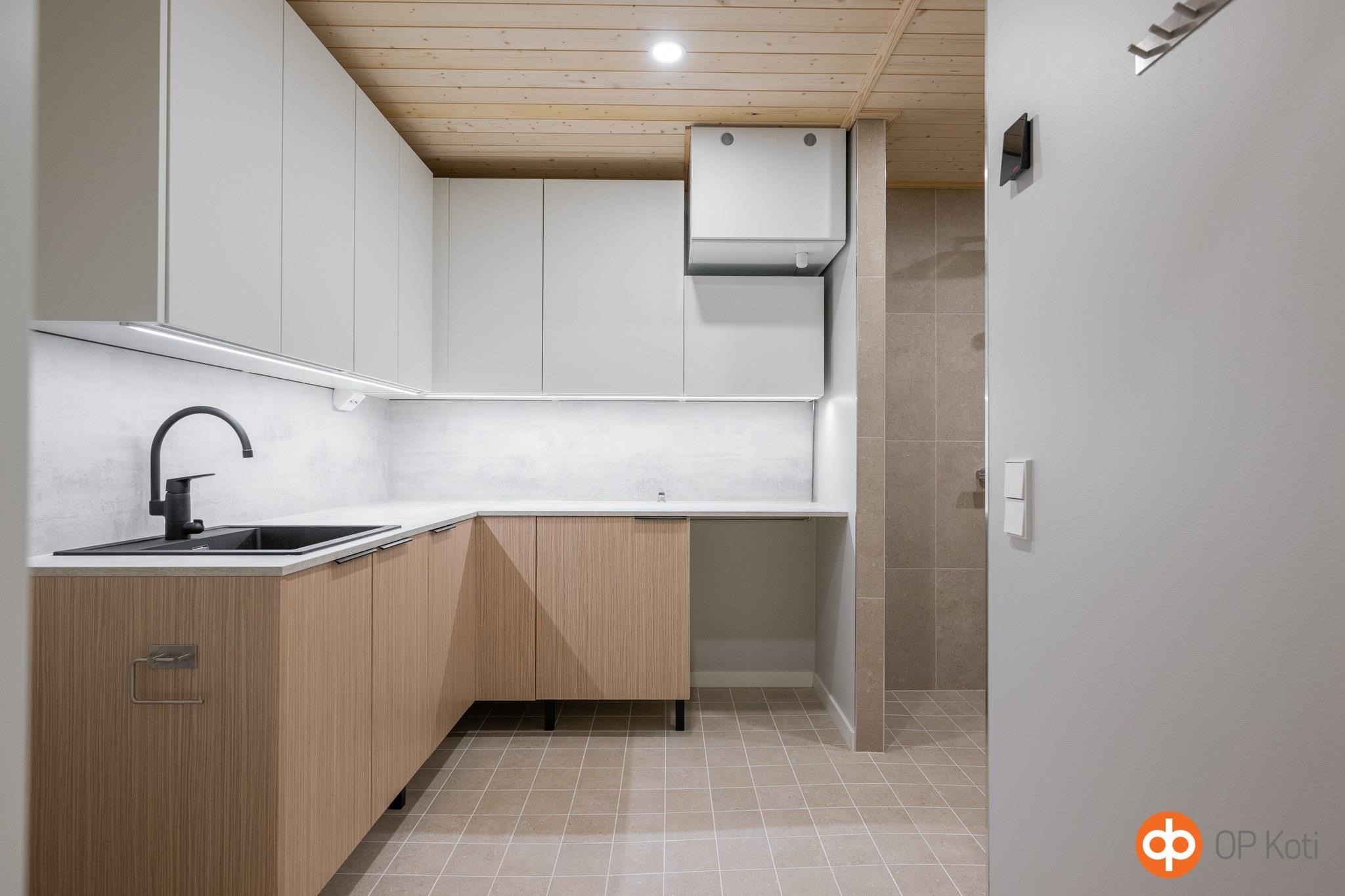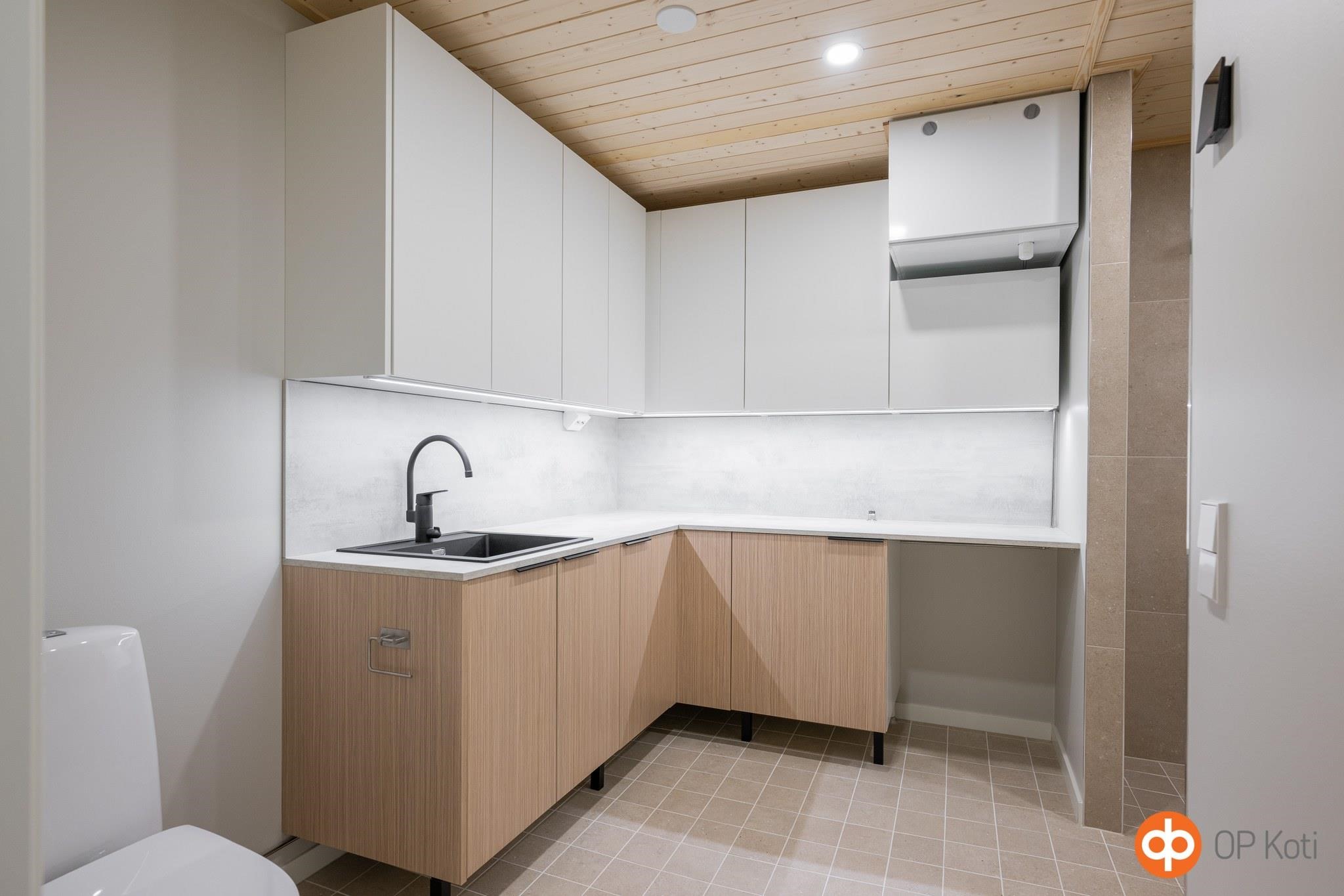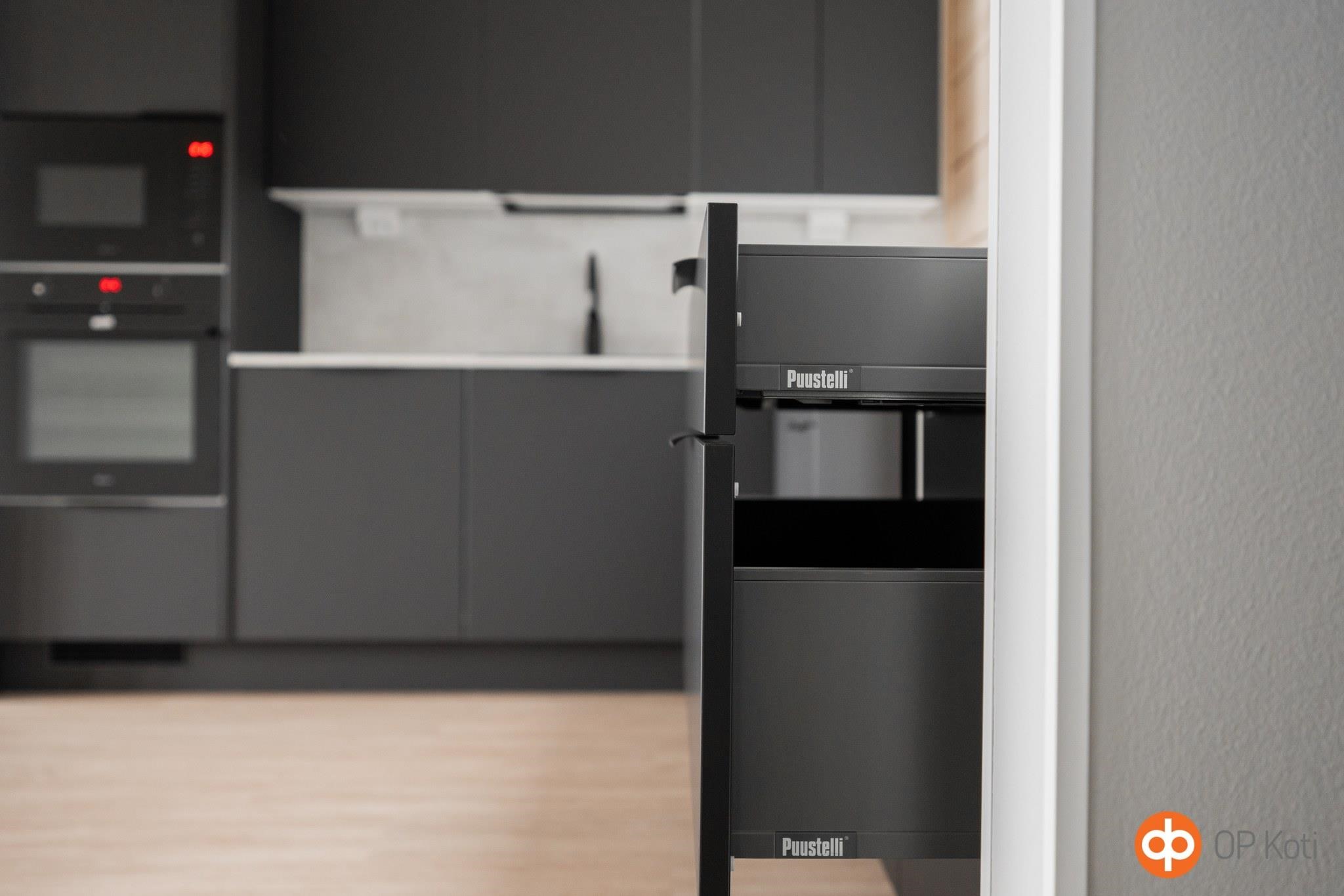 - Keittiöissä on induktiotaso liesituulettimella, erillisuuni, astianpesukone, jääviileäkaappi- ja pakastinkaappi (rosteri tai valkoinen) ja integroitu mikro. Kalusteiden ovet ovat maalattuja MDF-ovia. Keittiön ja kodinhoitohuoneen työpöytätasot laminaattipintaisia tasoja. Välitilat ovat kalustelaminaattia tai vaihtoehtoisesti laatoitettuja.